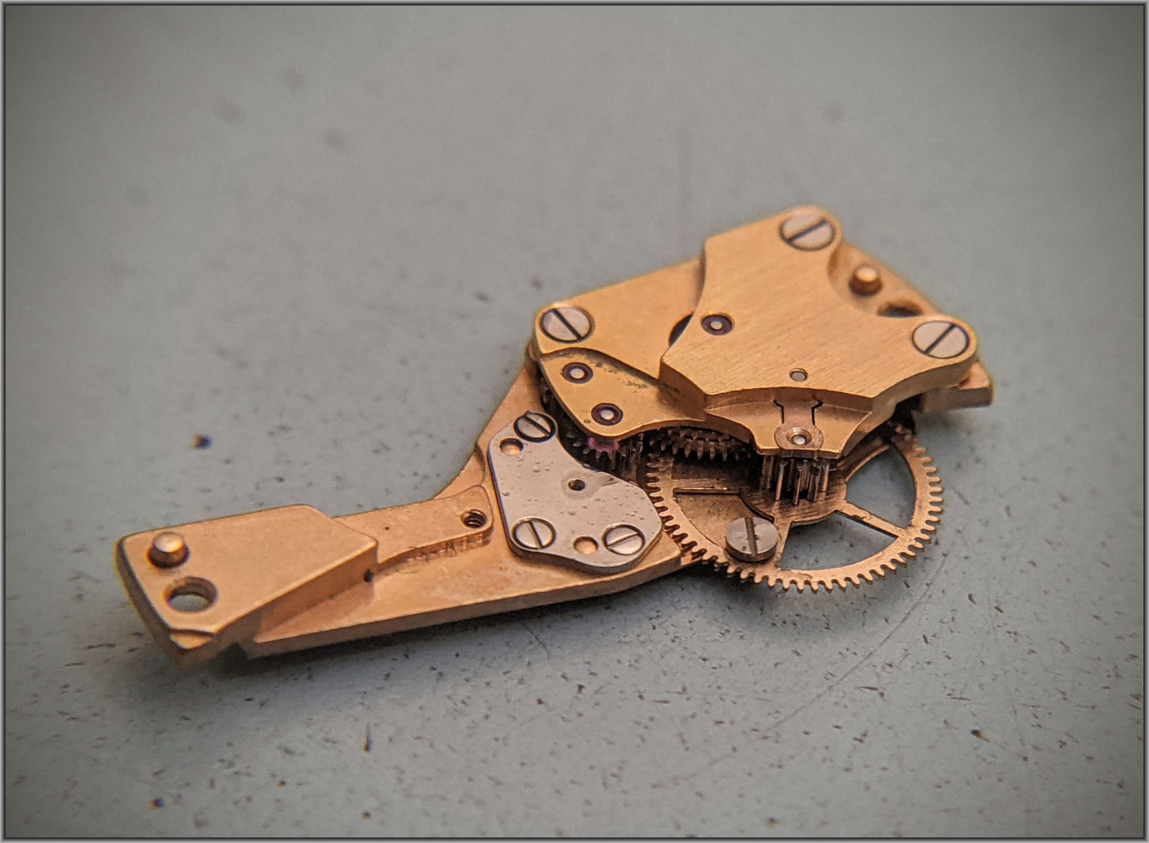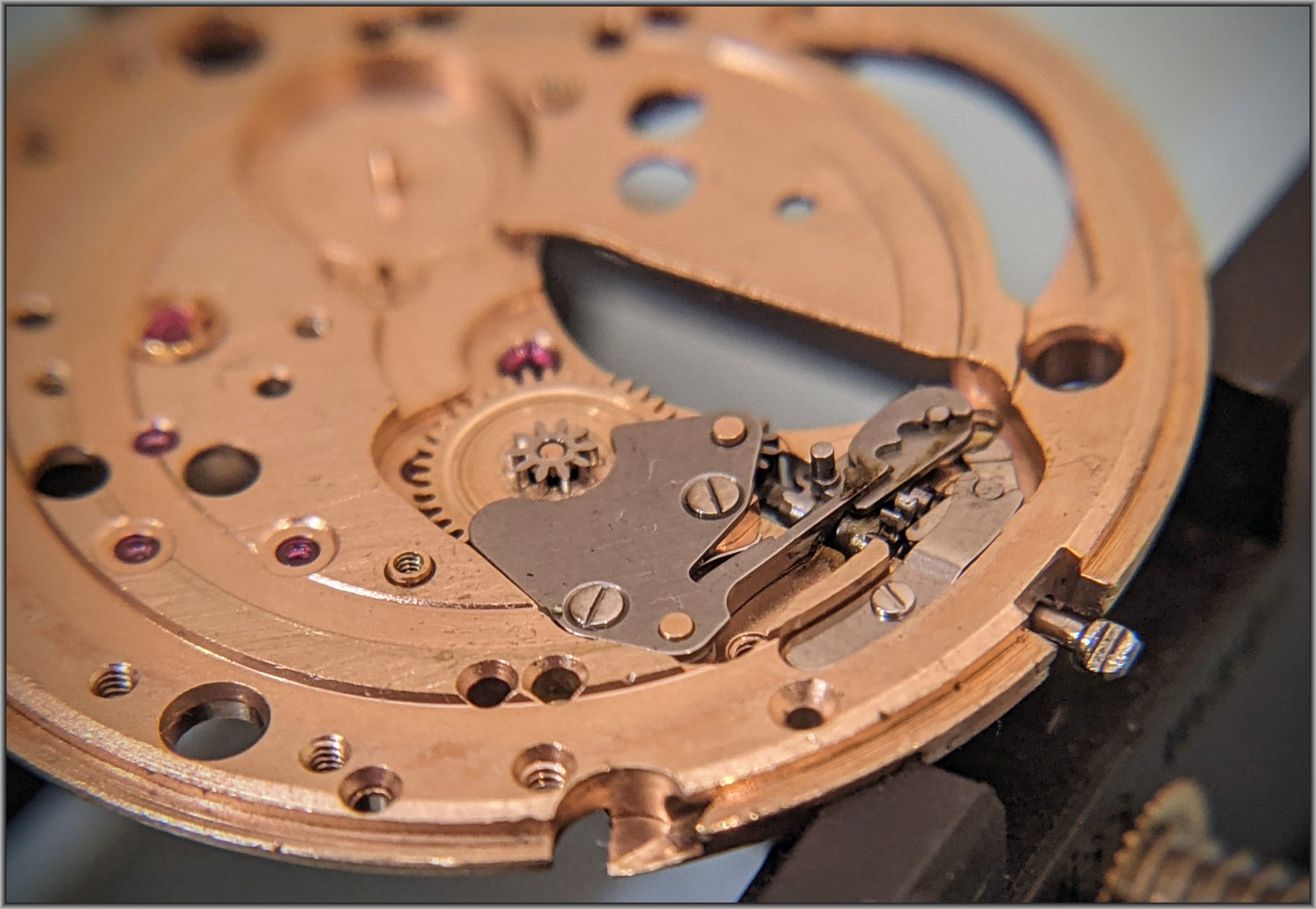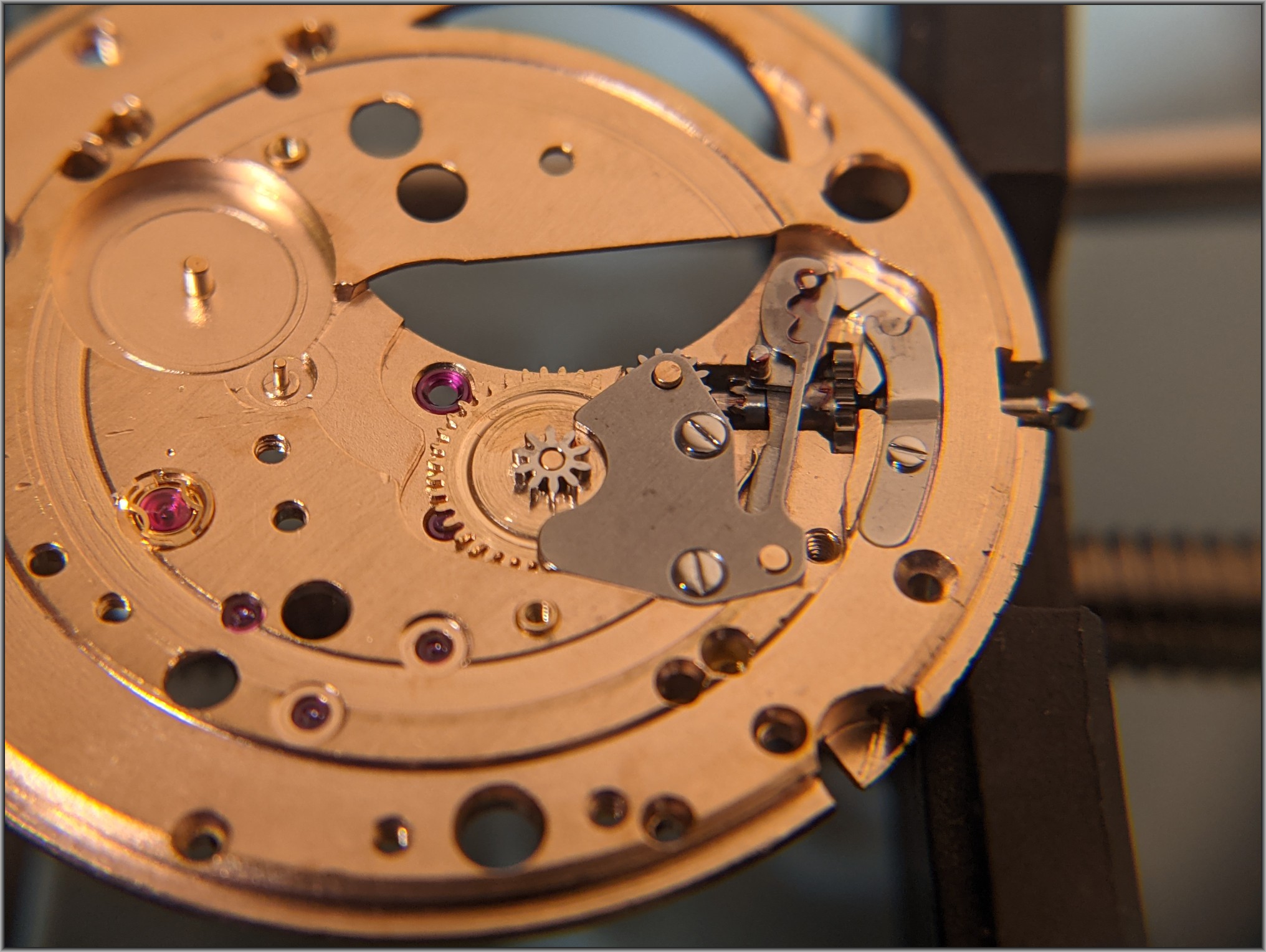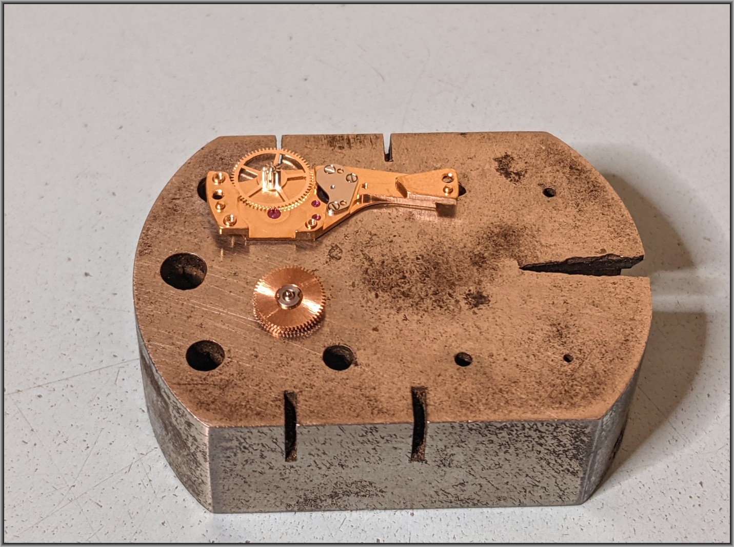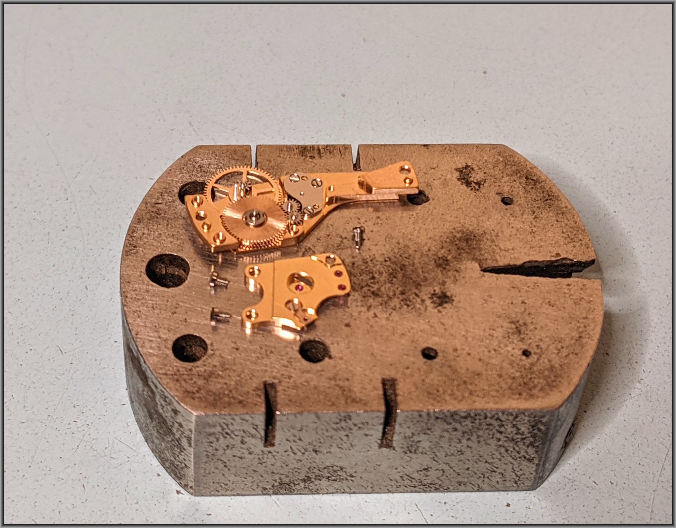 So how much damage has been done by steel pinions turning brass wheels when the brass wheel aren't going to move?... The brass leaves are tiny, & no match for the steel pinions of the automatic winding mechanism. Damage done, let's see how bad.