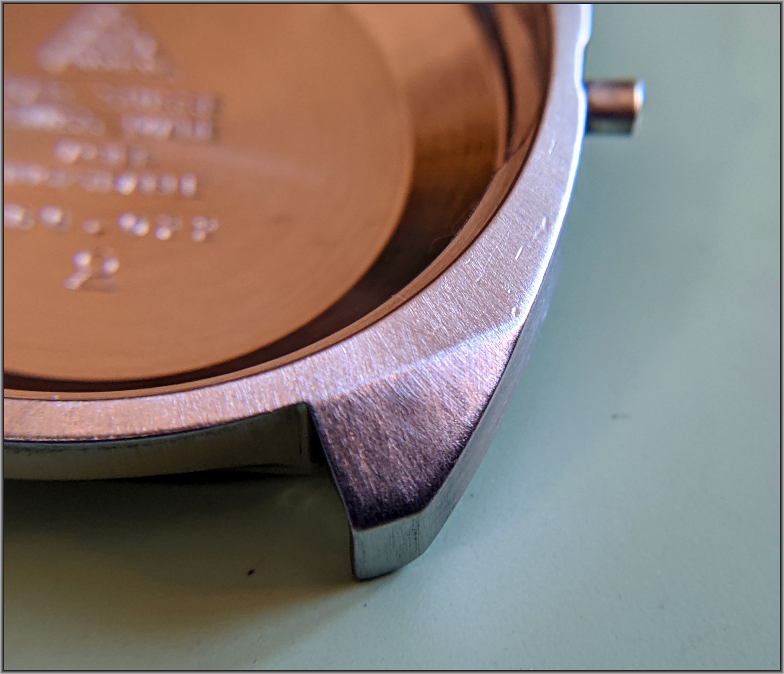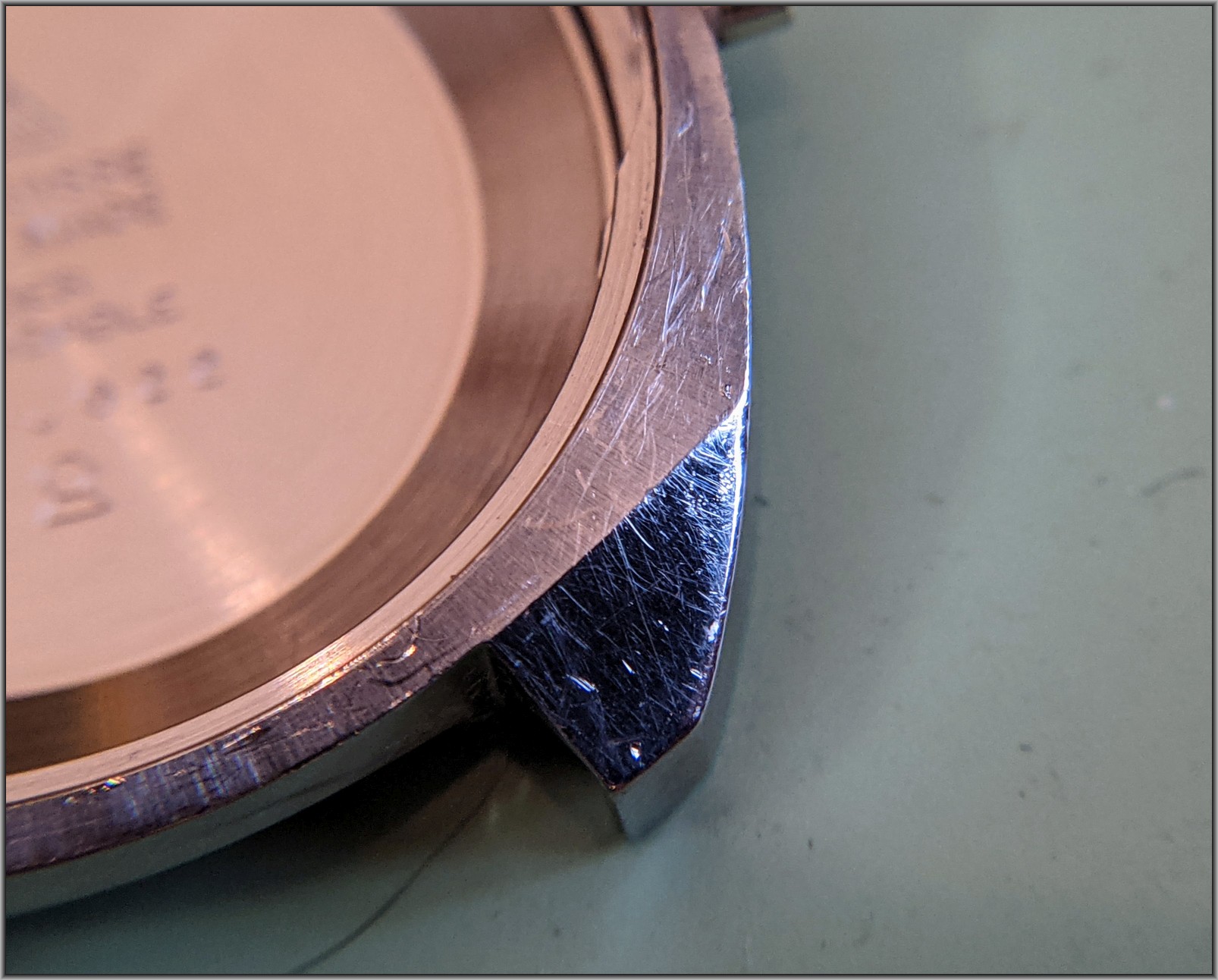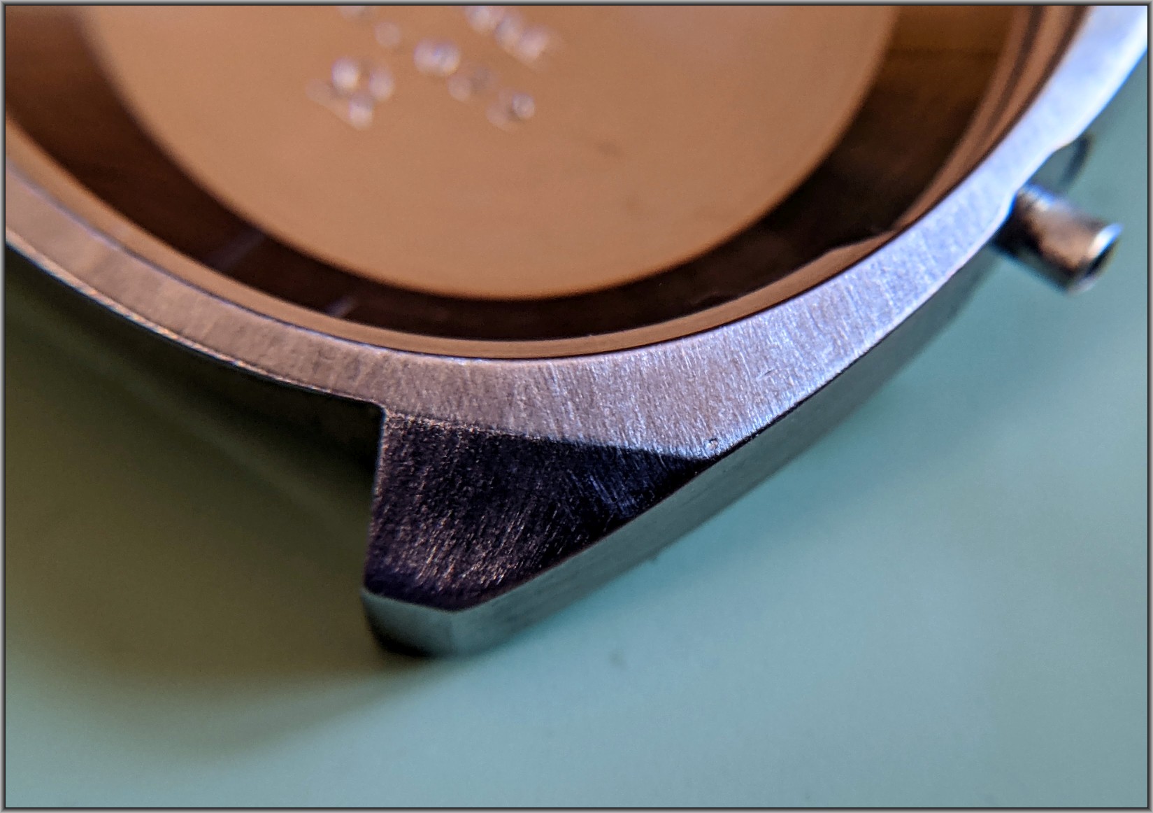 Now on to the case. Heavy scratches throughout. If you look close, can see what looks like the radially striped graining on the top surface from the original factory finish. Pretty well obscured now by a lifetime of battle scars.