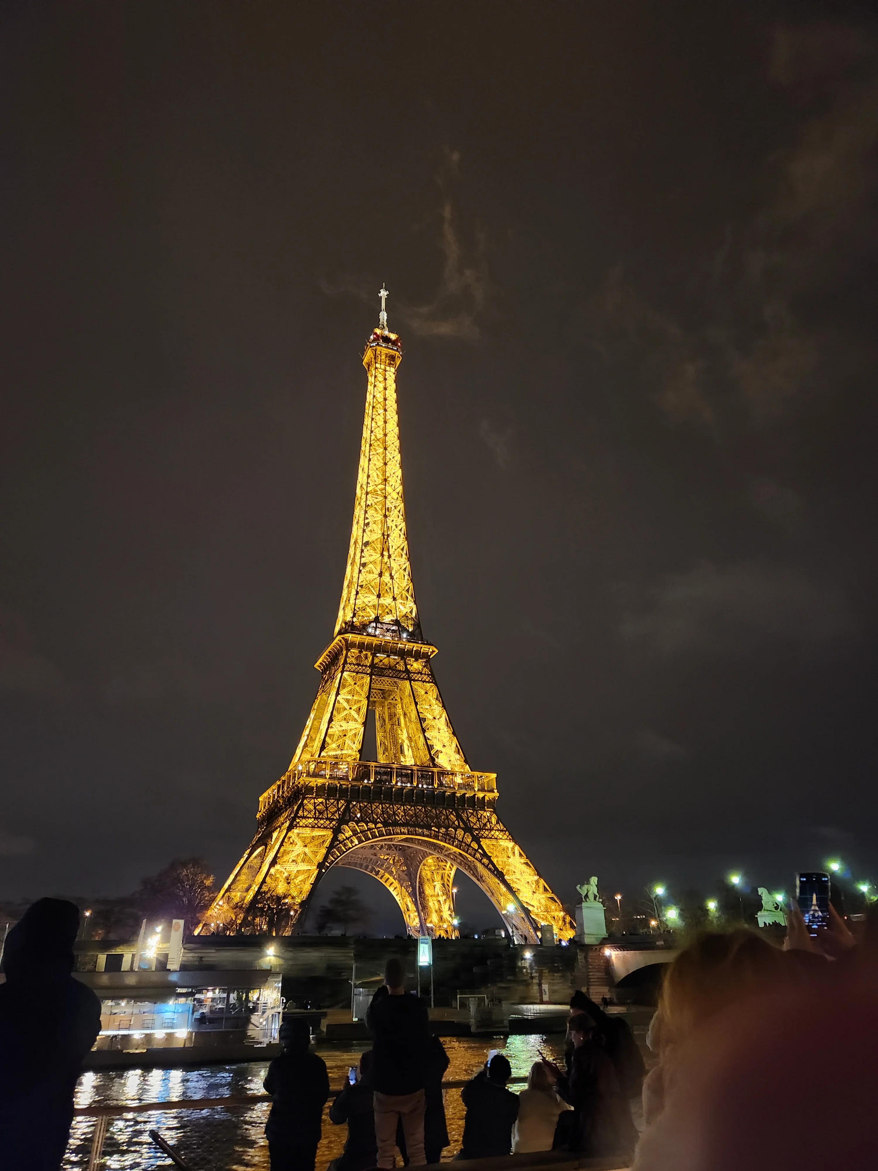 We finished late last night with a river cruise on the Seine. Here's the Eiffel Tower lit up: