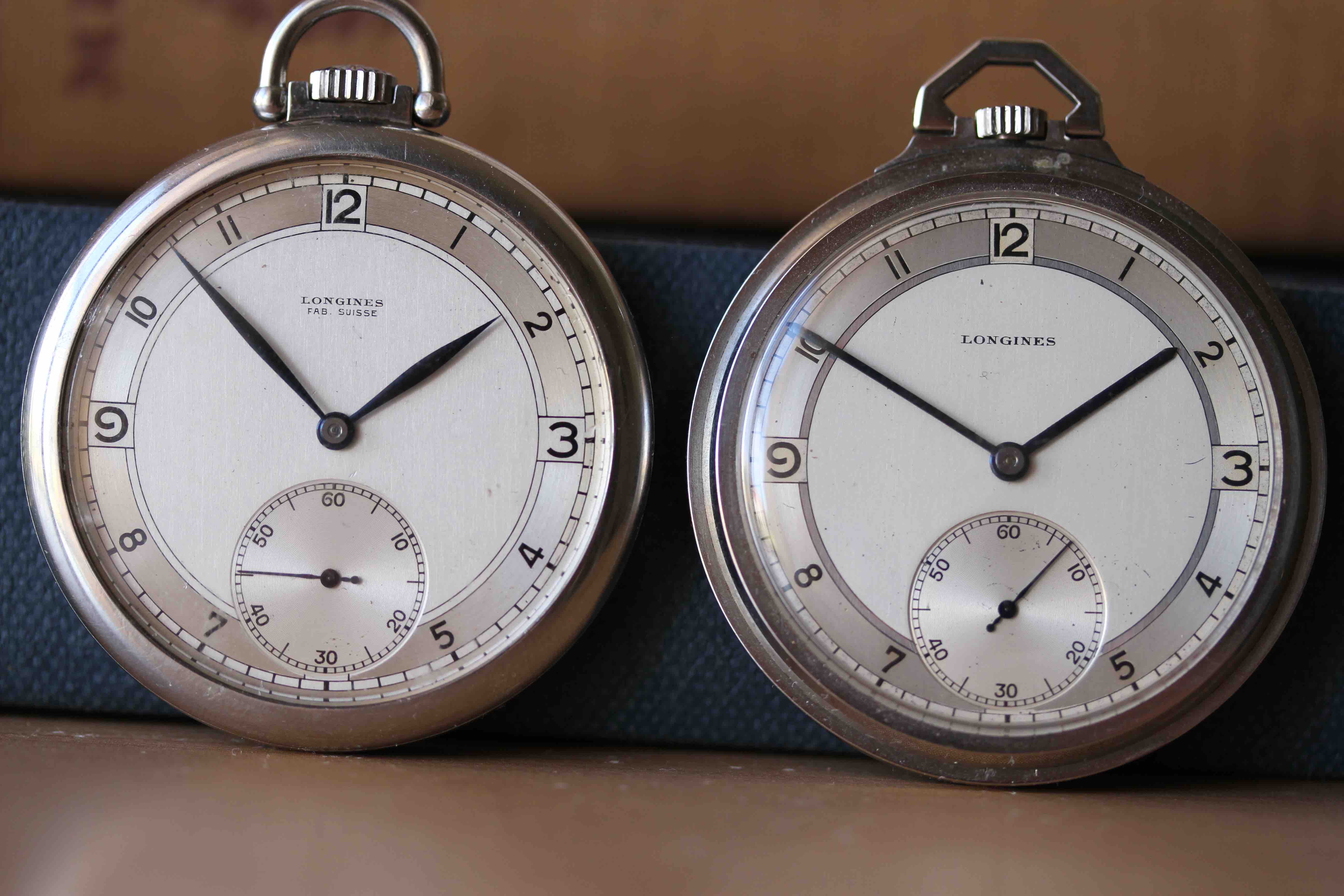 Below are two pocket watches with identical dials and hands, but different cases, crowns, and movements!