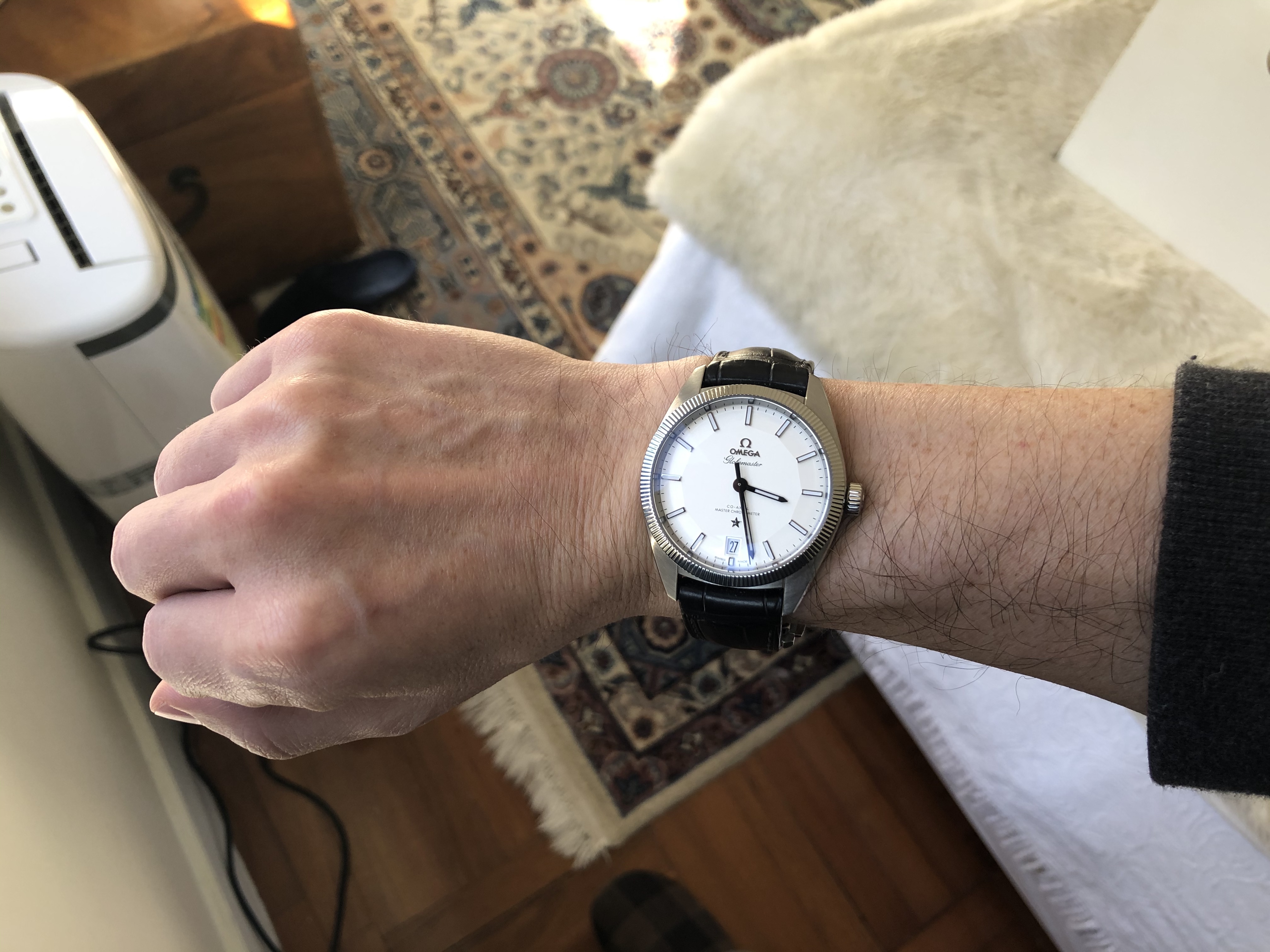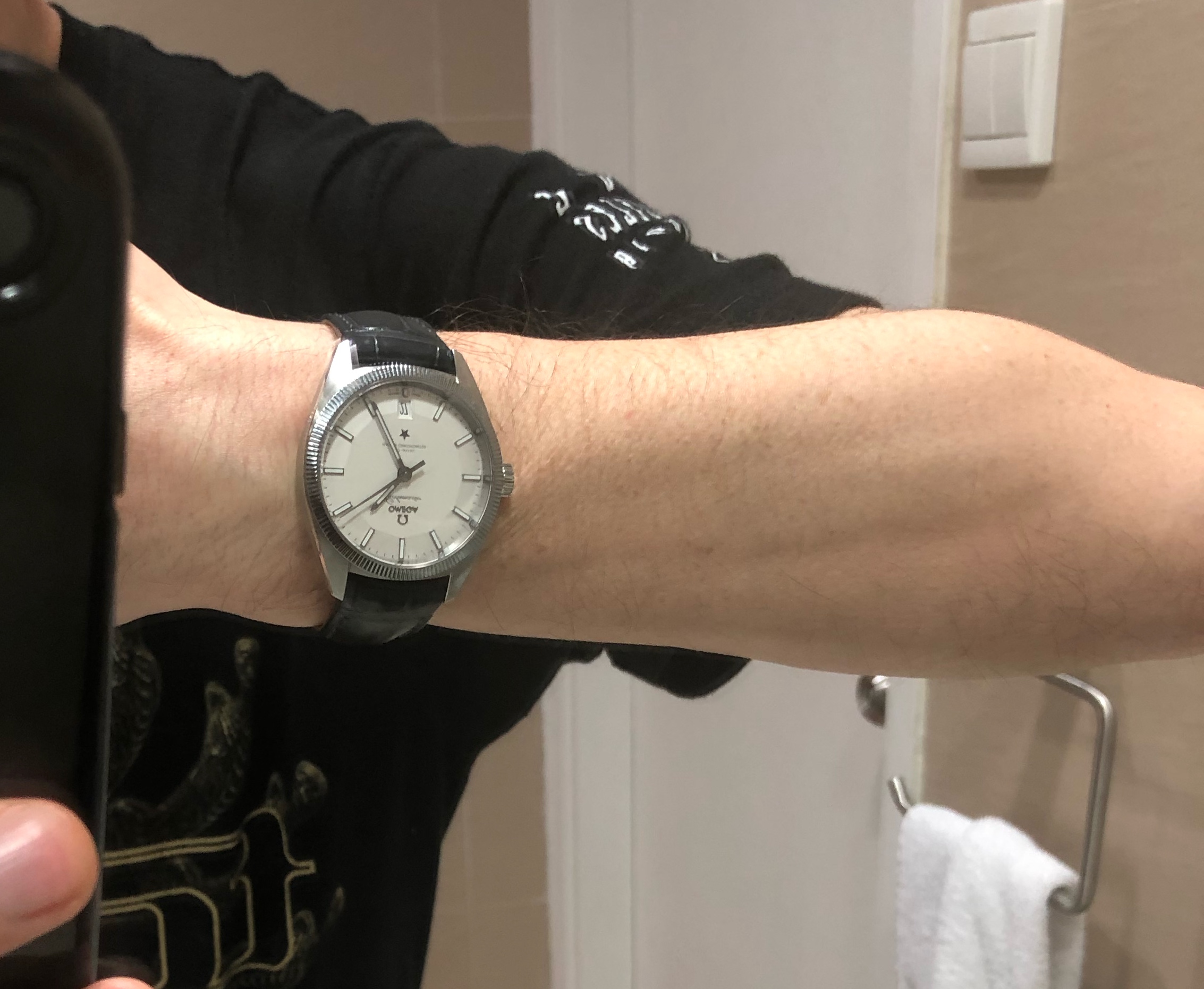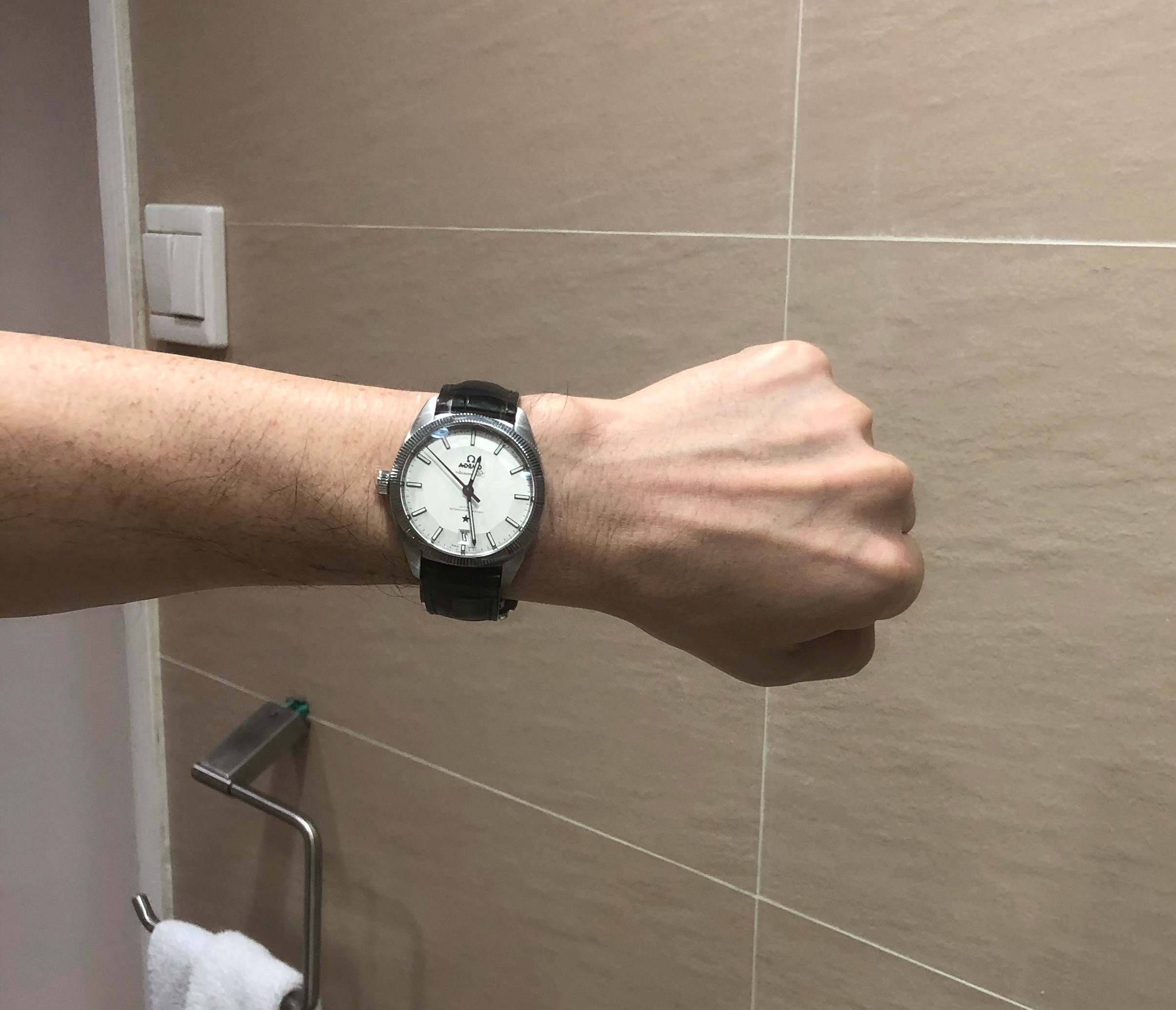 Also, a shout out to the Omega boutique in Hong Kong on Russel St in Causeway Bay. I took the GM on the leather strap in there and asked if they could punch an extra hole in the strap as the smallest fitting was too loose, that they happily did it free of charge. Did a perfect job. The strap it came with flares out to match the gentle curve of the case, and can’t be folded down, so it always jutted out, not only wearing too big for me, but also made my wrist look even thinner and the watch larger. After the hole was punched it looks and wears much better. Maybe it’s frowned upon to punch a hole in an expensive strap, but I’m much happier for it.
