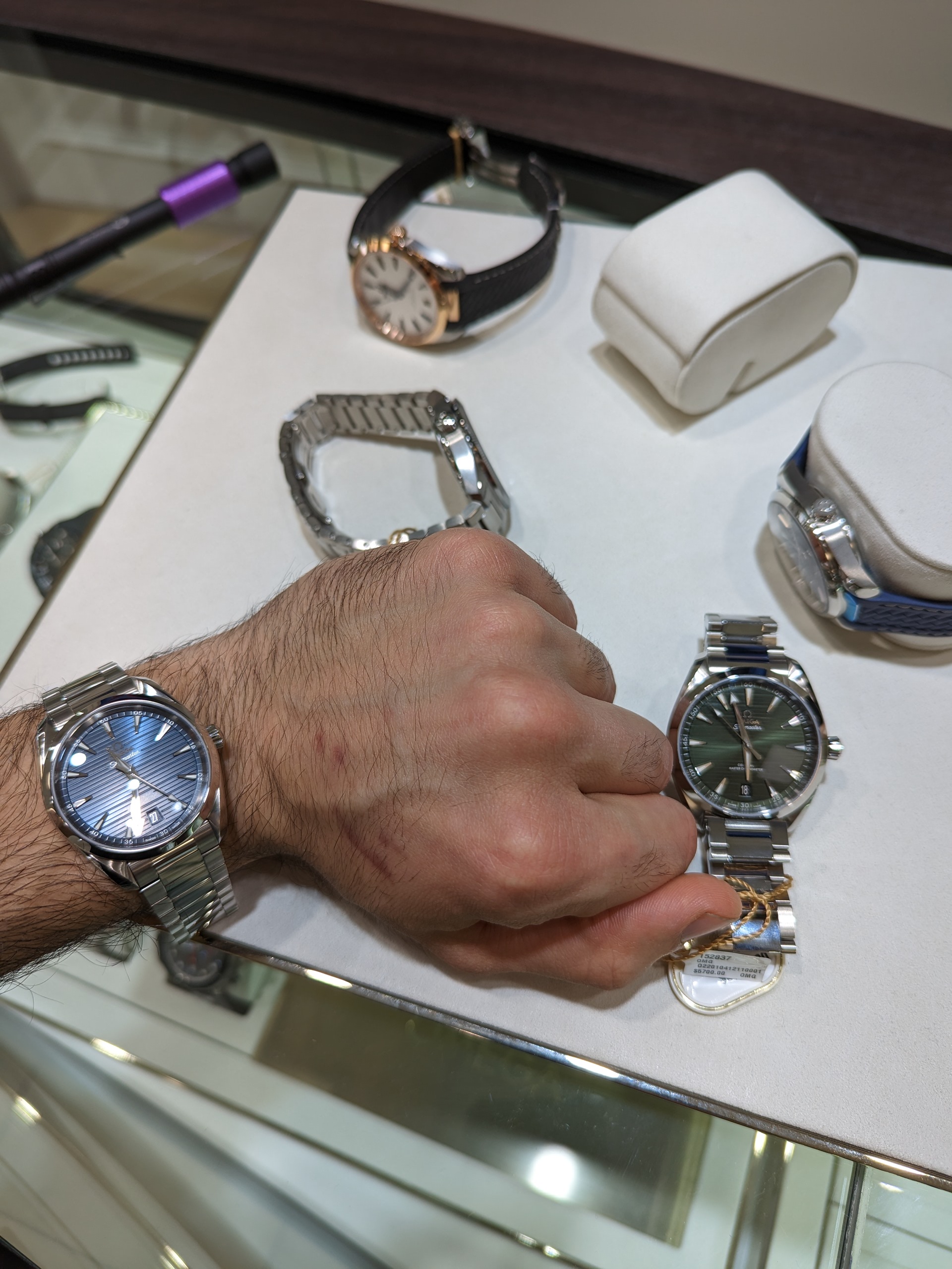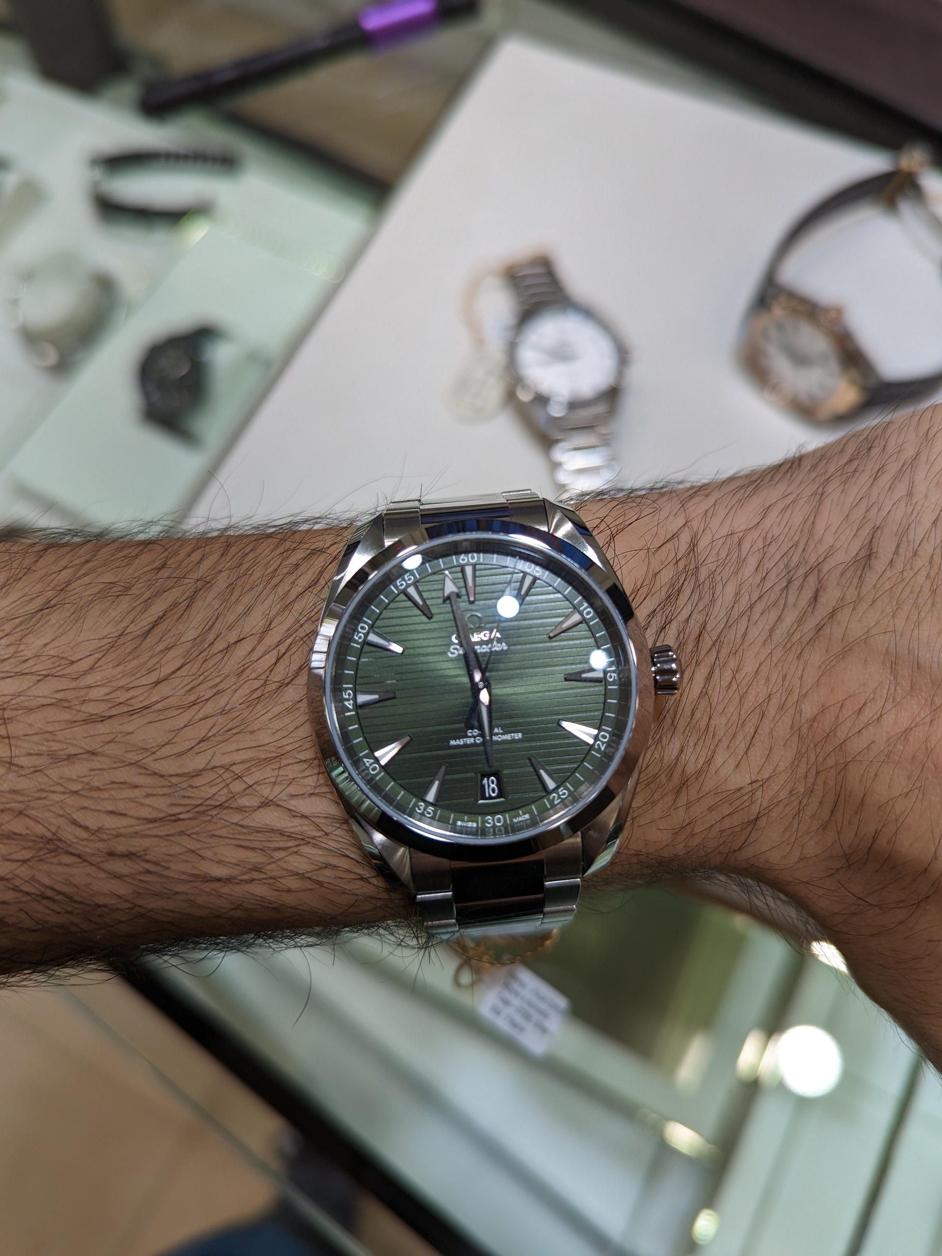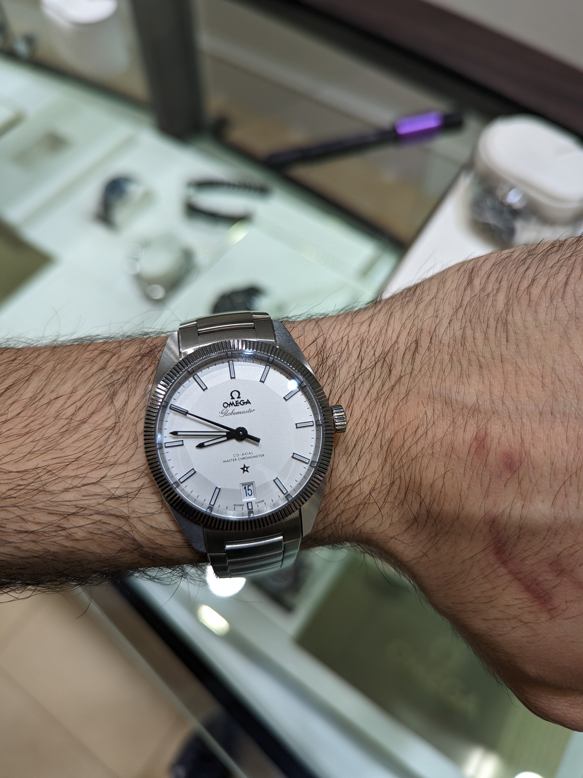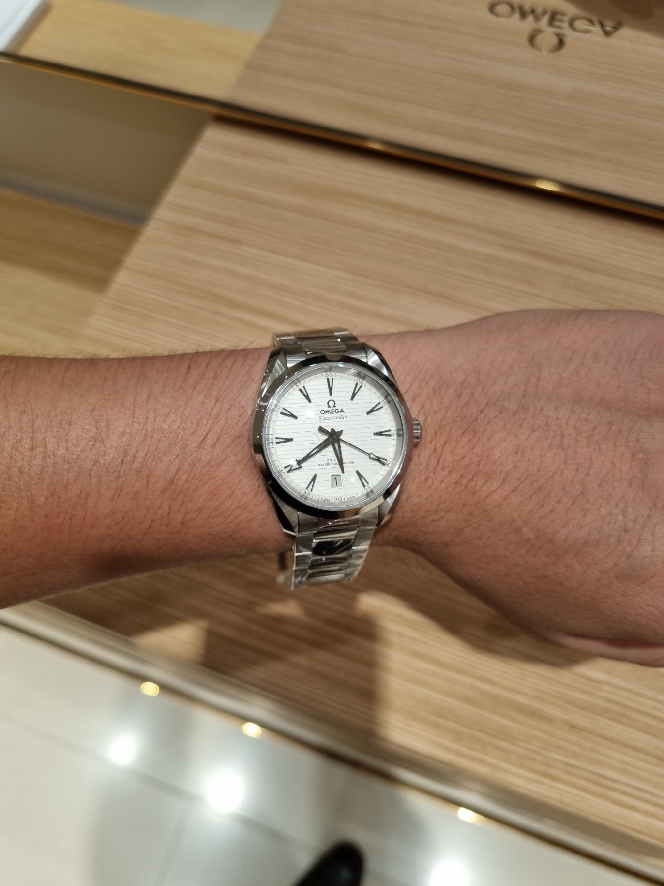 Also, a shout out to the Omega boutique in Hong Kong on Russel St in Causeway Bay. I took the GM on the leather strap in there and asked if they could punch an extra hole in the strap as the smallest fitting was too loose, that they happily did it free of charge. Did a perfect job. The strap it came with flares out to match the gentle curve of the case, and can’t be folded down, so it always jutted out, not only wearing too big for me, but also made my wrist look even thinner and the watch larger. After the hole was punched it looks and wears much better. Maybe it’s frowned upon to punch a hole in an expensive strap, but I’m much happier for it.