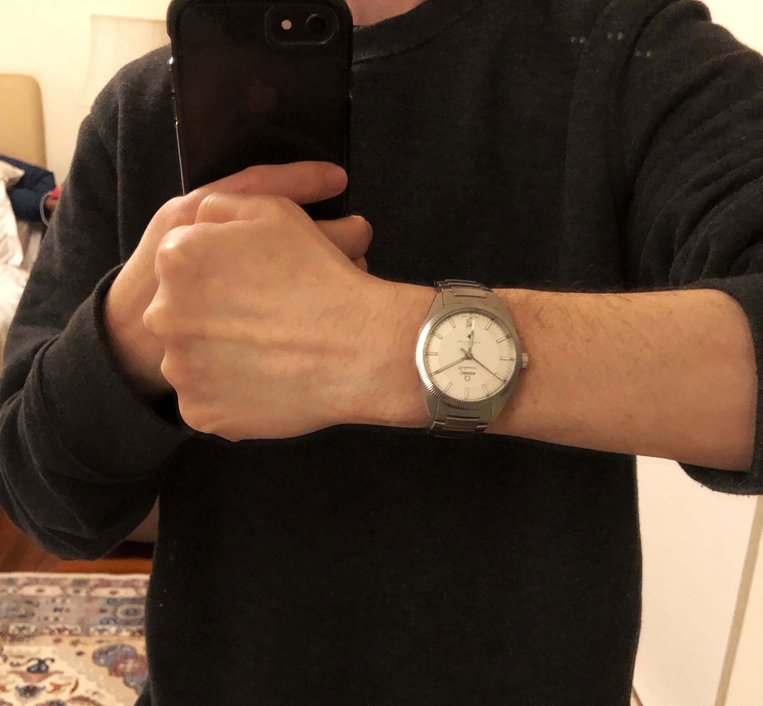 I’ve come across a few questions on social media from people with smaller wrists considering it, but were asking about how the size wears. My wrist fluctuates between 6 - 6.25 inches, and thought I’d add my experience and photos here for anyone interested. Not the best photos, but I there more for size reference relative to a smaller wrist in different light both photographing straight on and via reflection. I noticed that the iPhone has a slight fish eye effect where the straight on shots have the lugs reaching the edges of my wrist, but in reality the the lugs are slightly shorter. The mirror photos show this.