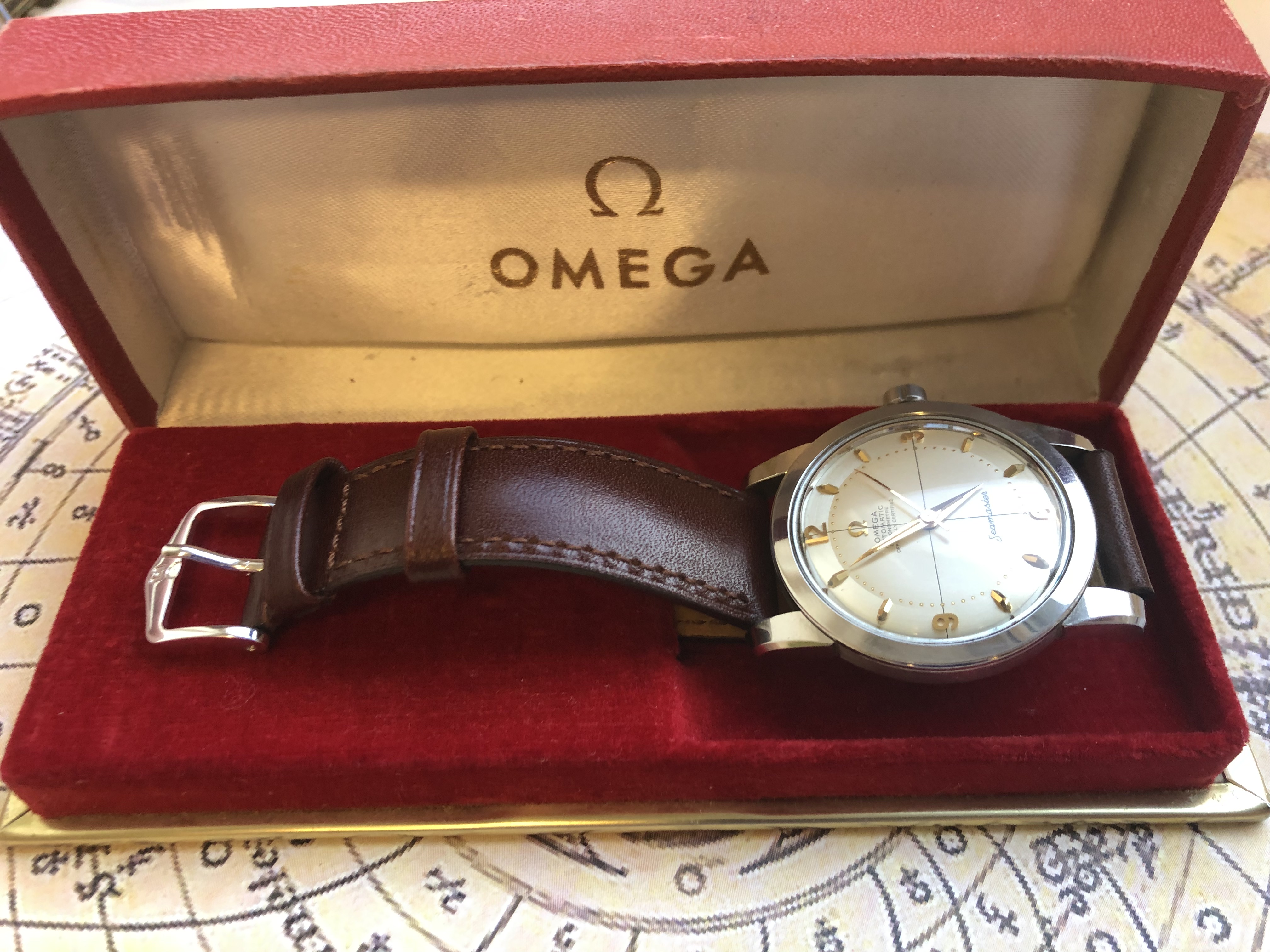 Fast forward one year and I managed to purchase the following Seamaster 2577 Chronometre from the grandson of the original owner. He was offering it on a local auction site describing it merely as "Omega Seamaster Automatik". When I saw the pictures I immediately knew I was onto something big. When I picked it up, I was surprised to even find it in the original box, which was not part of the deal description.