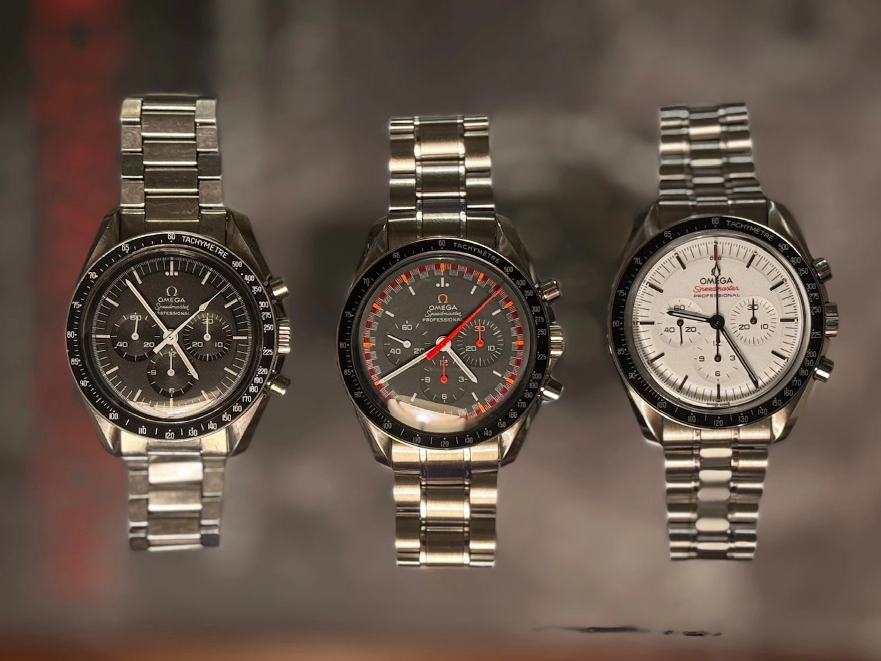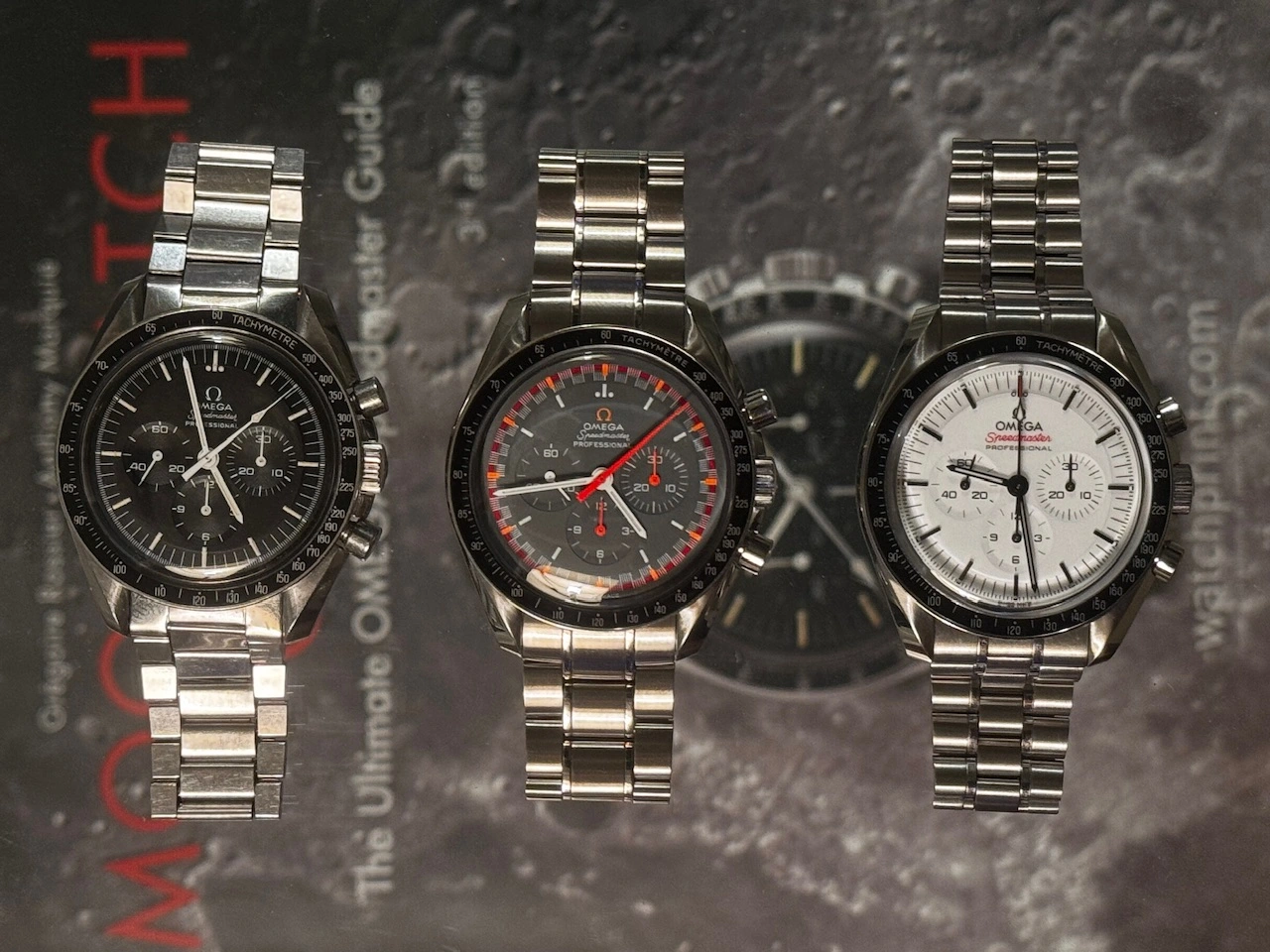 I set my three Speedmasters on a middle shelf with a copy of MWO on the lower shelf. Then I placed the camera on the top shelf.