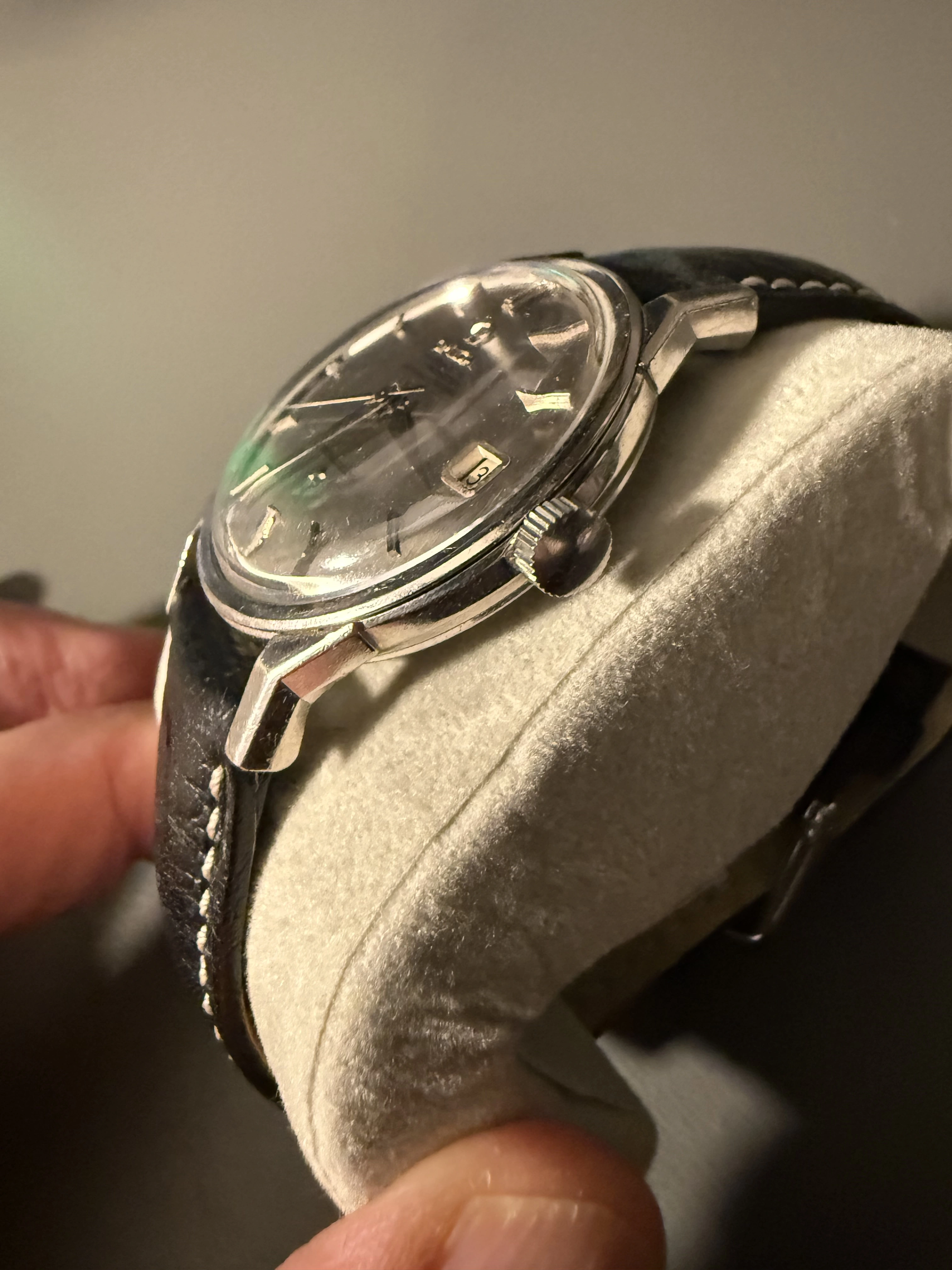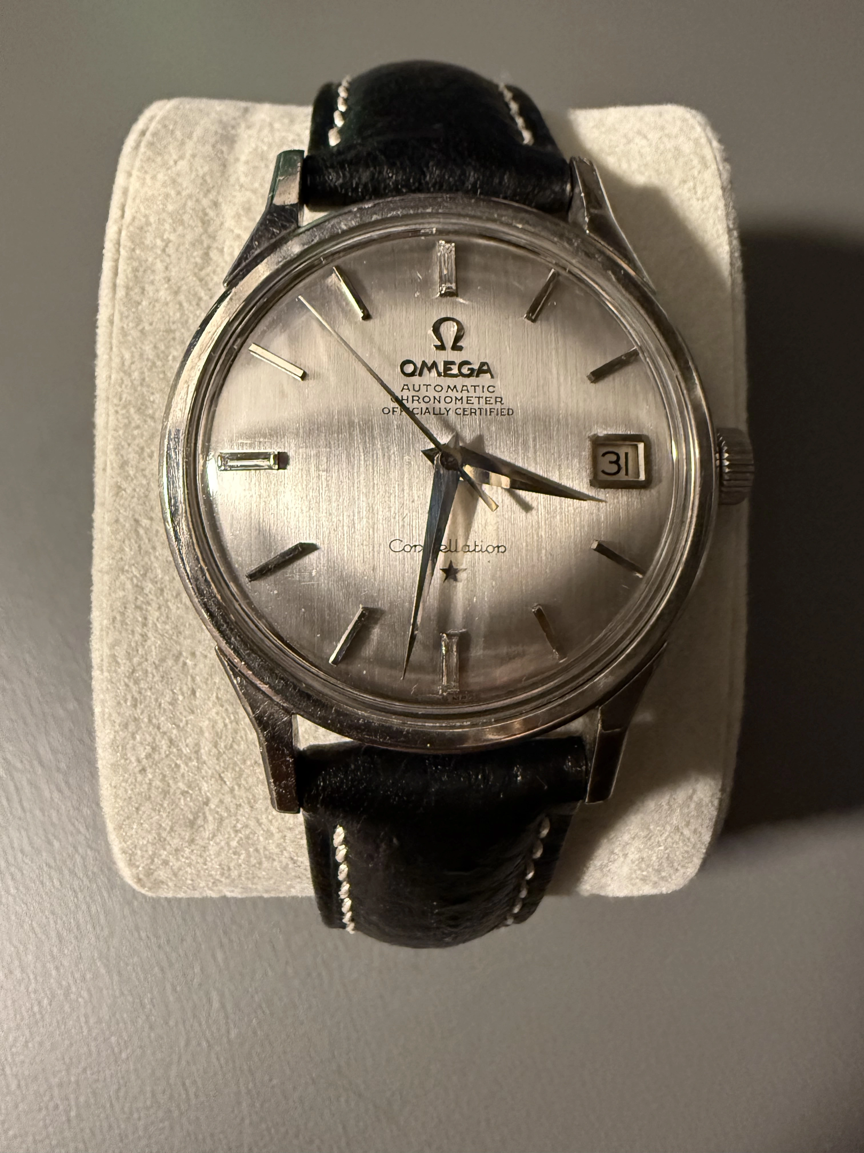 ·Greetings all - am new to this forum and vintage watches thanks to this watch I inherited. It's a white gold Constellation with confirmed white gold dome dial. Dial has baguette cut diamonds at 12, 6 &9. Caliber is 561 and ref is 168.005/6. Based on serial number it dates from 1966. I've been told that this is pretty rare given that it's white gold and has the diamond markers. Downsides are that the case has a couple of deep scratches, the crown and crystal are generic replacements, and the original band is MIA. I'd love to have your thoughts about whether this is indeed somewhat rare and, regardless, a general ballpark about its value (i.e., should I be scared to wear it as one of my regular watches)?