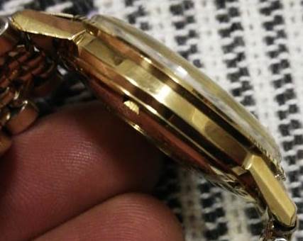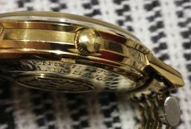 Case and crown - In 18ct gold and good condition. A bit of wear on the bezel and maybe some rounding on the ends of lugs.