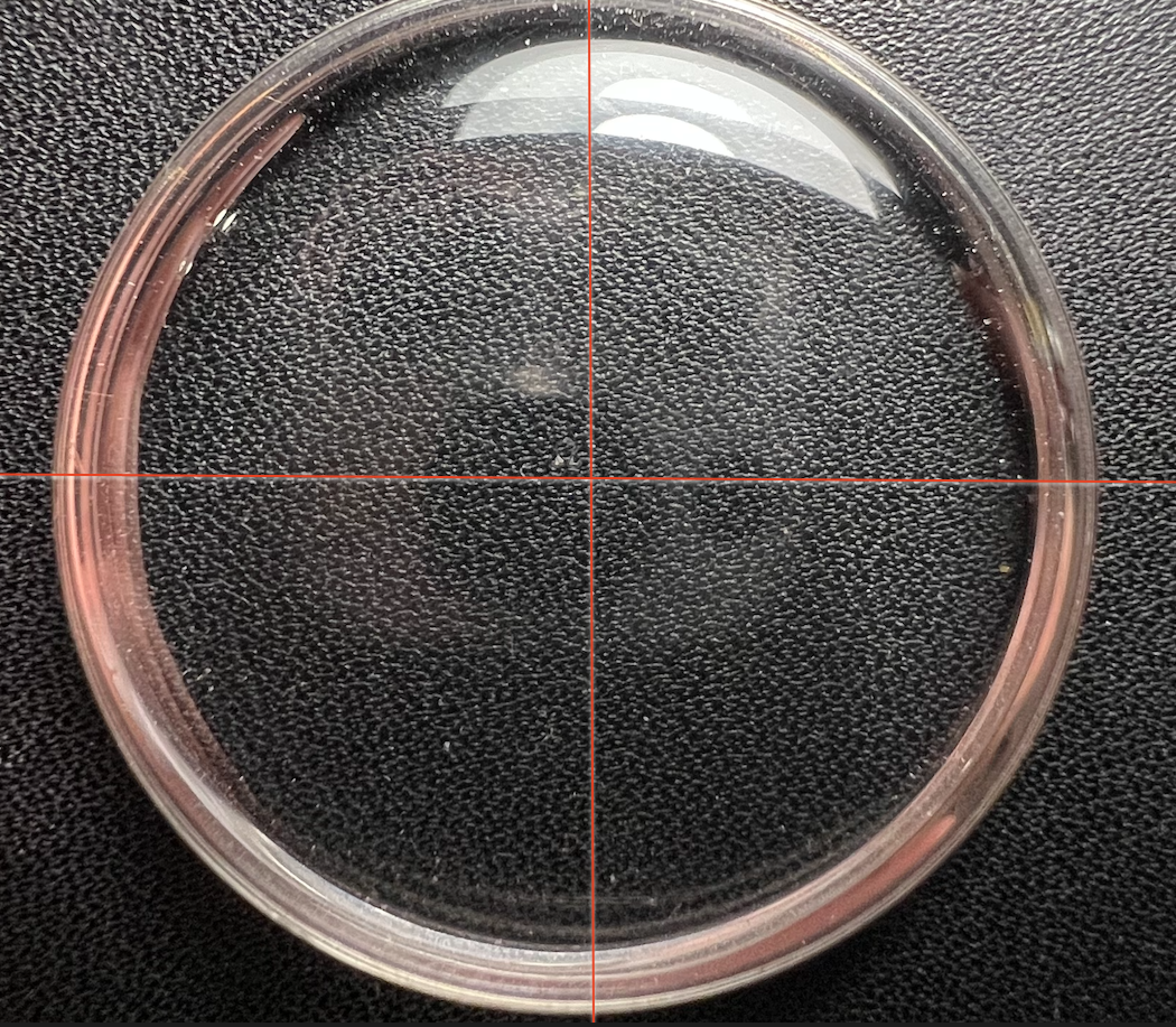Than I noticed that the logo is nearly 2mm up and nearly 2mm left of where it should be, when you overlay this crystal on a dial it's more apparent, but I tried to draw the red lines to reflect how it appeared on an actual dial