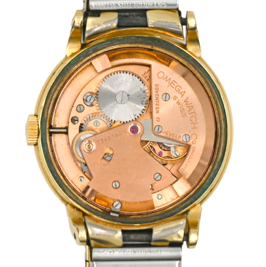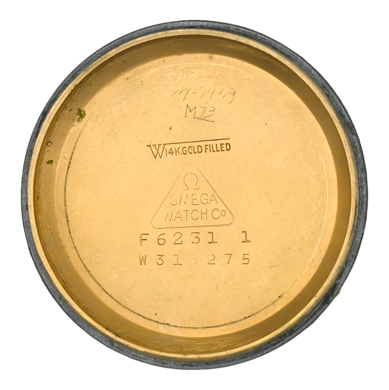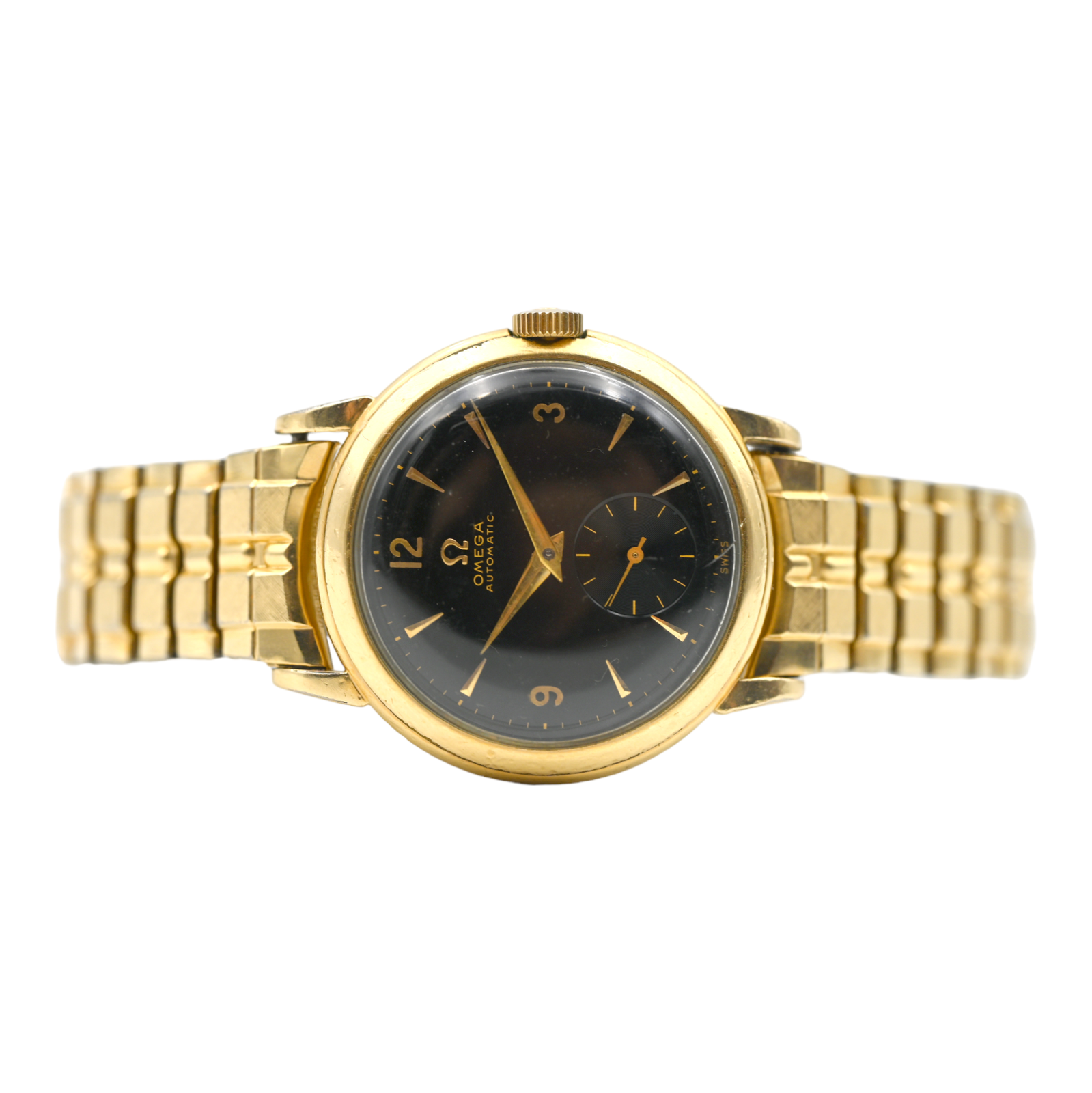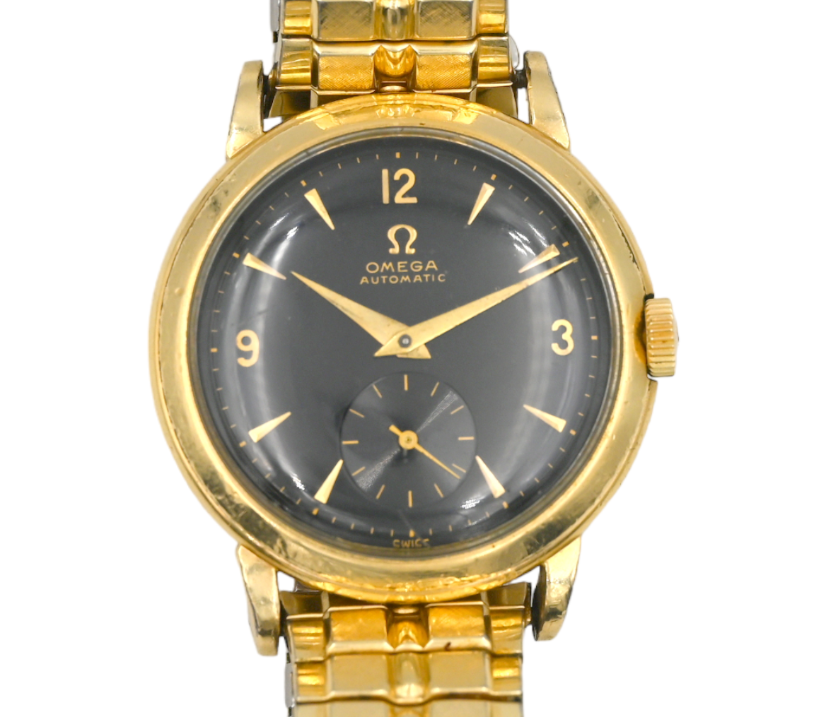 Description: Offering a vintage Omega wristwatch featuring a black dial with gold tone hands, gold arrow, and Aribac hour indices with a subsidiary seconds dial. The 14k yellow gold filled case houses a 17 jewel caliber 344 Omega bumper automatic movement and the serial number dates the watch to circa 1952. Included with the watch is a vintage gold filled Speidel stretch bracelet.