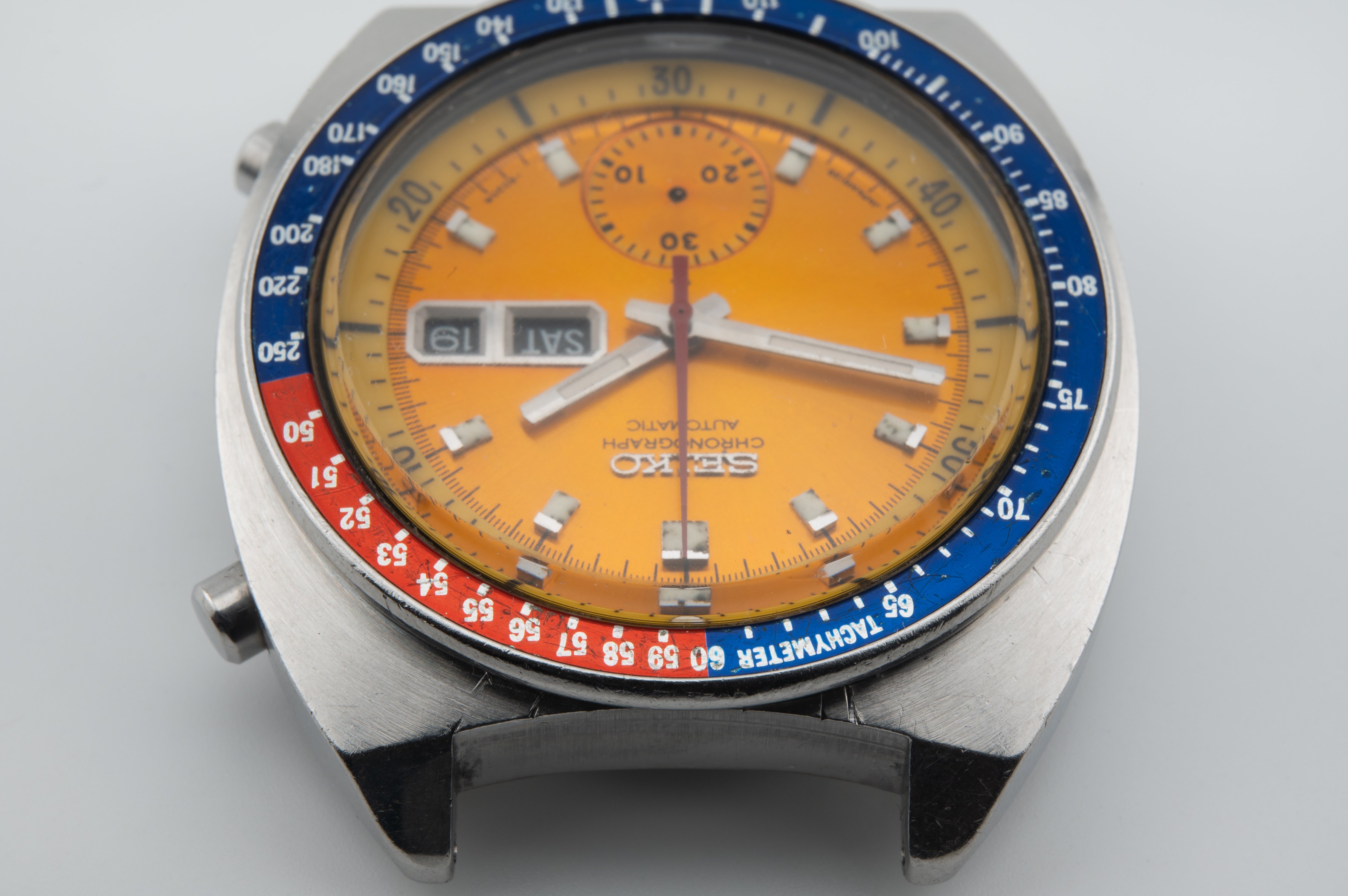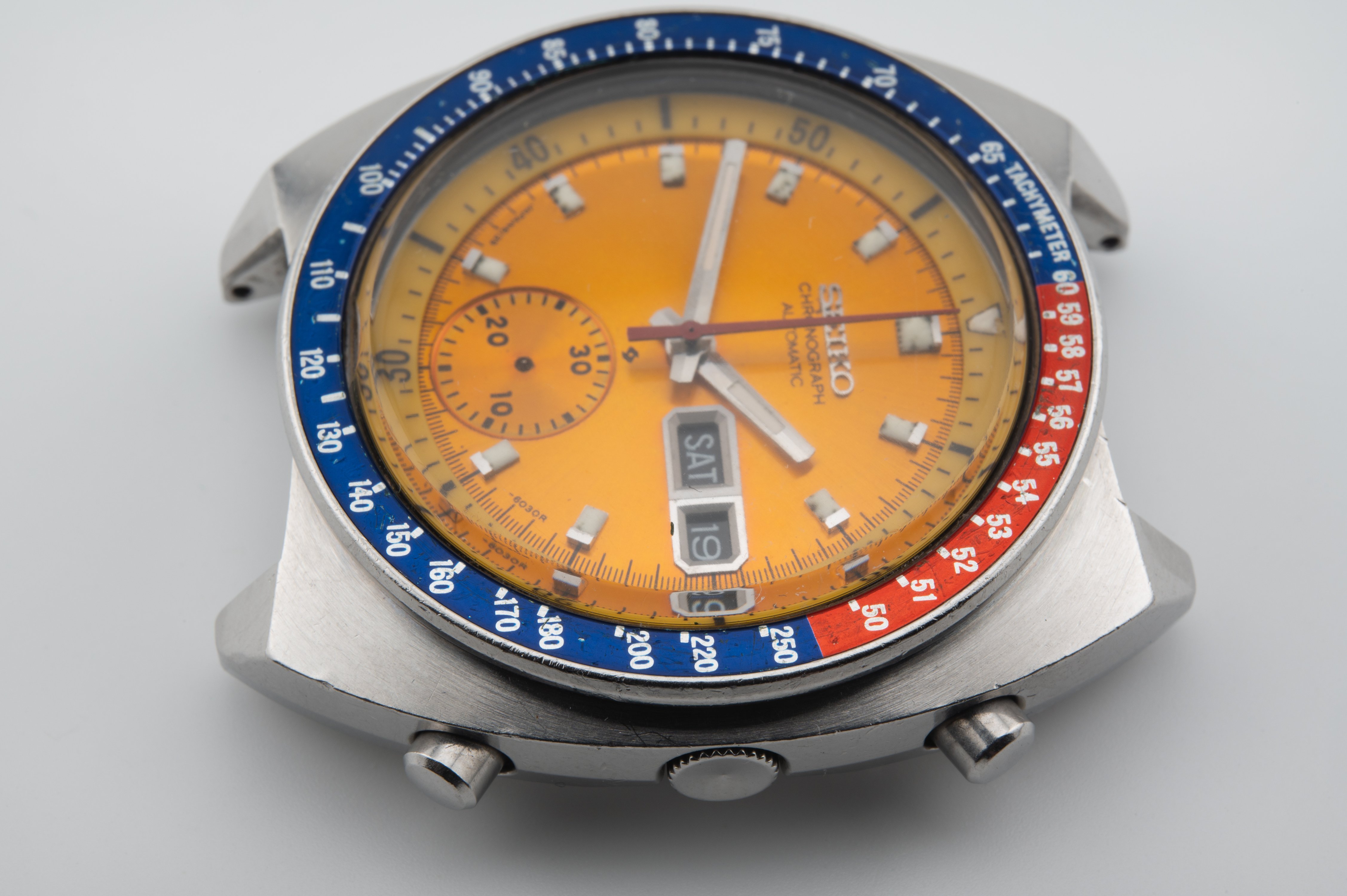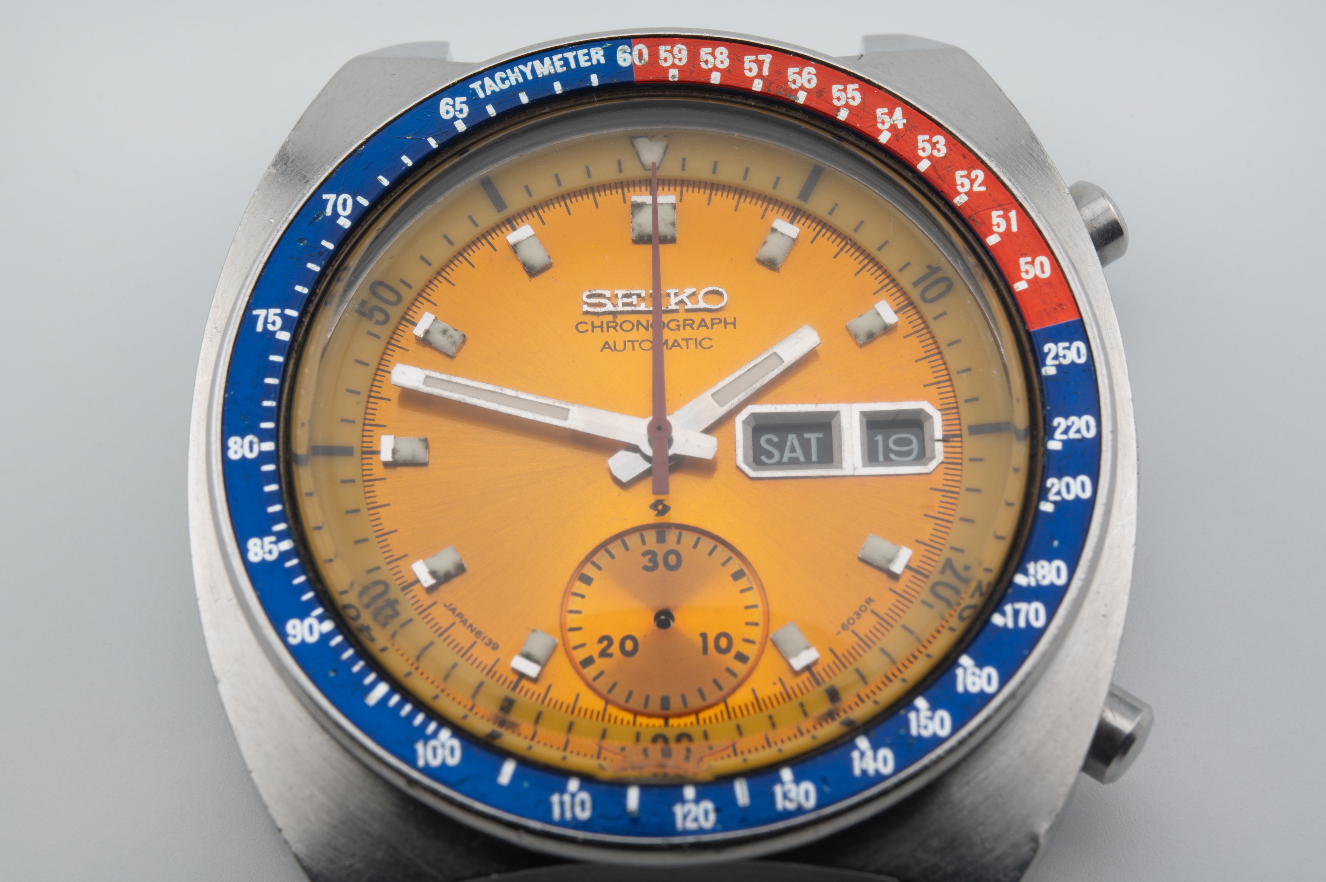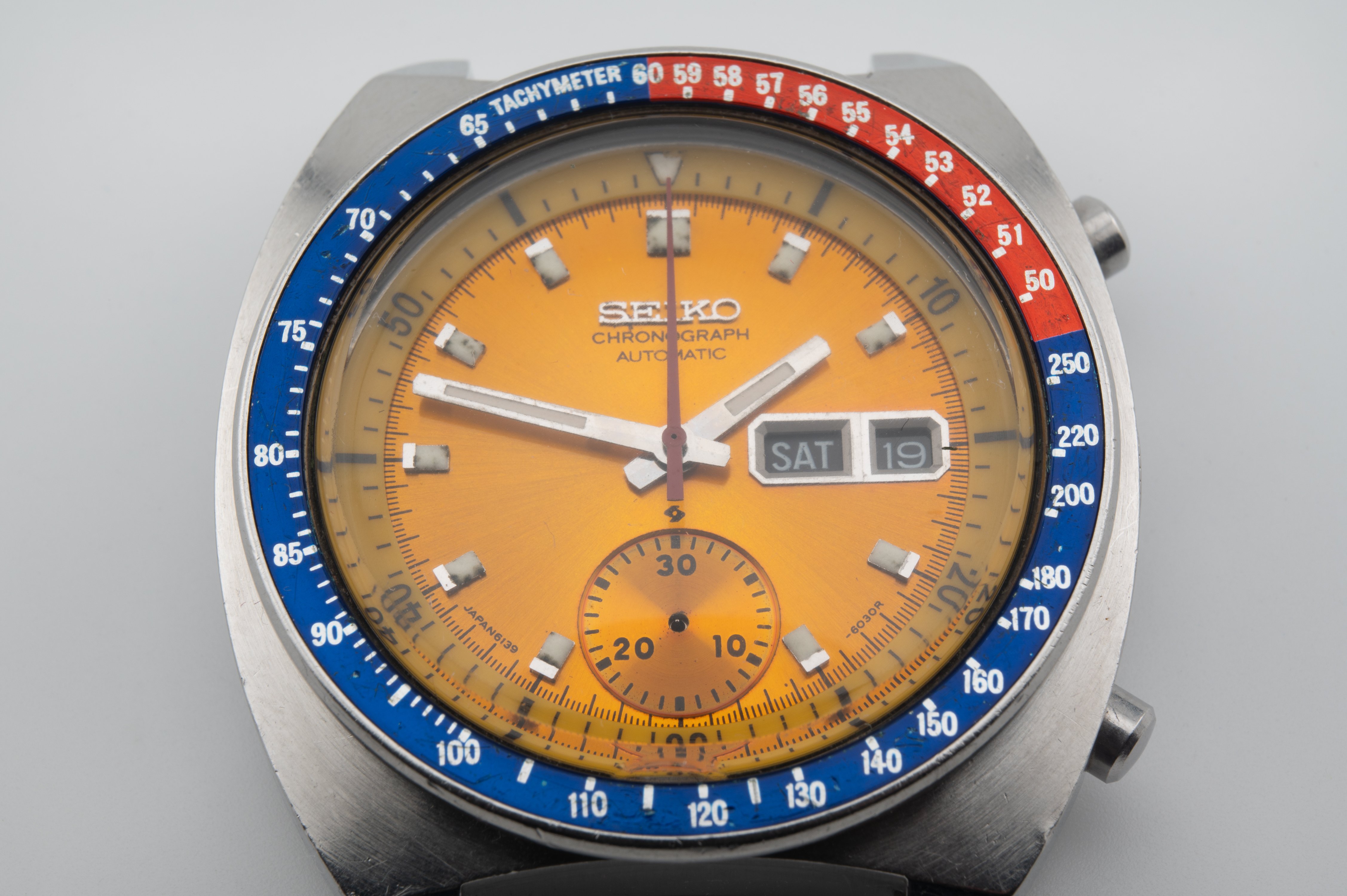 A 6030R variant with both "Chronograph" and "Automatic" below the Seiko logo. The "Japan 6139" spacing seems correct. Sub dial has no concentric rings and the text seems consistent with original models I've seen. Inner rotating bezel I have no idea how to authenticate. Outer bezel does seem correct to me. Hands too, but what do I know. The missing chronograph hand I've already ordered a replacement.