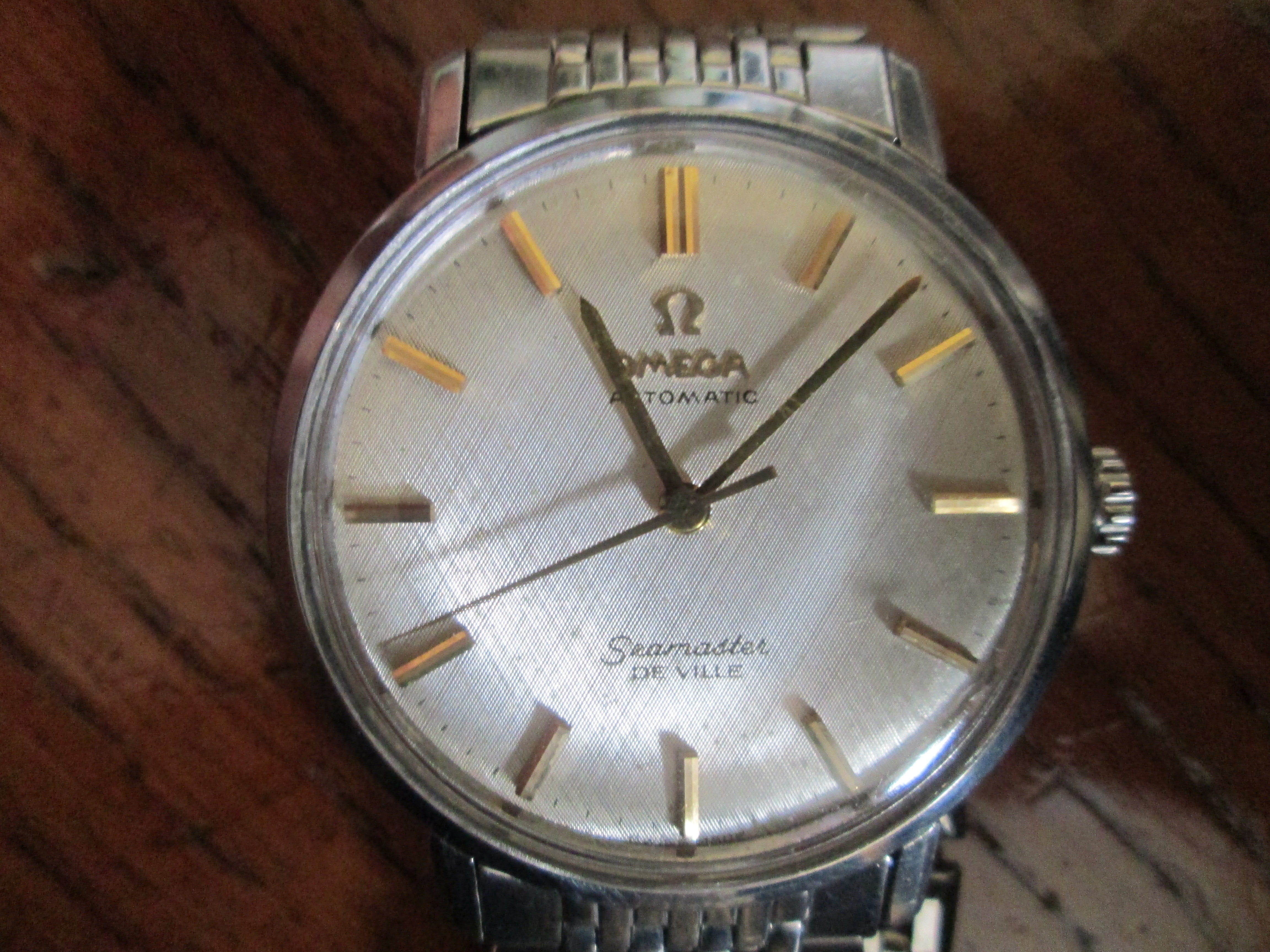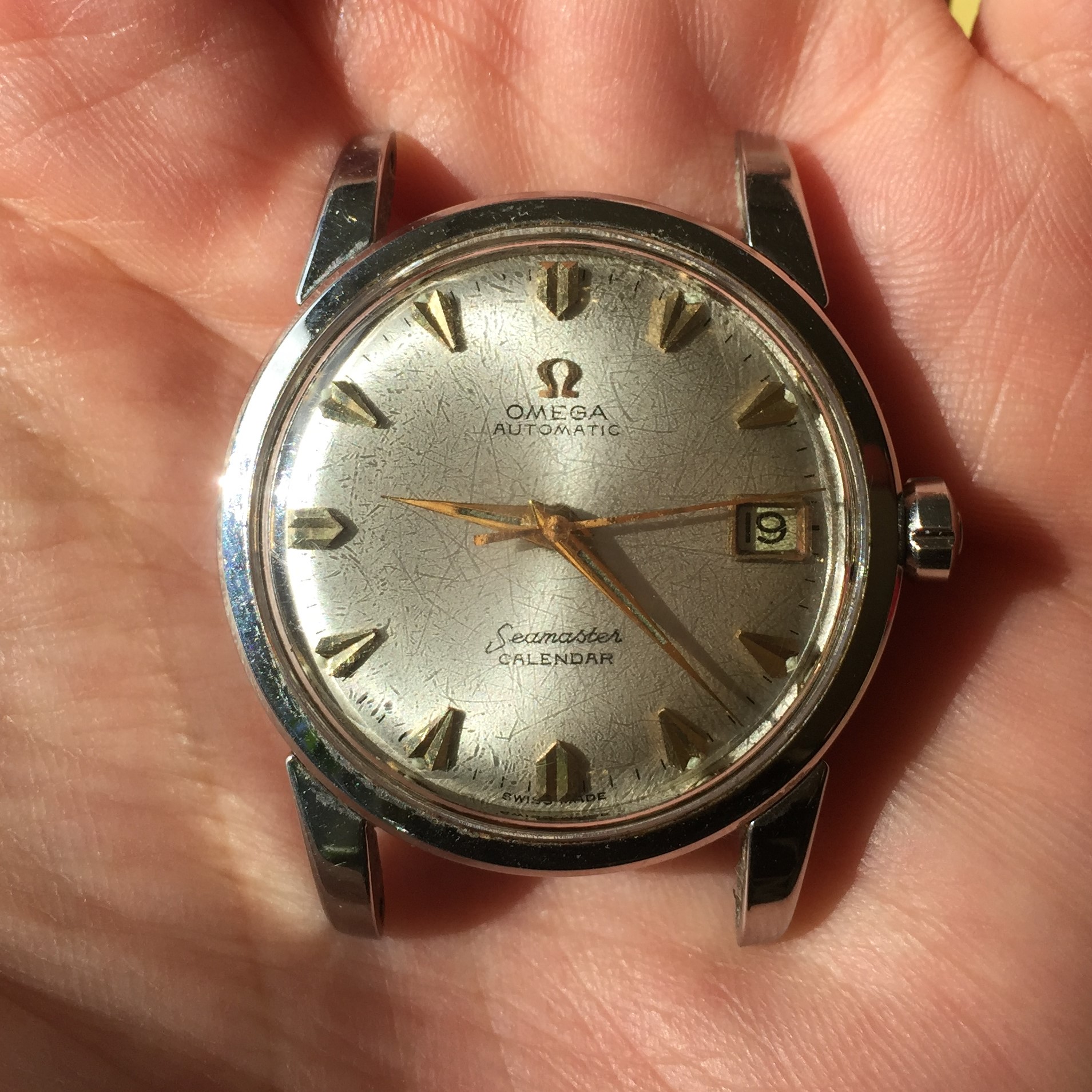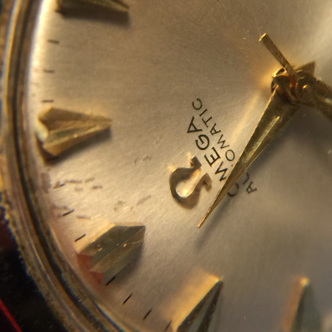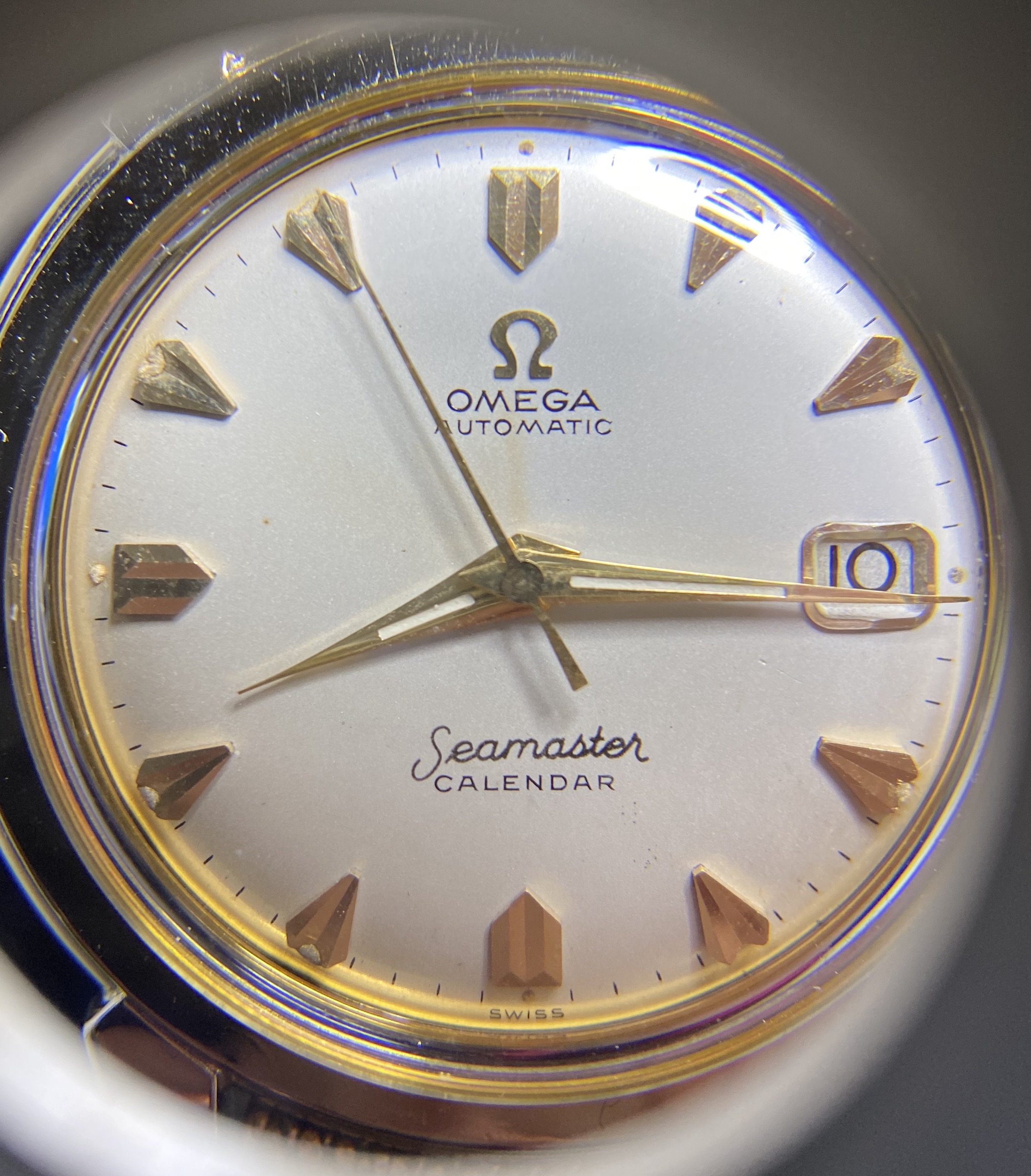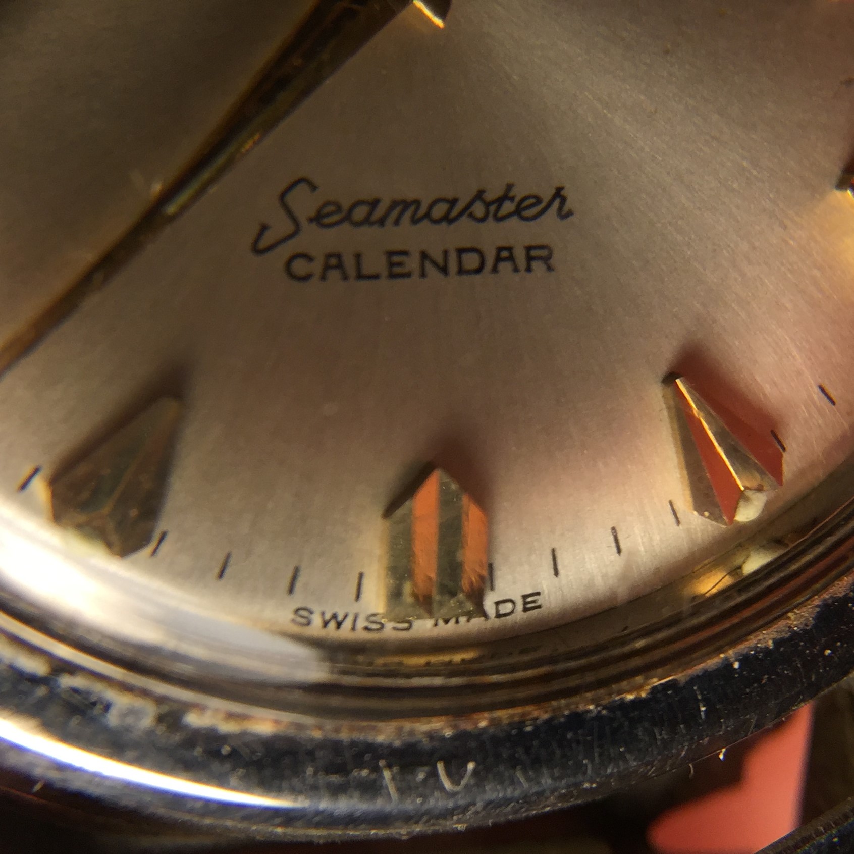 Easier to see under the loupe, but the printing for "Omega", "Automatic" and "Calendar" is one weight and color and "Seamaster" is another. It looks as though "Seamaster" was printed after "Omega", "Automatic", and "Calendar". I can well believe this.