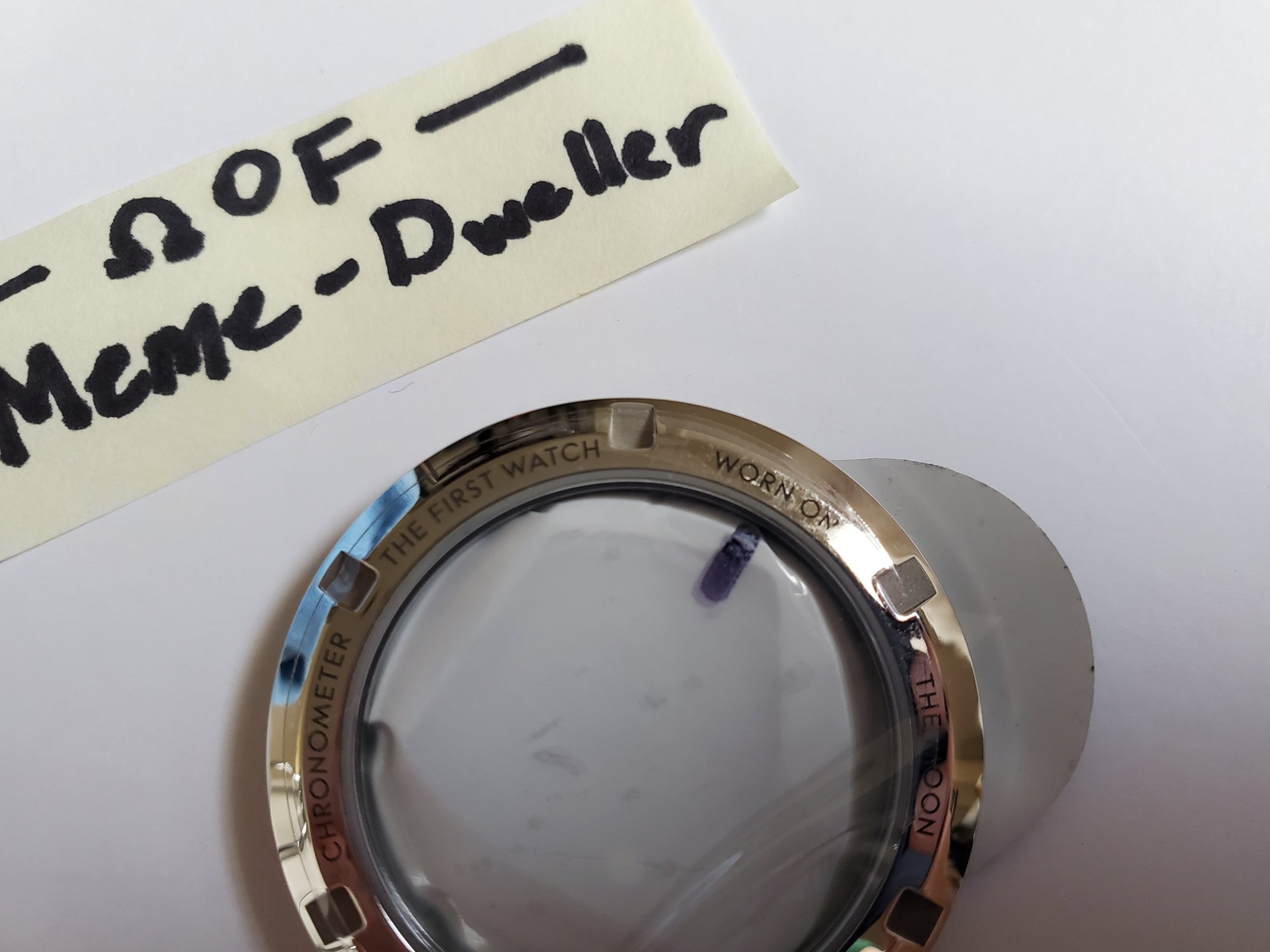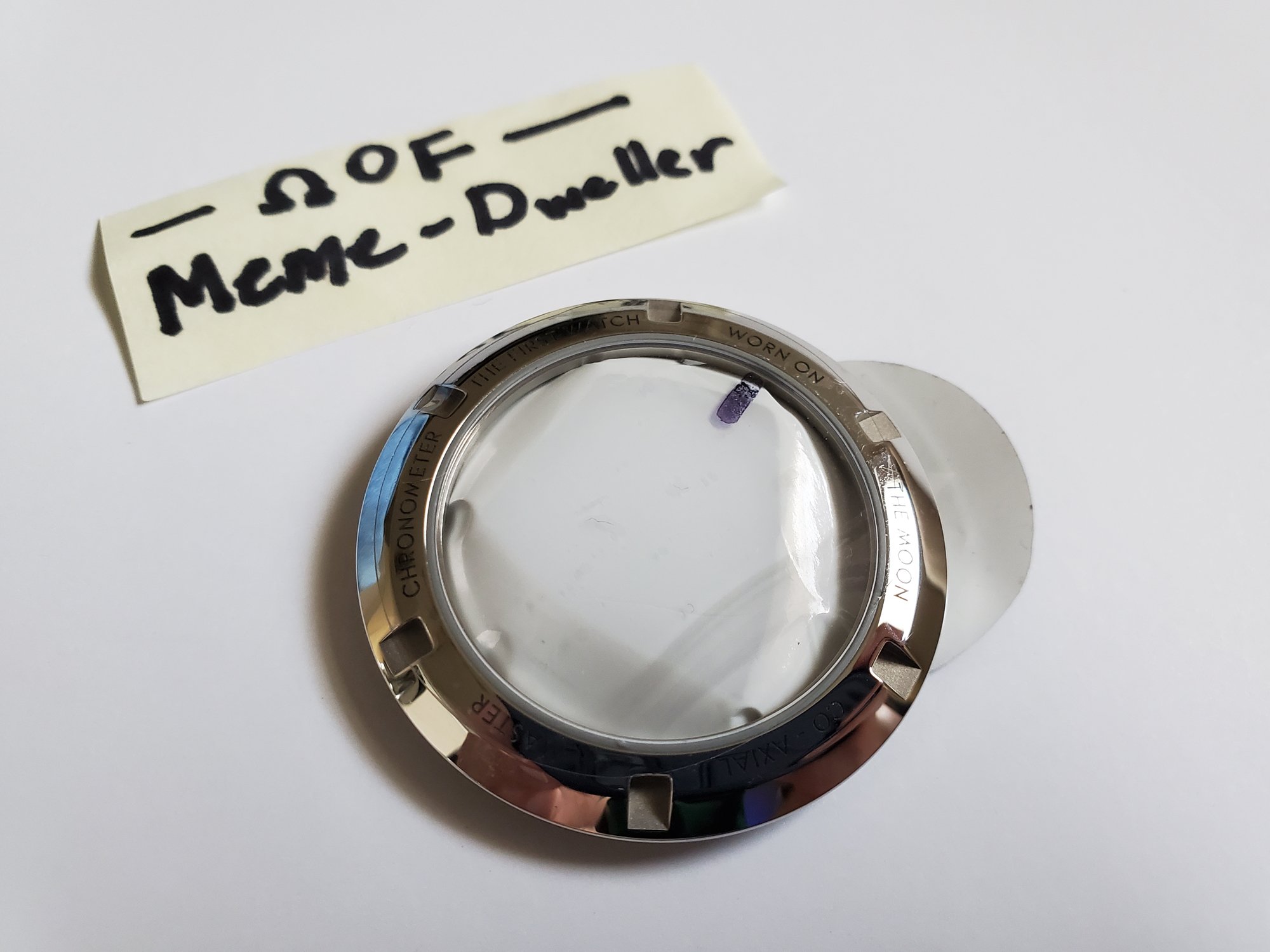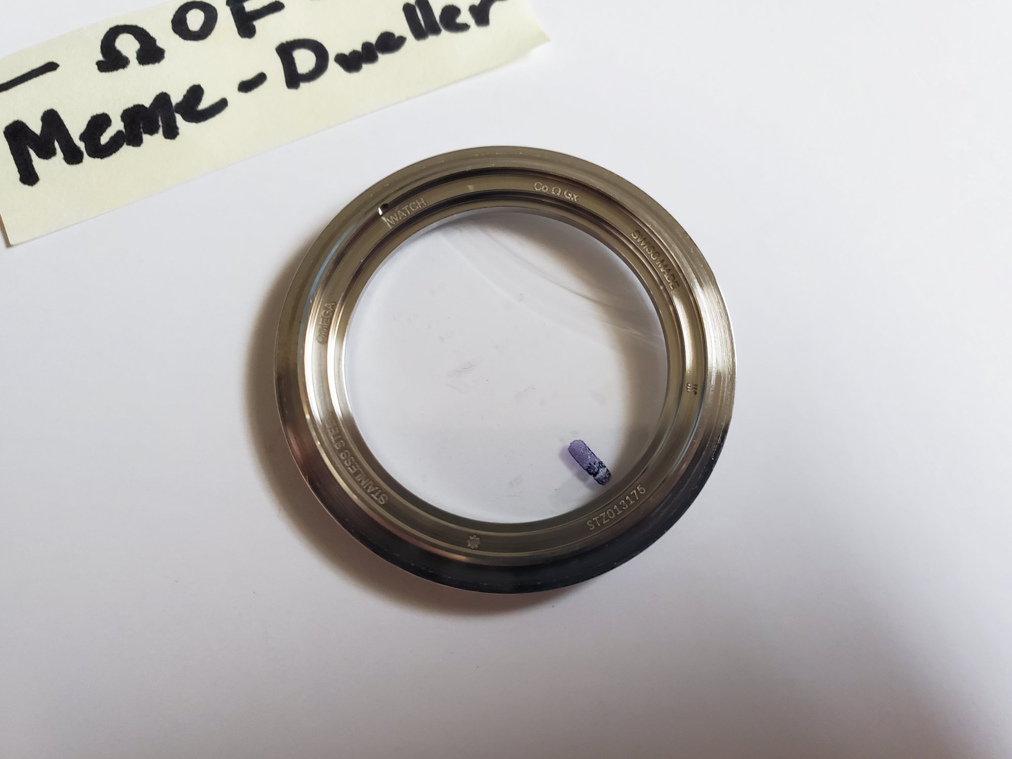 The caseback is in immaculate condition. The marks on the steel part in the photos are just my fingerprint smudges on the mirror polishing. The sapphire is also perfect with a clear protective plastic on it so it looks dirty/distorted. There is a black Sharpie mark on the outside of the sapphire glass which can be easily wiped off with a Q-tip + rubbing alcohol. This mark is an indicator that is supposed to sit exactly at where the 12 o'clock marker is between the lugs on the opposite side after it is screwed down. It helps to ensure the proper tightness of the caseback without the use of a specialized torque wrench.