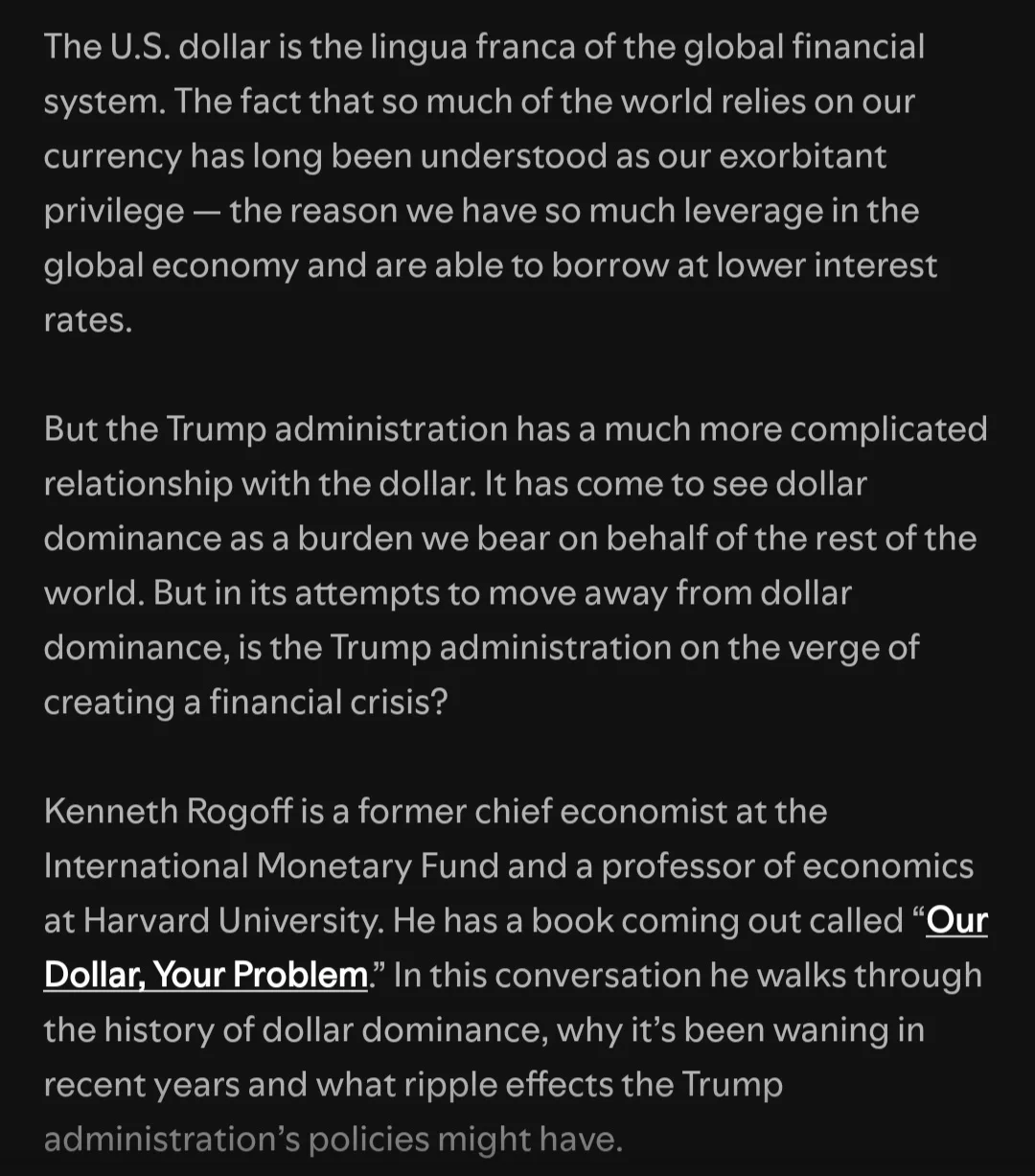 3. Trump doesn't really want high tariffs. It's just a tool to get people to negotiate. Not only is this not true, but it is the worst aspect of his policies. Trump has been fixated on tariffs for decades and it isn't clear that he isn't enamored with tariffs. Most importantly, his aribitrary imposition of large tariffs and sudden reversal makes the USA unreliable. Worse than a tariff is not knowing how to plan. It also means that any agreement Trump makes is not trustworthy, as the USA could rip it all up again. This gets to the important part of the interview, that the world is getting away from using the US dollar, which will have a greater negative impact than tariffs.