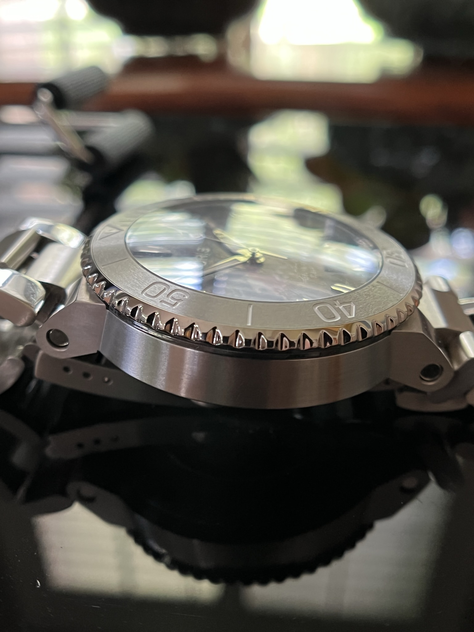 No two dials are alike. The case is 41.5mm and is water resistant to 300 meters.