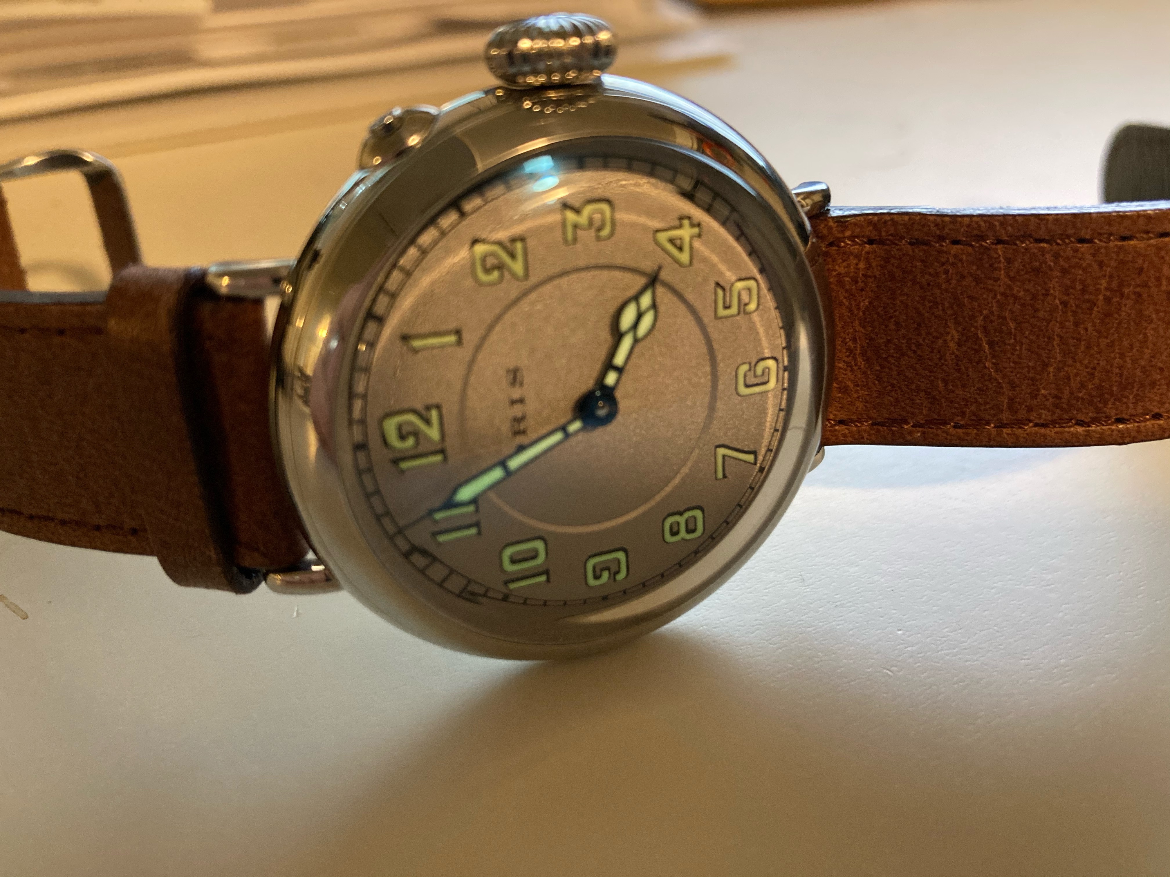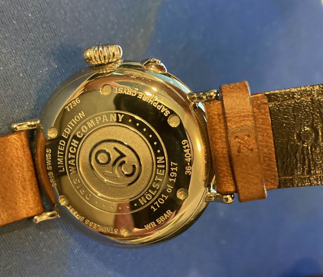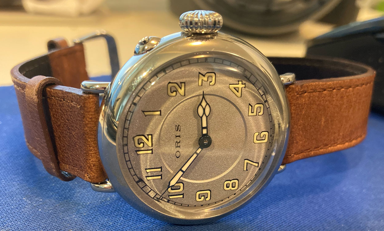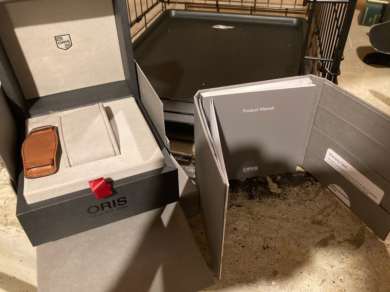 Additional comments: Worn less than 10 times. Some of these watches are packaged with a brown leather rivet strap (in addition to the one I have with the removable cuff) and also some kind of leather pouch; this one comes with the more standard Oris box. I am also including the flimsy white outer slip-box (not pictured), which has a tiny tear at one corner (courtesy of me). It's just a worthless piece of cardboard but I'll include it anyway since it says Oris on it. 😀 The watch is modeled after c.WWI pocket watches, and sets the way they did---you depress a small button (above the crown) and then turn the crown to set.