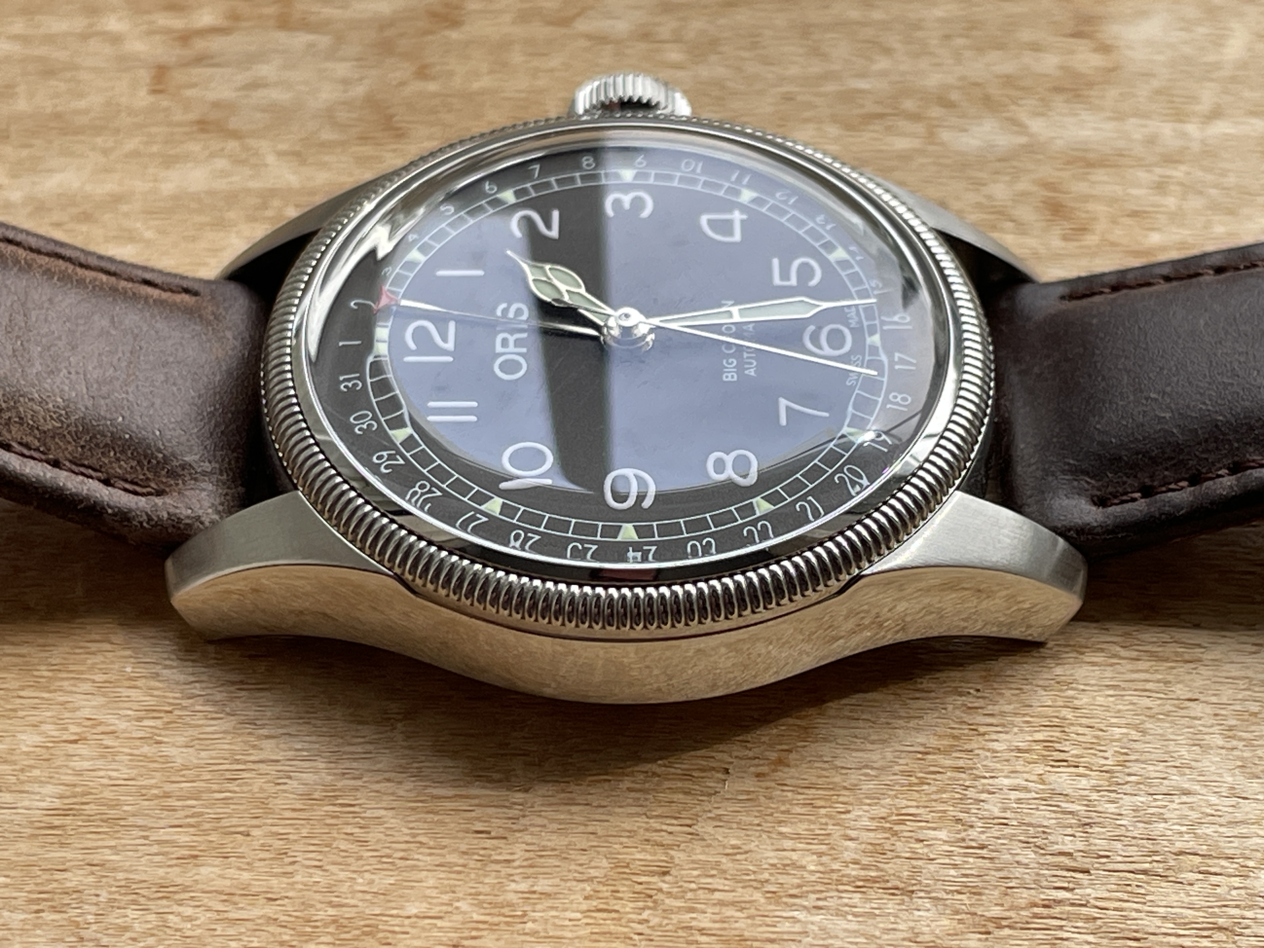 • Crown: The watch has the signature oversized crown (hence “Big Crown”), which was initially designed for pilots who wore gloves and needed to adjust the time easily.