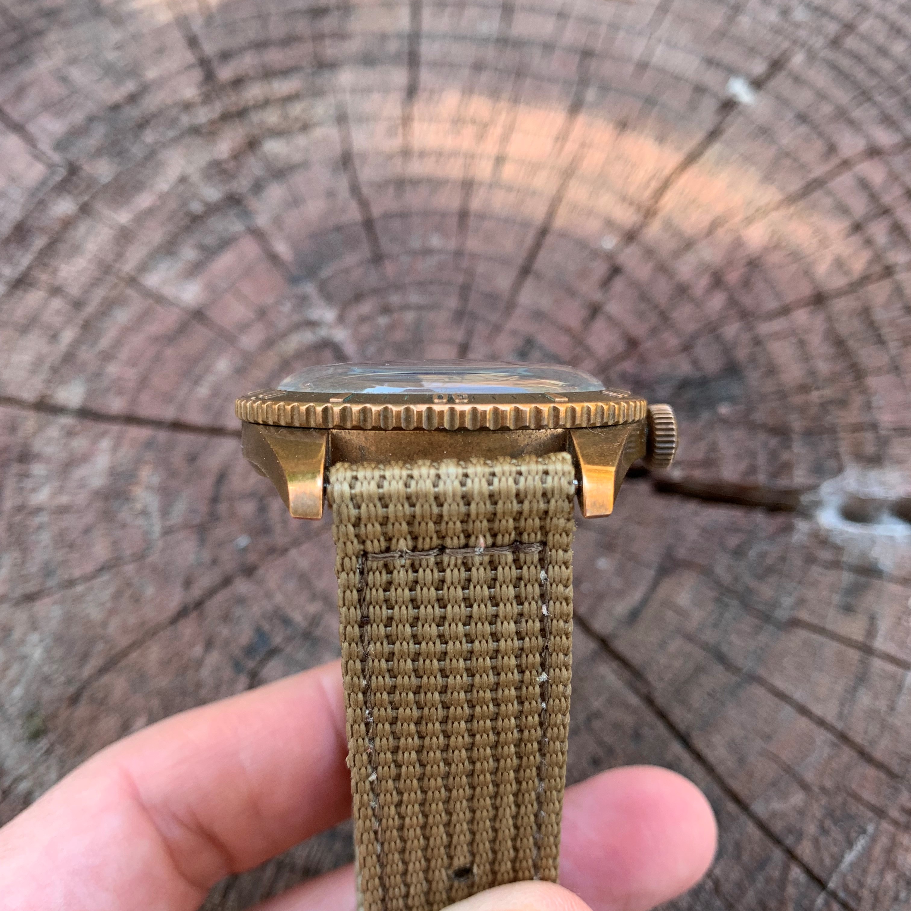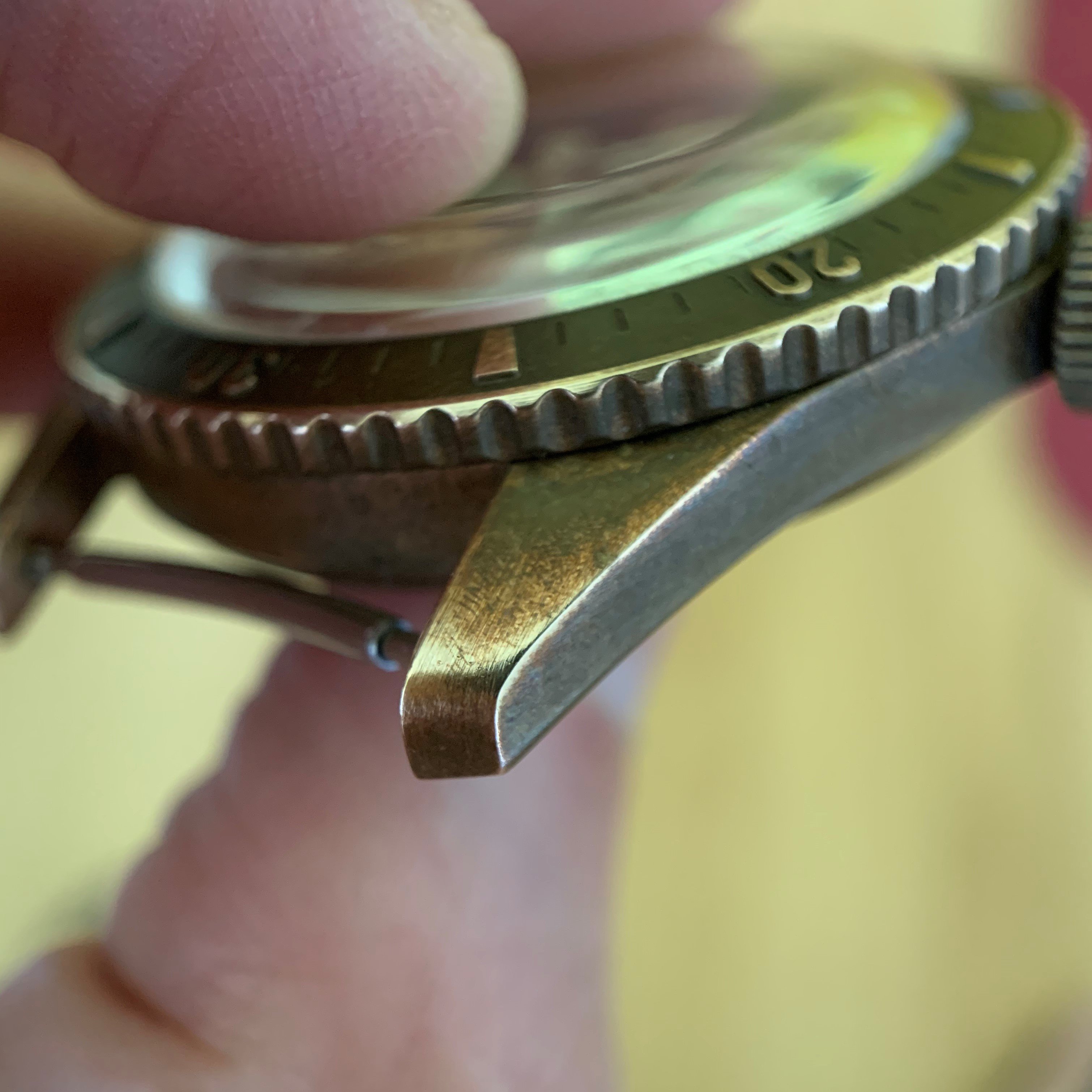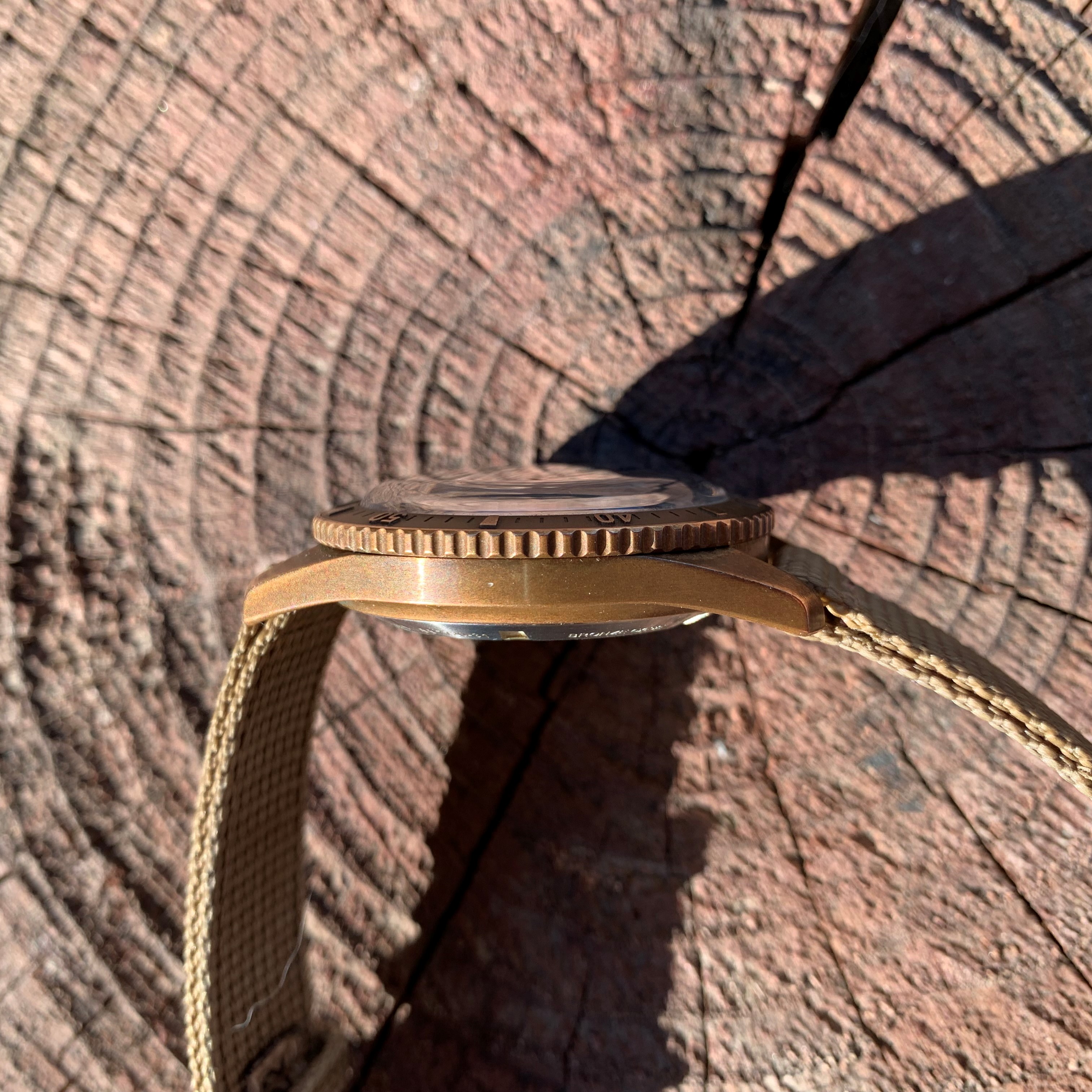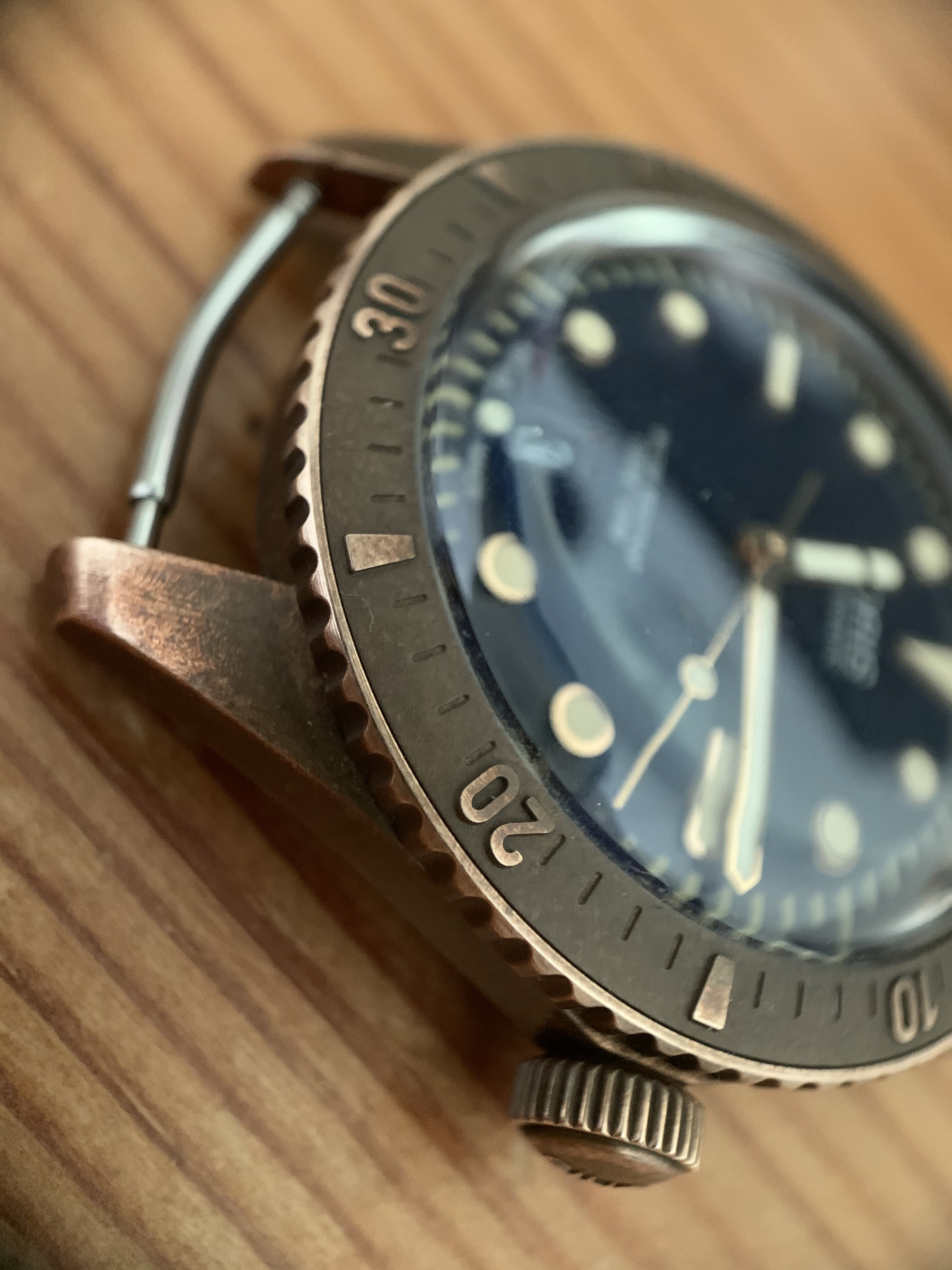 I tried in vain several times to capture the patina of this watch as its seen with the eye. Its near impossible. What I can say is that when it hasn't been worn for a while and one whips it out of the watch storage, the 'lighter' parts (the edges...so the bezel edges and raised parts of the numerals, the case edges, the crown edges etc) take on almost red hue...its beautiful. Then after a day or so being worn they become more golden. Where they pop the most is in indirect lighting ... actually where there is hardly any light. Here I tried to capture this patina with a macro lense in a shadowy part where it was especially pleasing to the eye.