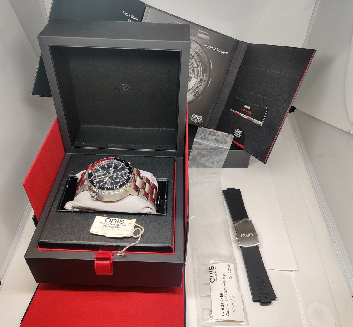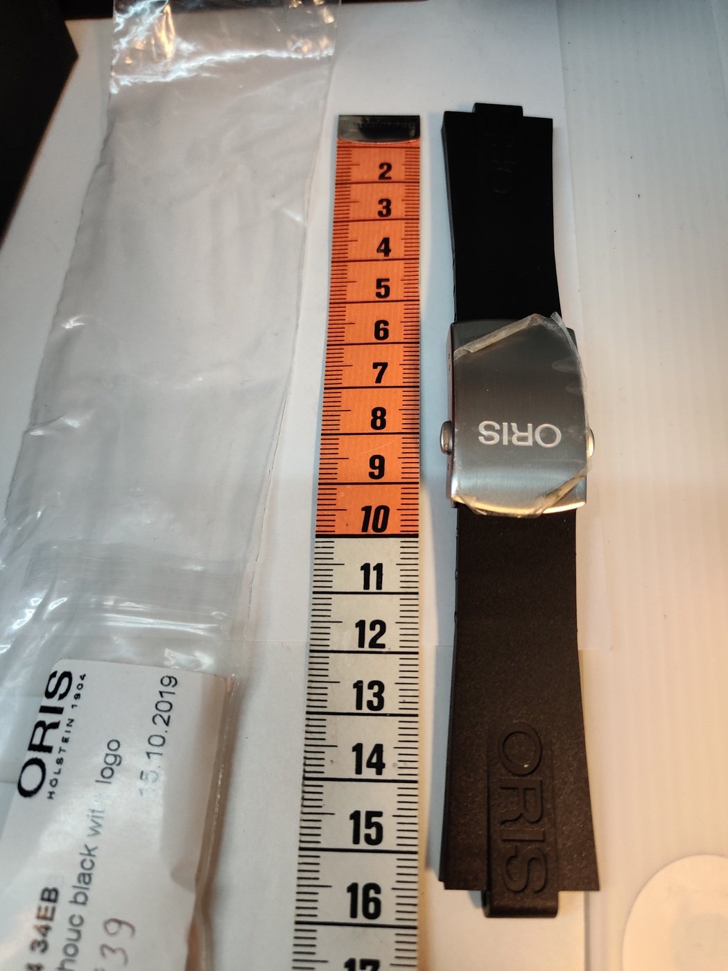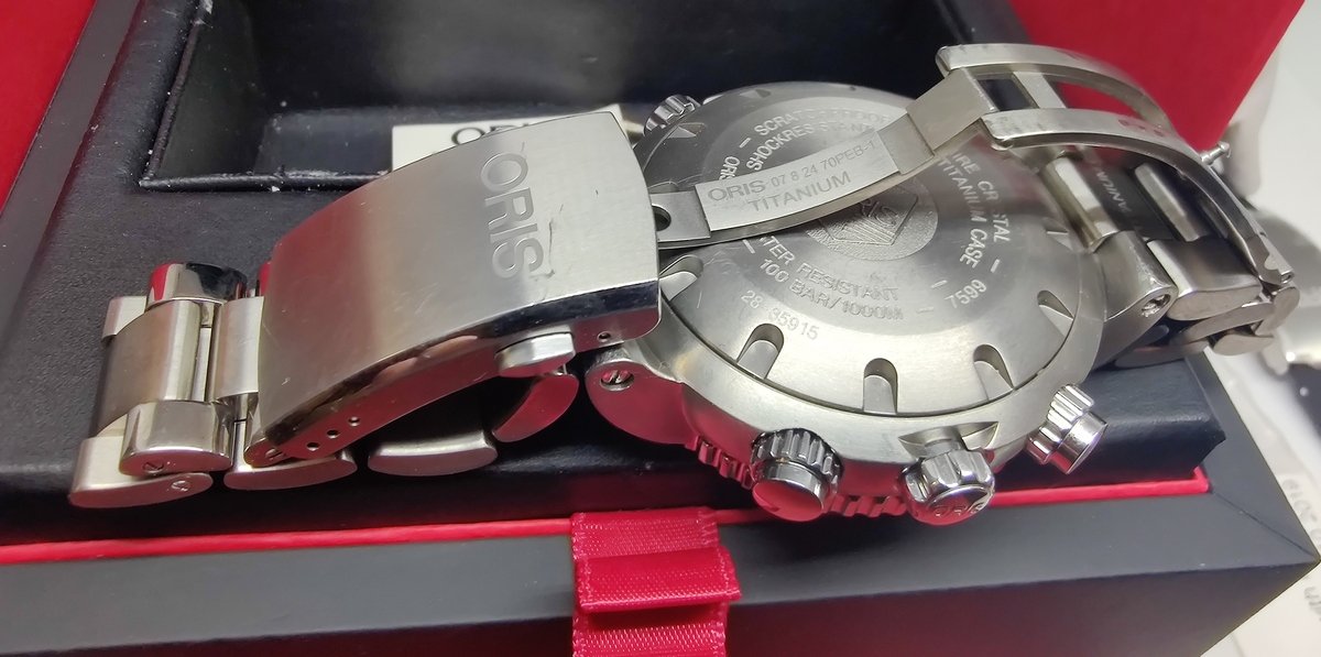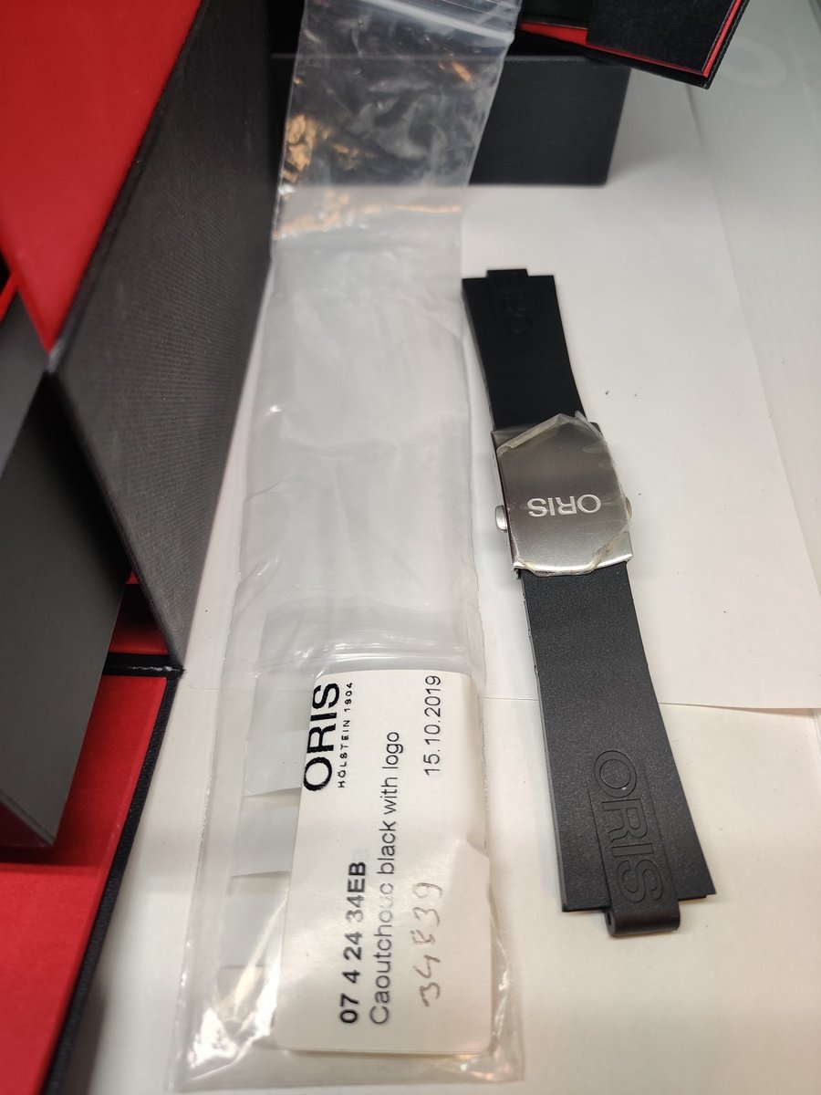 Original Oris Titanium Bracelet & Additional Original Oris Black rubber Strap with signed Titanium deployment buckle with plastic still there, was bought afterwards and is shortened to around 16cm, see pictures, do not know how big arm it fits, and it depend on how tight you want it.