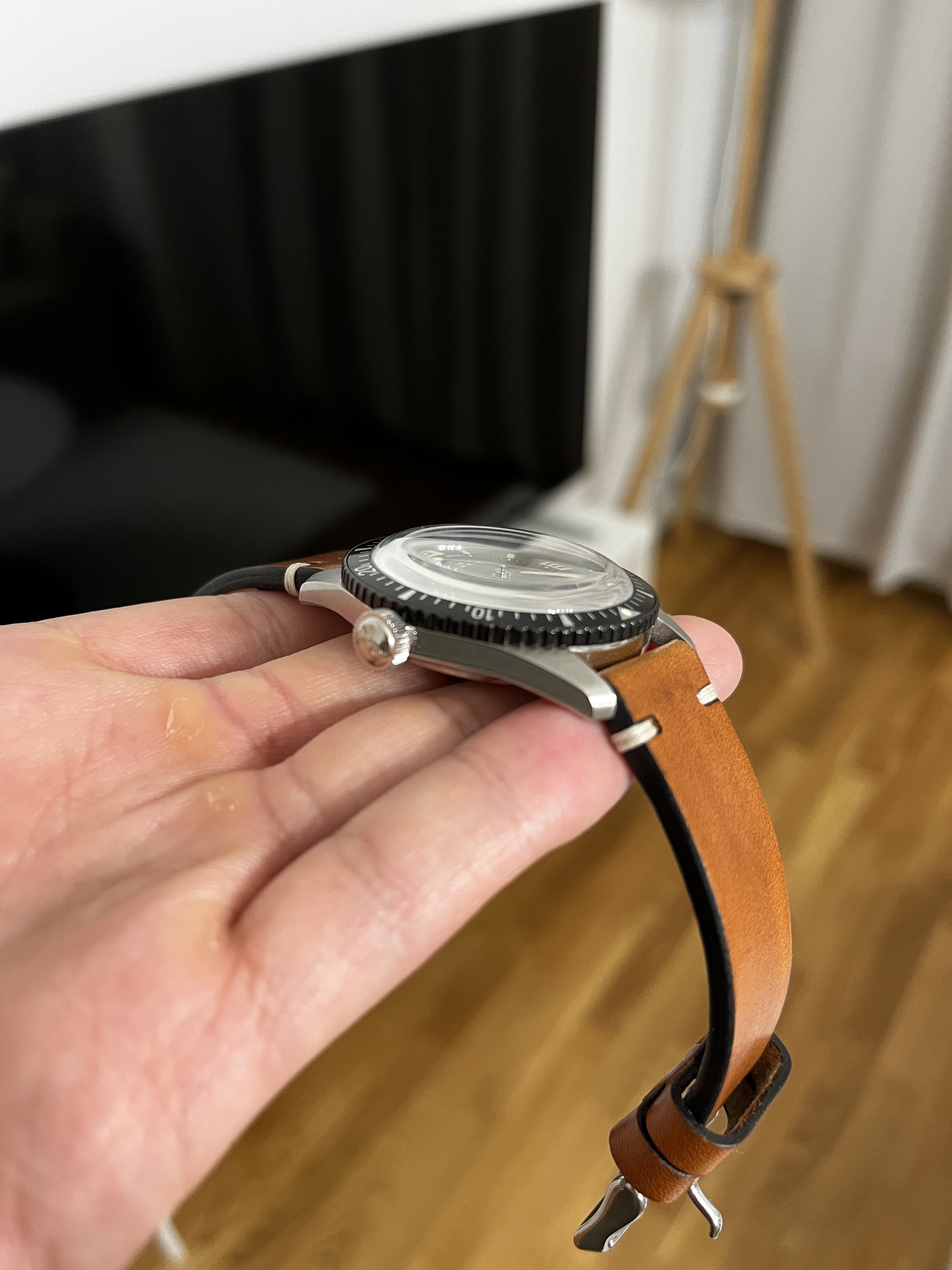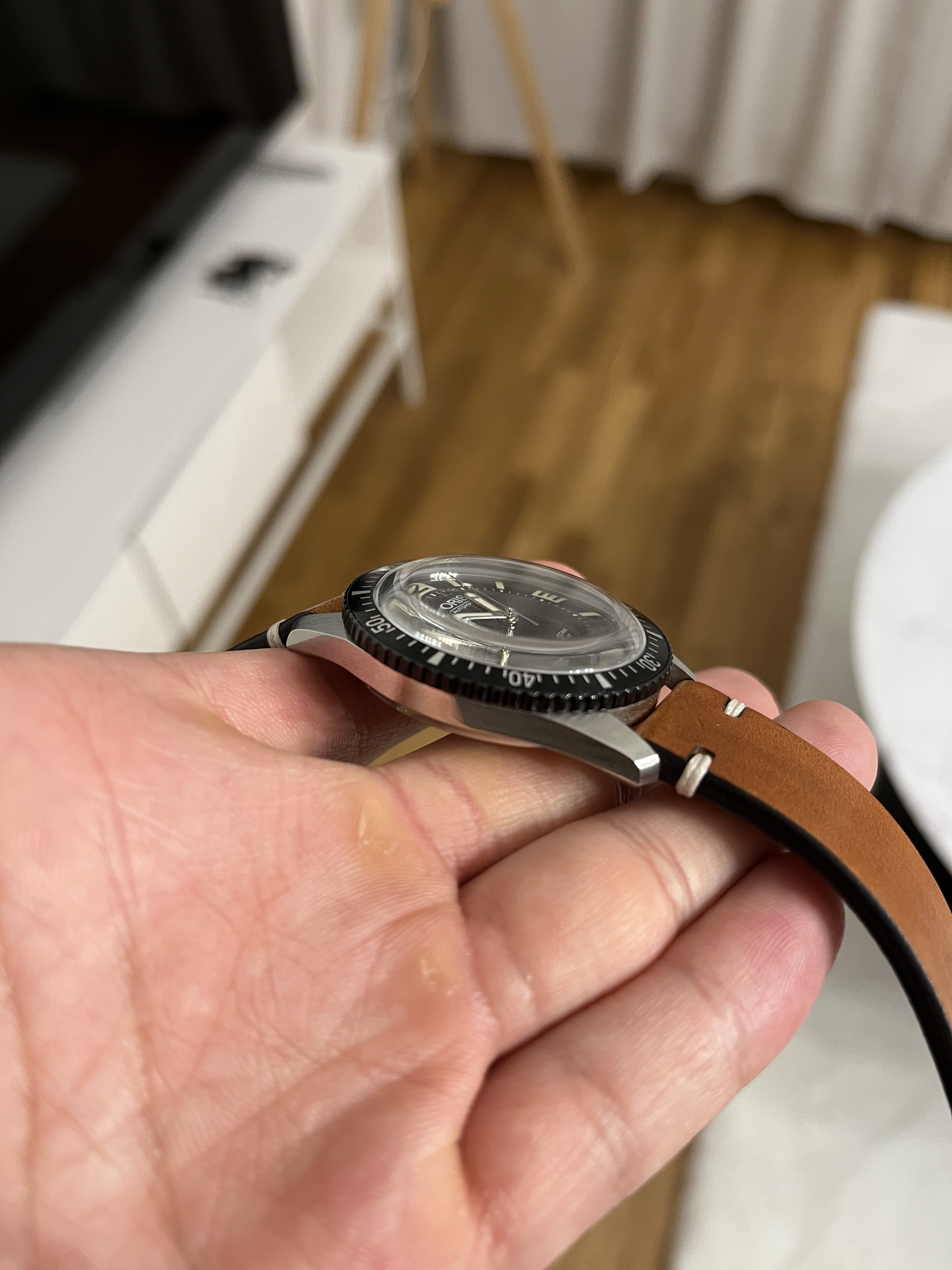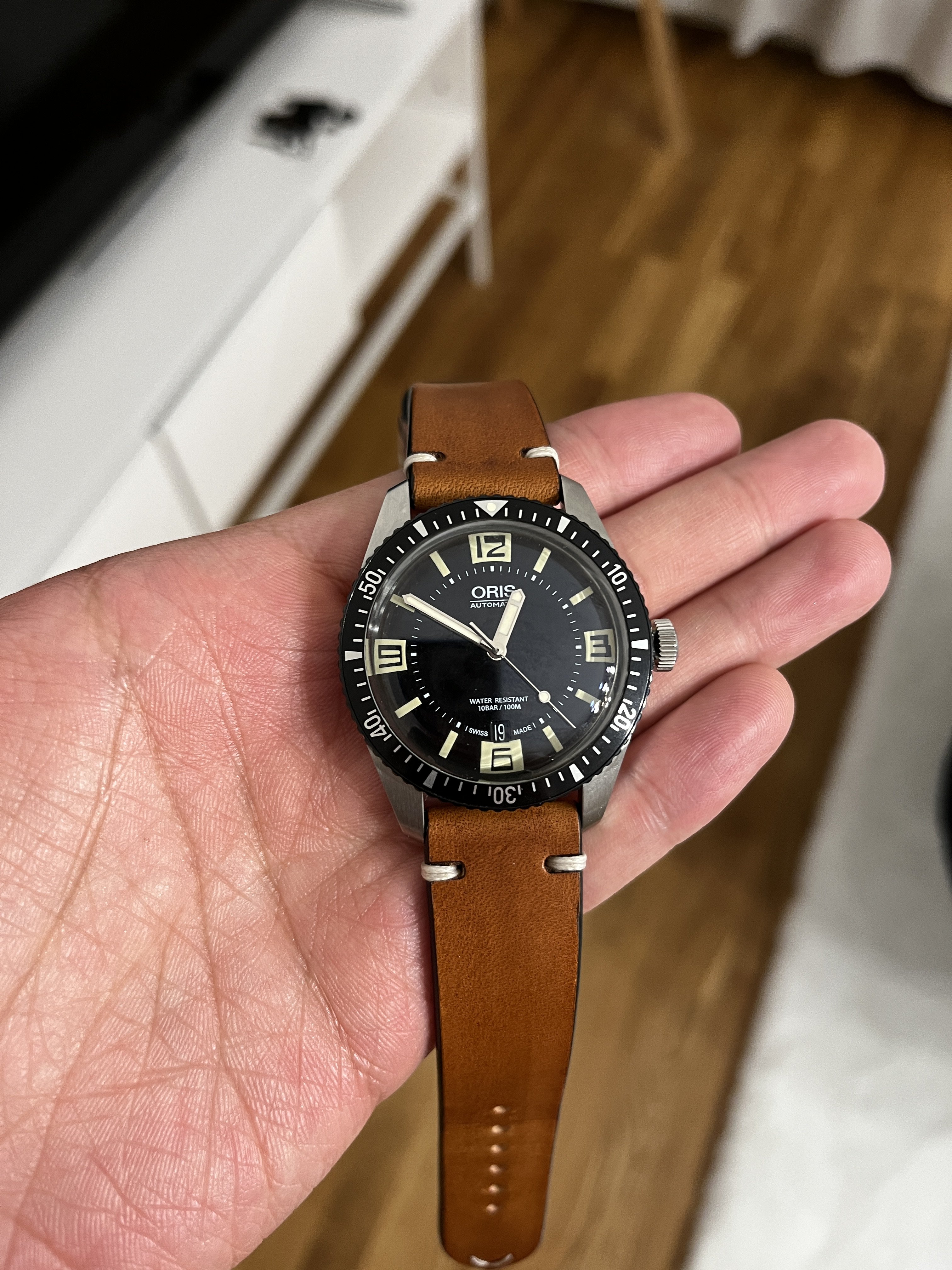Bought back in October 2019 and have barely been used since. The bezel and the sides of the case have no/barely visible traces of use. The "invisible" parts of the watch, i.e. the back cover and the back of the lugs have visible hairlines and small scratches. It comes with fullset and on a original textile strap from Oris.