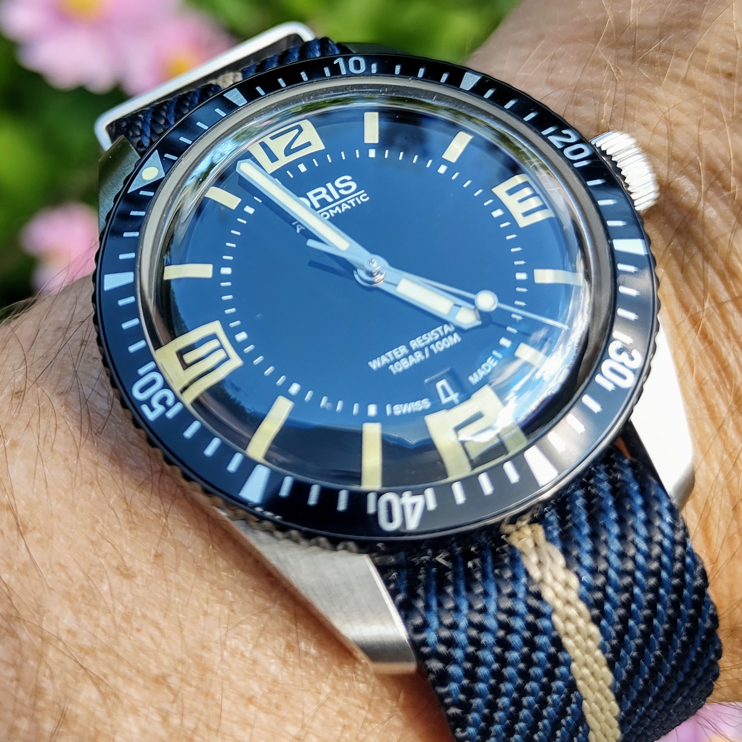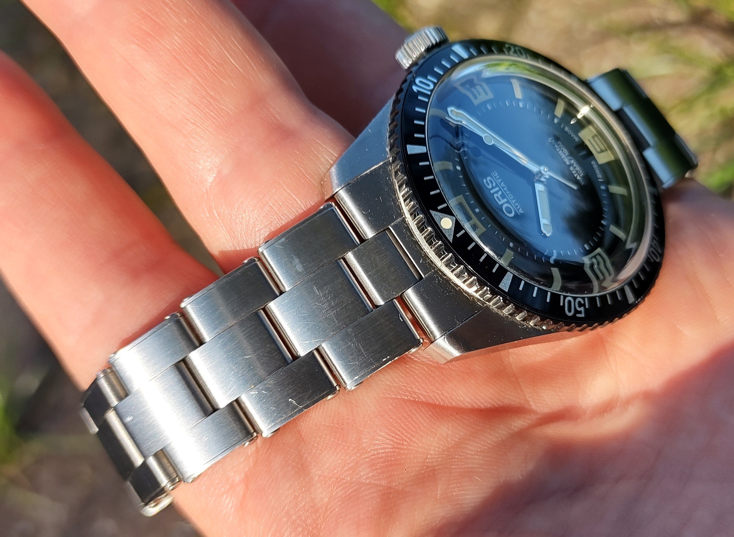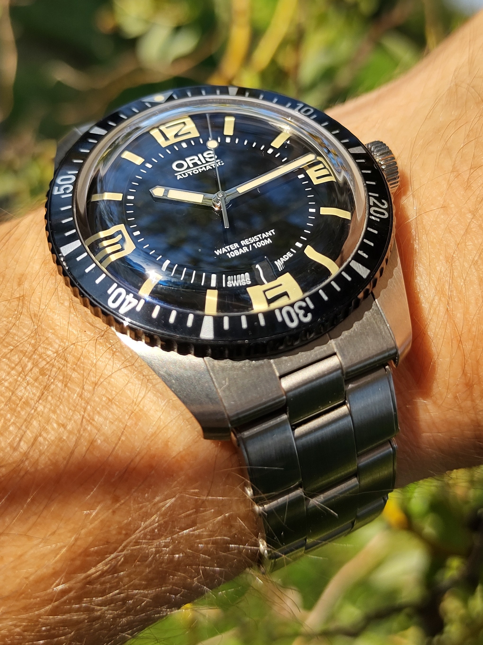 Perfect 40mm size, 13mm thickness, night-shredding lume, solid feel, SW200 inside with some Oris tweaks (or so they say), lovely black-coated bezel perfectly complemented by the black insert, lollipop seconds hand. The bracelet is simply glorious... perfect design, fit, taper, clasp mechanism...
