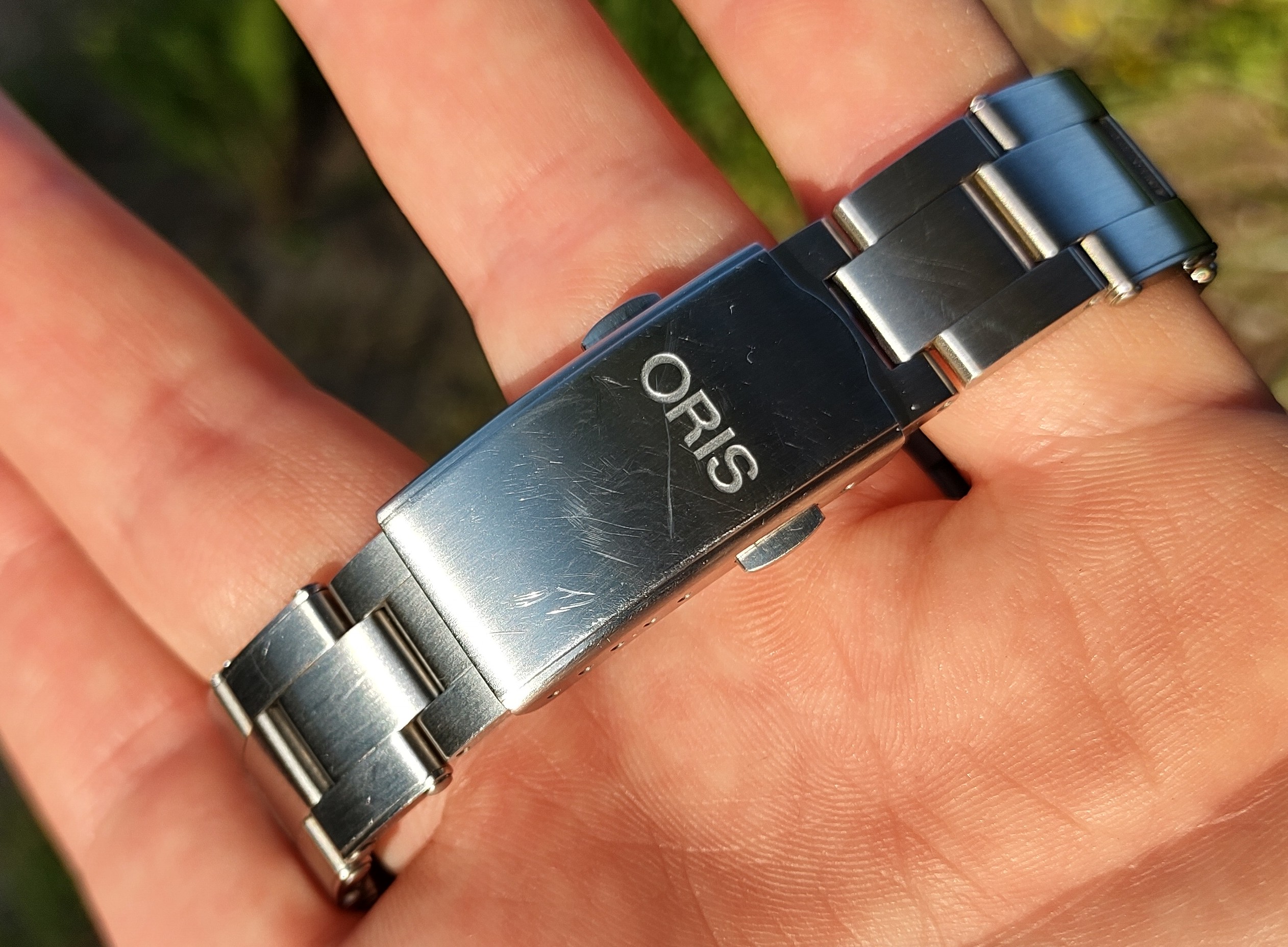 The bracelet has its full links (not on the latest pictures as I have a smaller WRIST than Eugene). There is a scratch on the clasp which is a battle scar as Eugene was part of the Special Ops team that fought a fierce rock in the bed of a remote river while he was helium-diving at 6 feet deep (too much YOLO, obviously) - so this scratch has genuine provenance and turns you up straight to 11 when you rock that baby on your wrist!