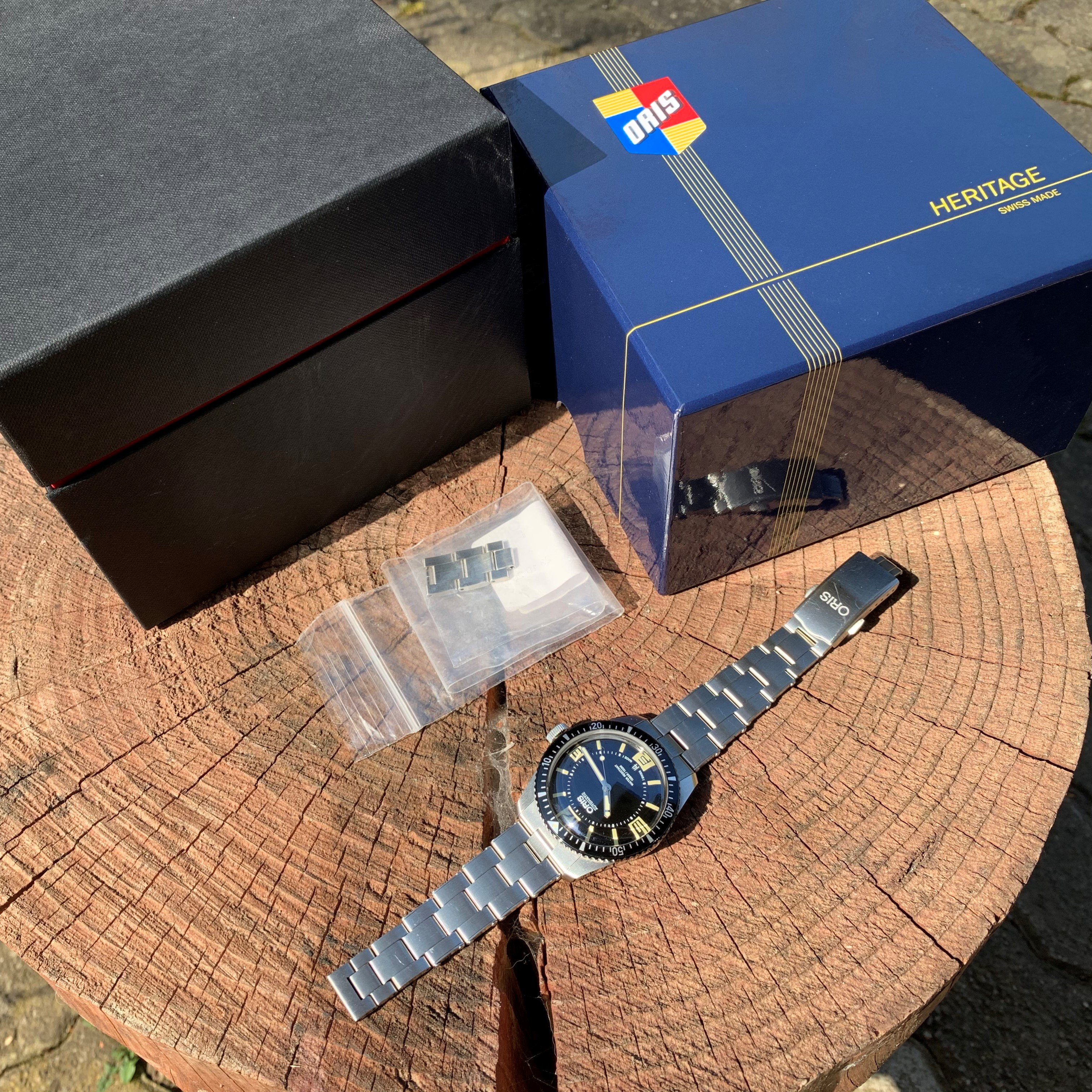 "It comes with its original heritage box. UNFORTUNATELY, due to the weight of the generic Oris booklet (its about the same size as the top surface of the box, and about 2.5cm thick) [the previous owner] recycled [his] many years ago. Pretty dumb, right? But thats where [his] mind was in the mid-teens. Also, it was not specific or special to this watch. [He] has since seen one or two for sale for about 20CHF, but [he] didn't bother to reacquire one" and neither did I.
