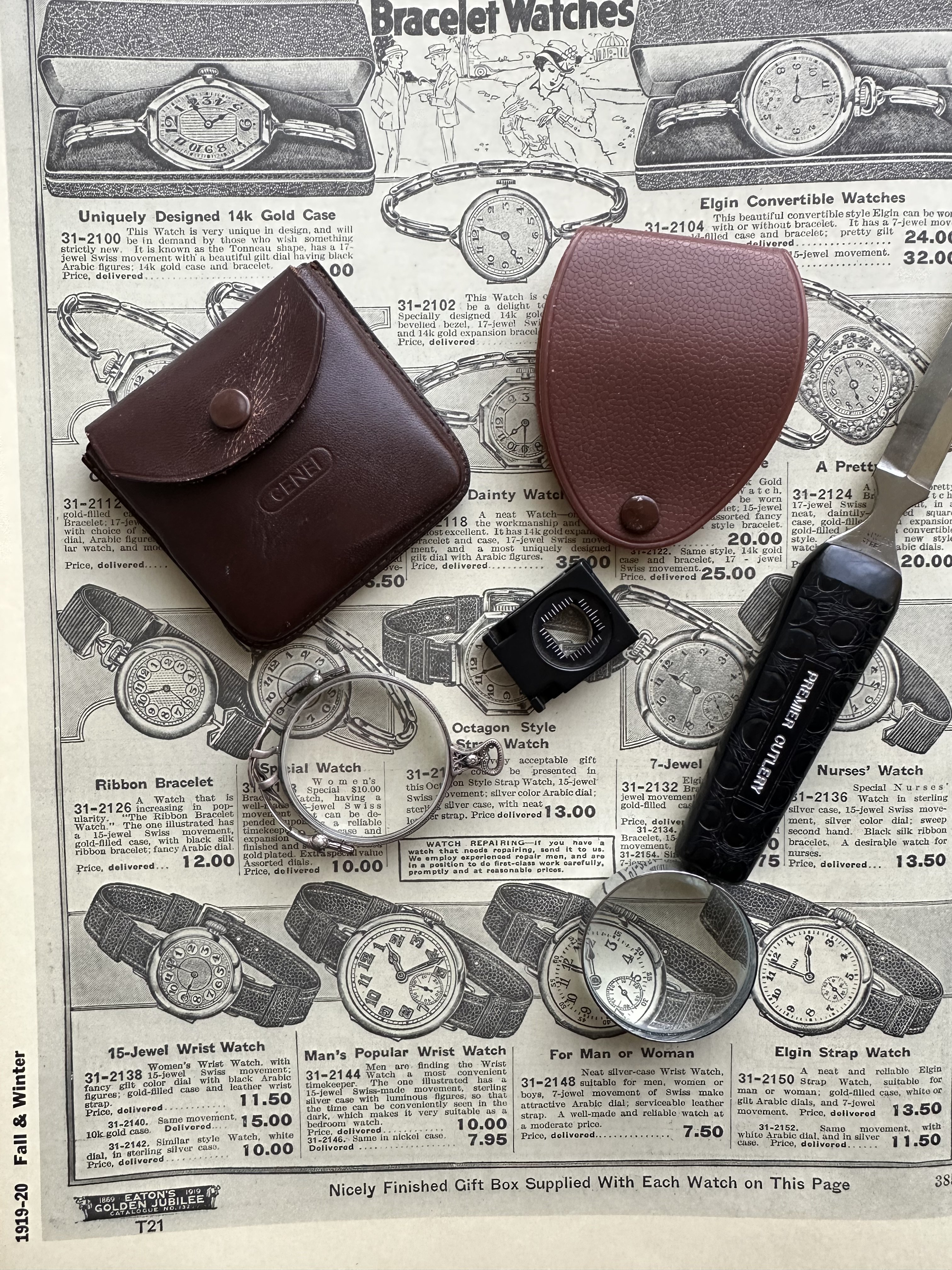 I don’t use any of these. They simply accumulated over time. Perhaps I will need them in the future. The background is from a late 60s publication and shows pages from hundred plus year old Eaton’s catalogues.