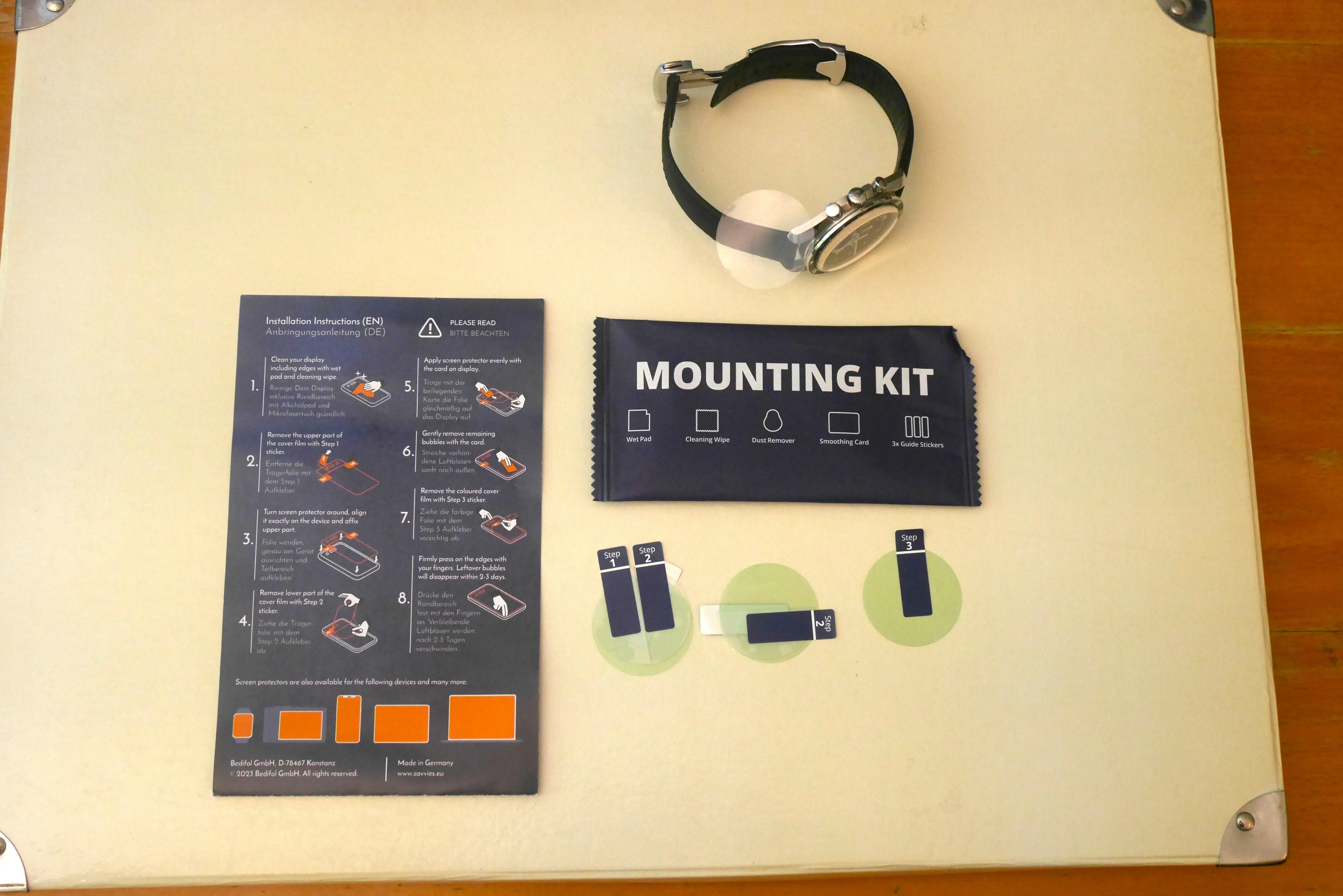 So out hunting for a solution it turn`s out i am not the only one to scratch this itch, as Ebay seller Protectionfilms from France/Germany sells these Savvies. 4 pieces of round 42mm protective film stickers with an excellent manual, wet pad - cleaning wipe - smoothing card all-in one for just 9,- euro.