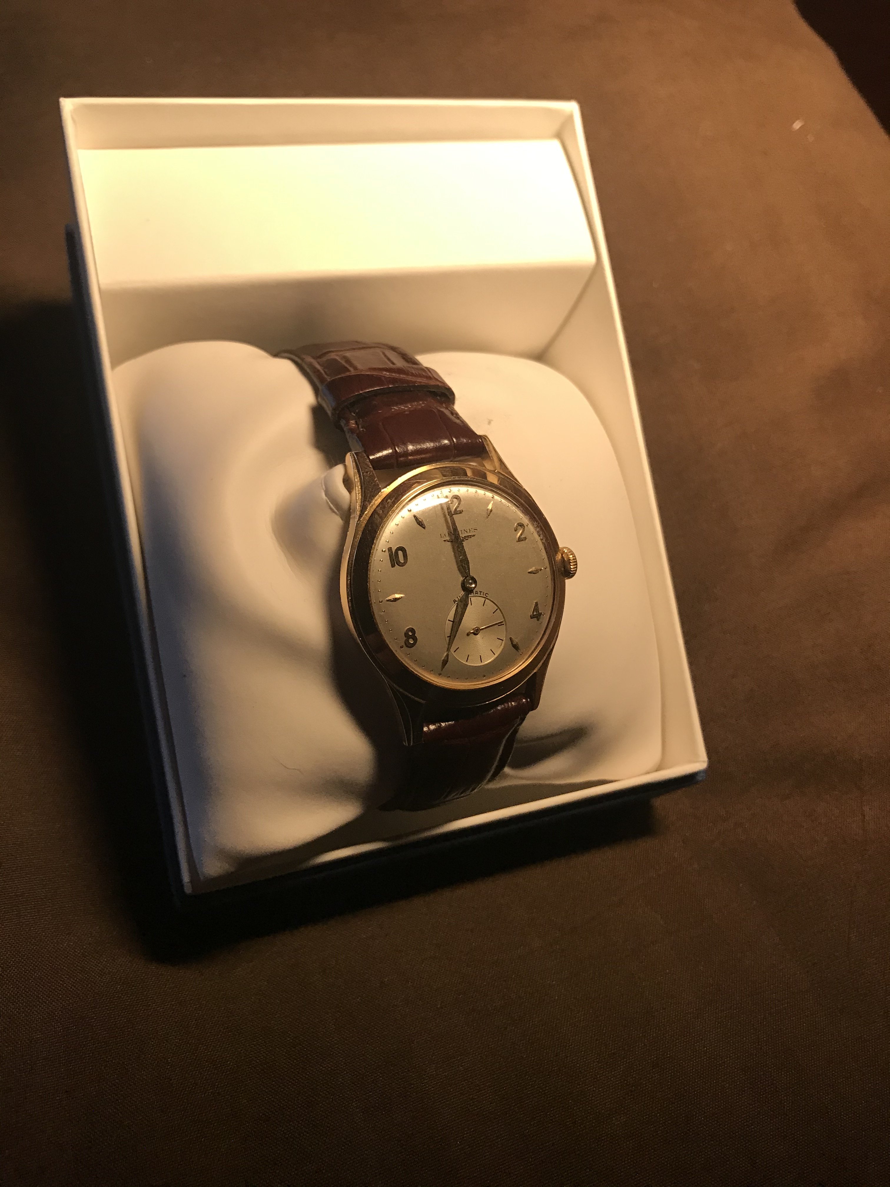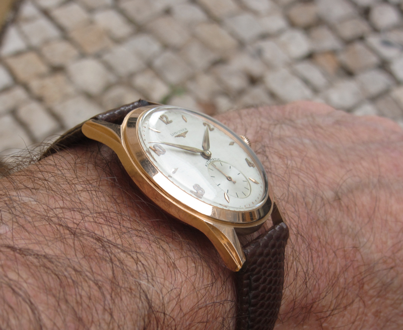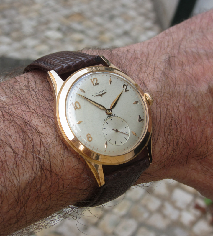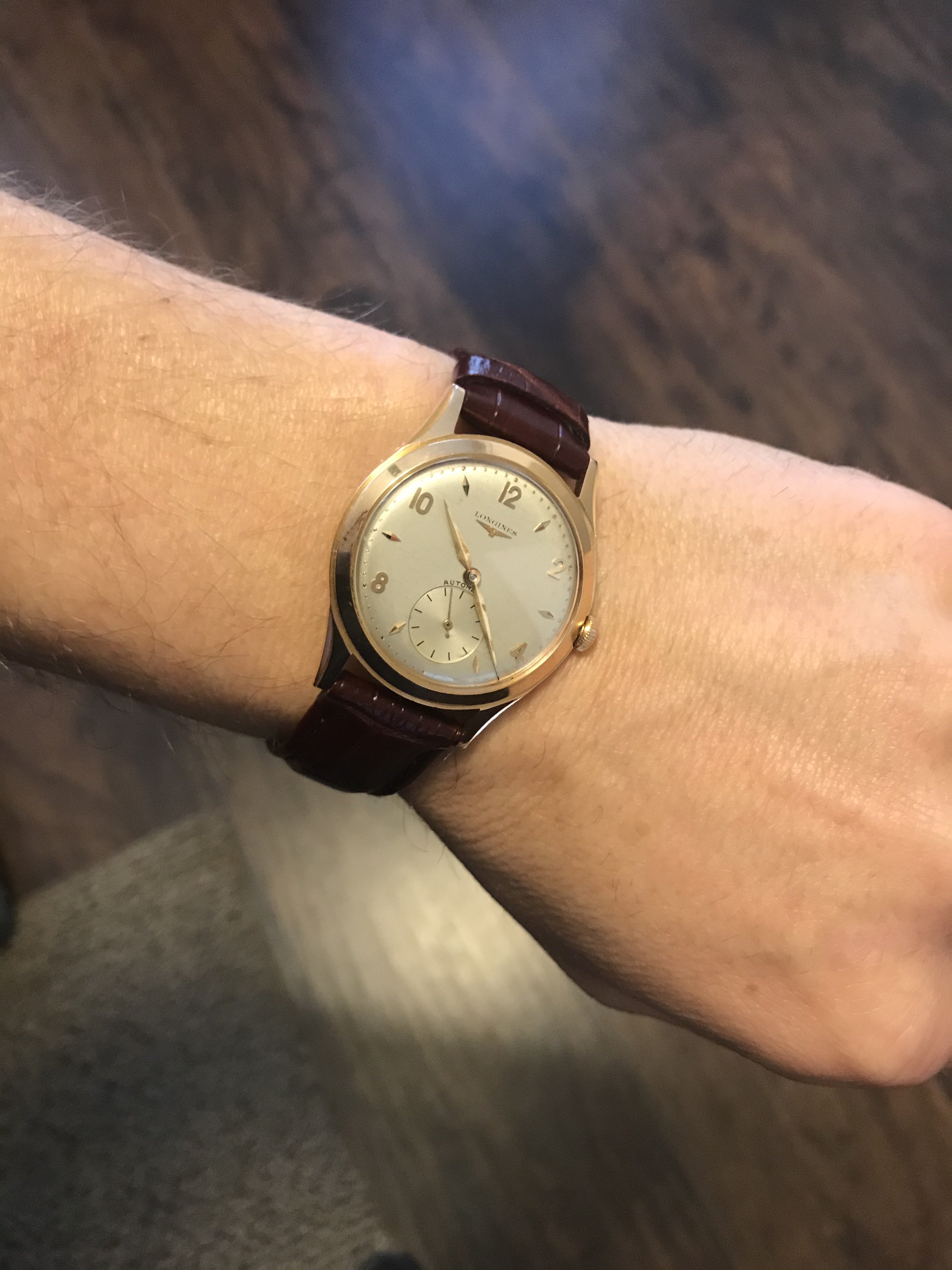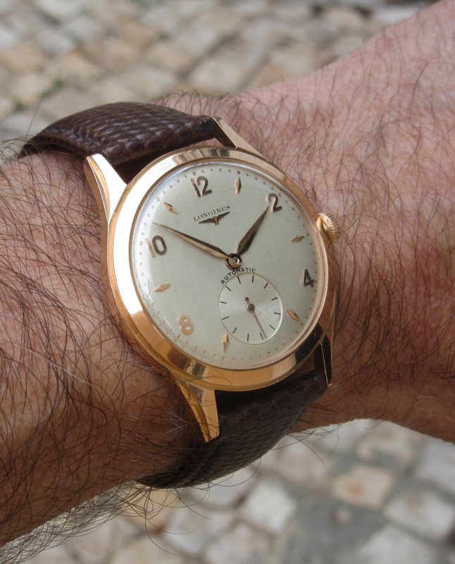 "This one is a very uncommon and early cal. 22A Longines automatic. The unpolished, 34mm snap-back case is made of 18k pink gold, perhaps leaning a bit more towards red than pink. The case is exceptional in a couple of respects. First, the lugs are slightly curved and finely beveled. I have never seen this design on any watch, and they are both elegant and beautiful without being overly ornate. Secondly, the bezel, instead of laying flush with the side of the case, actually sits on the case, with 1-1.5mm of the case extending outwards underneath it. This lends a very interesting, unusual, and attractive complexity to the watch, similar in some respects to more obvious stepped cases (which are valued highly, as it happens, by vintage Longines collectors).