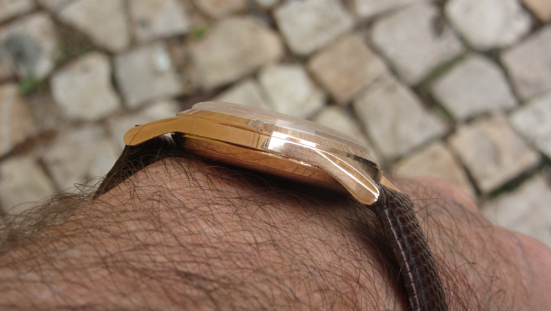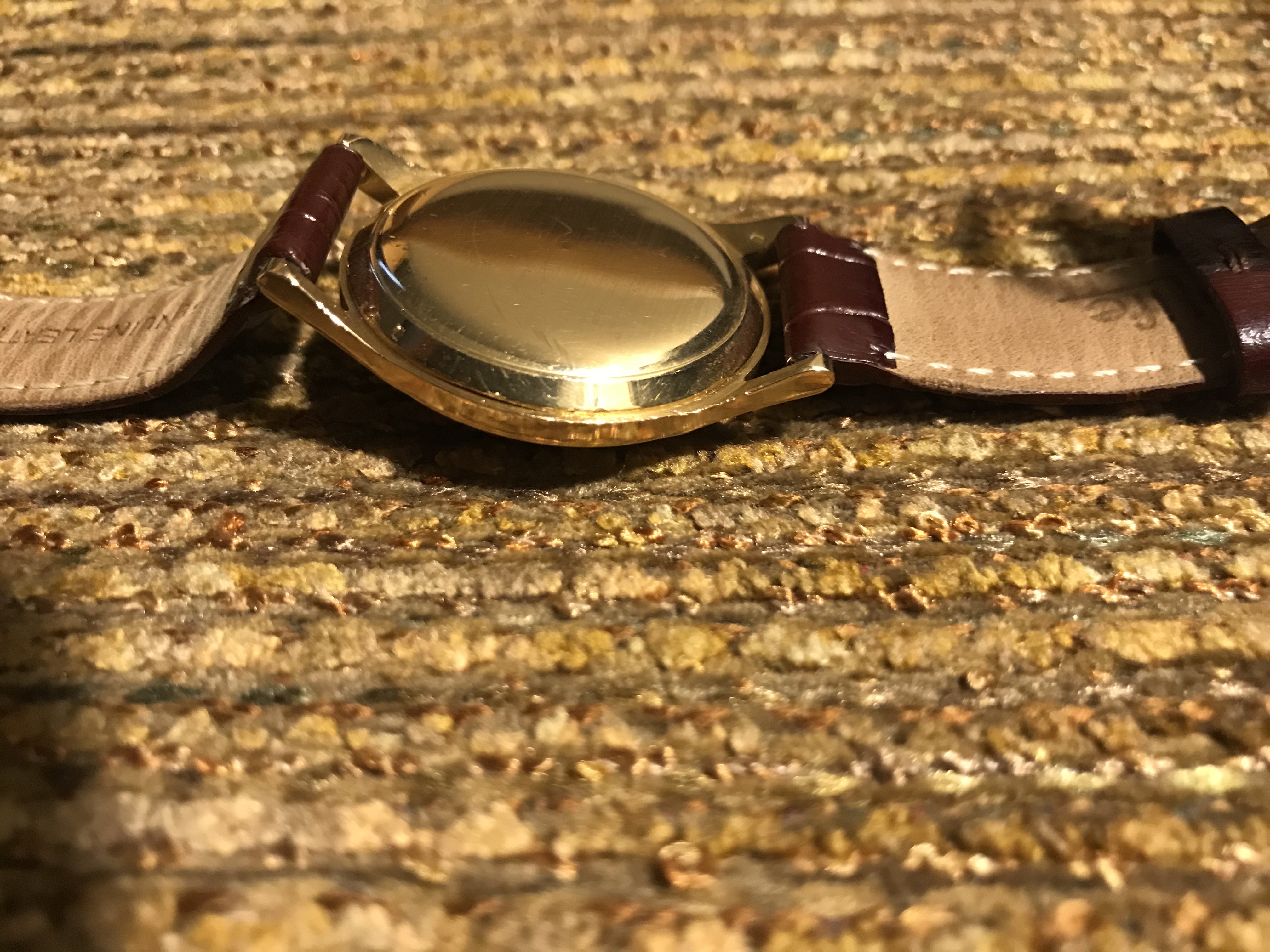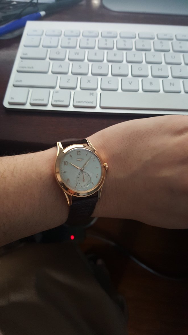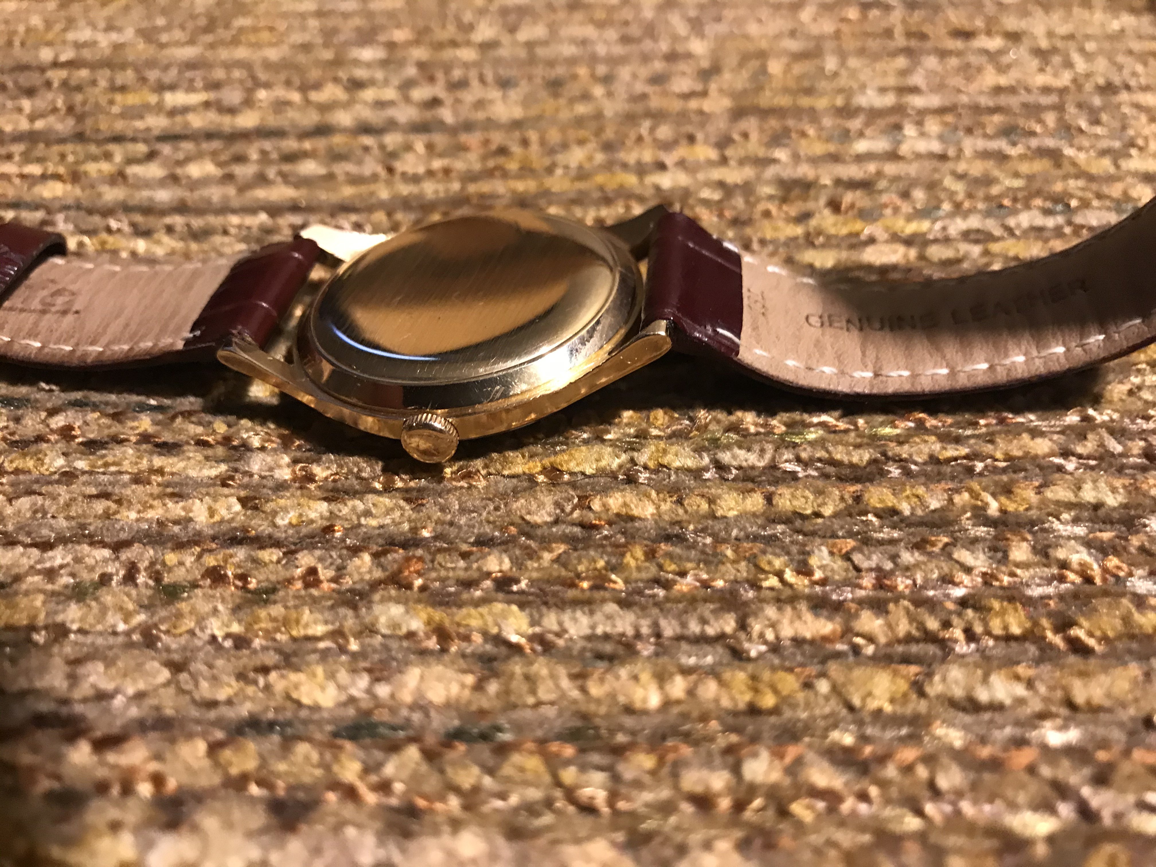 "This one is a very uncommon and early cal. 22A Longines automatic. The unpolished, 34mm snap-back case is made of 18k pink gold, perhaps leaning a bit more towards red than pink. The case is exceptional in a couple of respects. First, the lugs are slightly curved and finely beveled. I have never seen this design on any watch, and they are both elegant and beautiful without being overly ornate. Secondly, the bezel, instead of laying flush with the side of the case, actually sits on the case, with 1-1.5mm of the case extending outwards underneath it. This lends a very interesting, unusual, and attractive complexity to the watch, similar in some respects to more obvious stepped cases (which are valued highly, as it happens, by vintage Longines collectors).