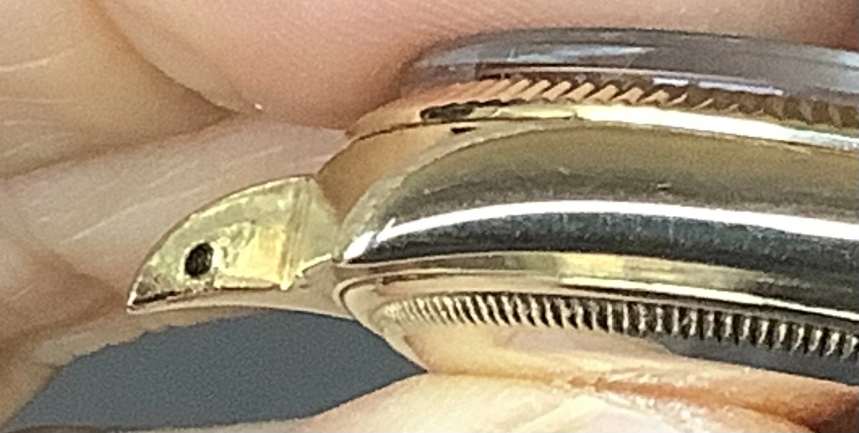 I’m thinking it was years of friction by the harder steel bars on the softer gold case. Or, possibly, the vibration caused by years of seasonal lawn mowing?