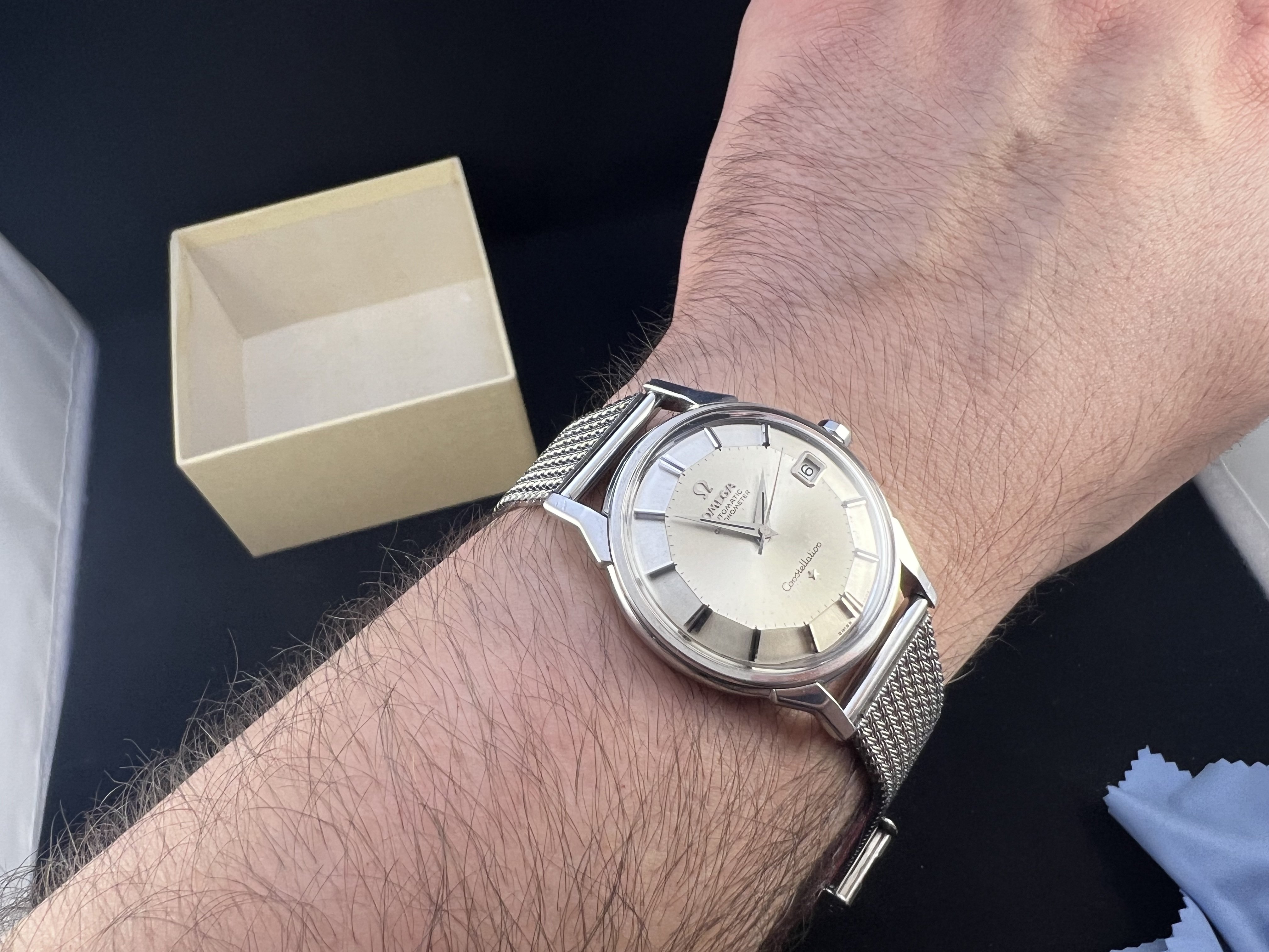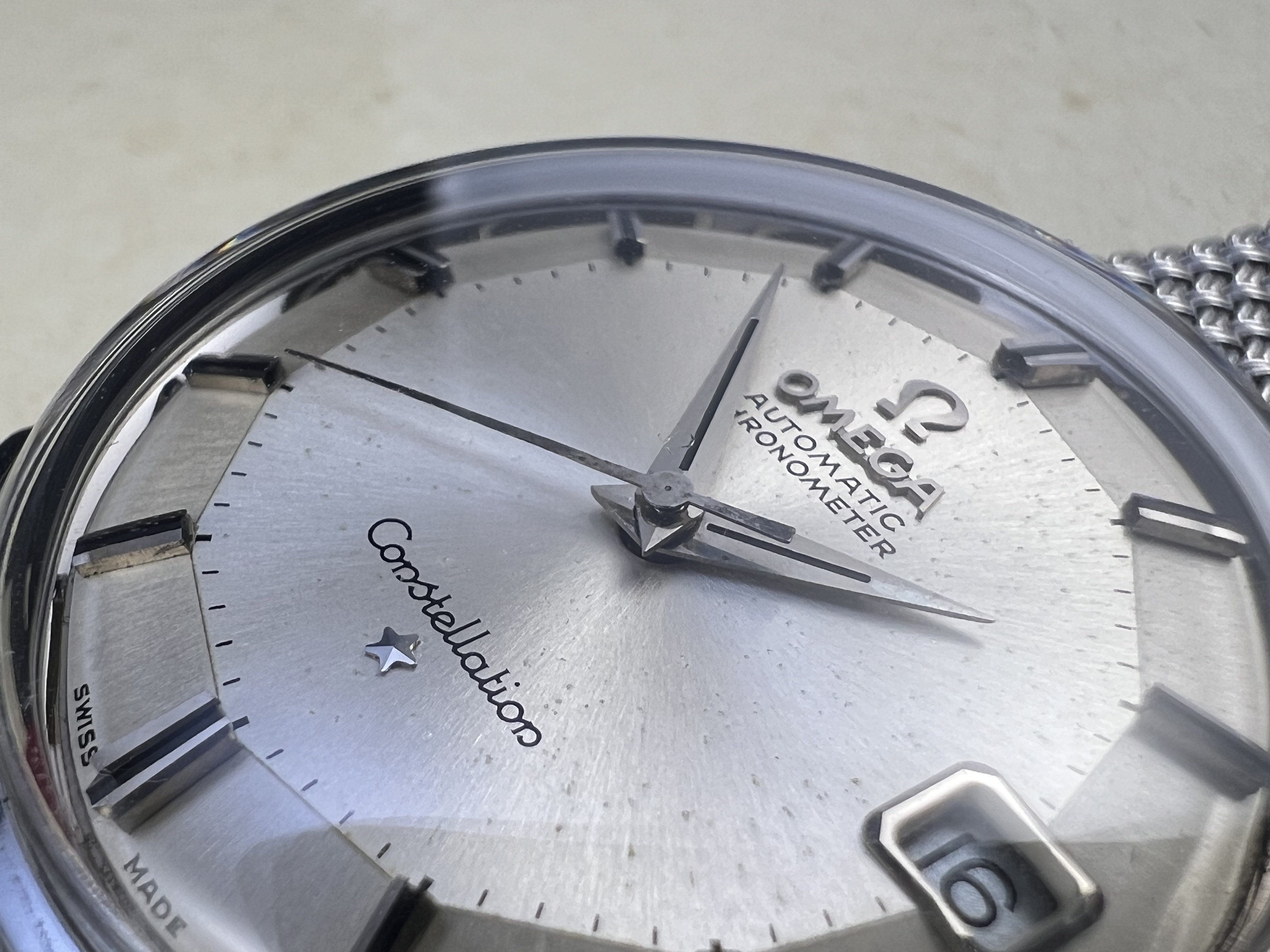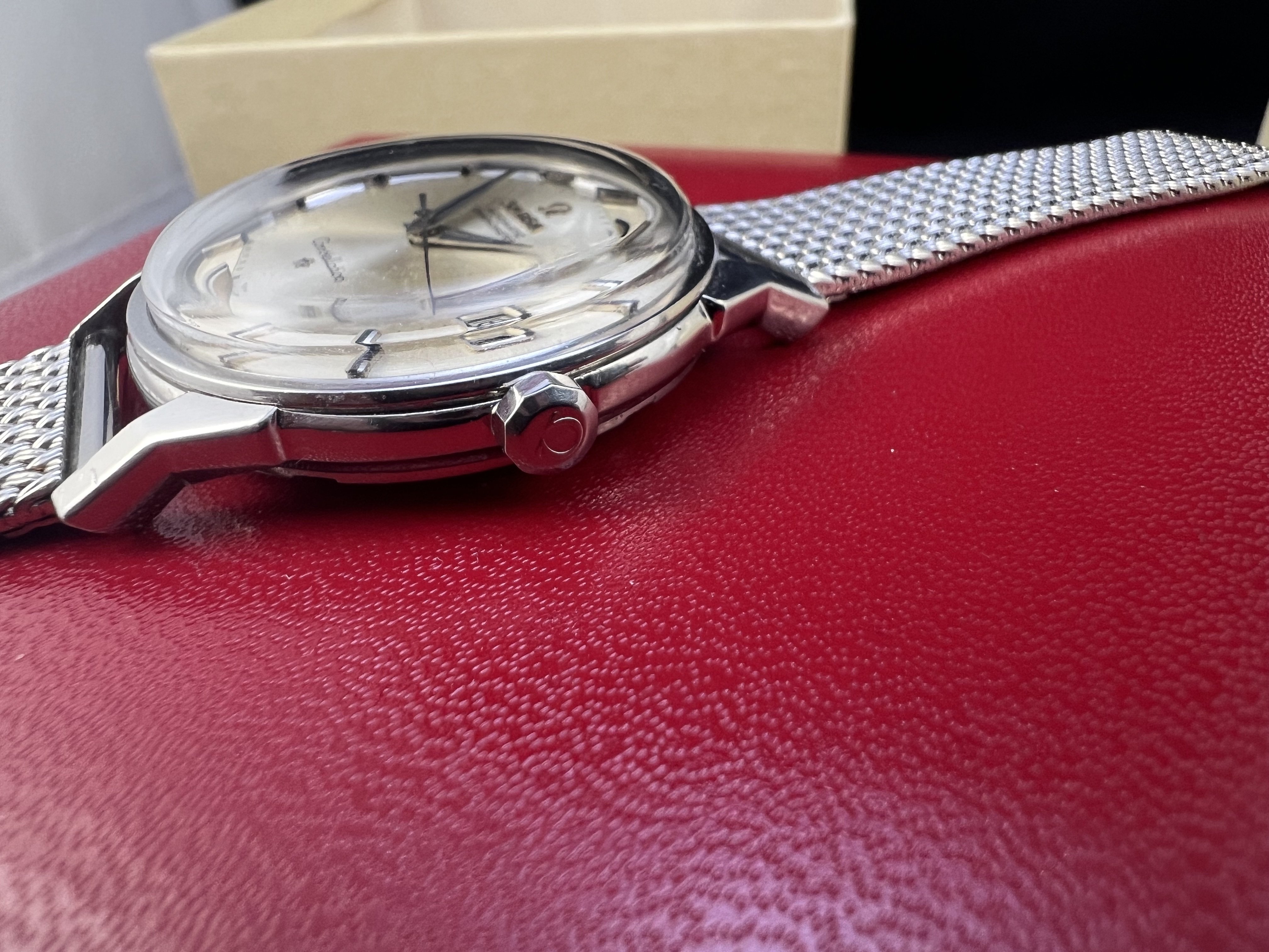 Watch is serviced and overhauled. Crystal is a NOS unused Omega signed original crystal. Bracelet is a hard to find mesh that was only sold in Japan. Time keeping after overhaul is around +0s/d with 260+ amplitude. Dial has a uniform snowfall patina, onyx inserts with the rarer arrowhead-like 6 and 12 indices.