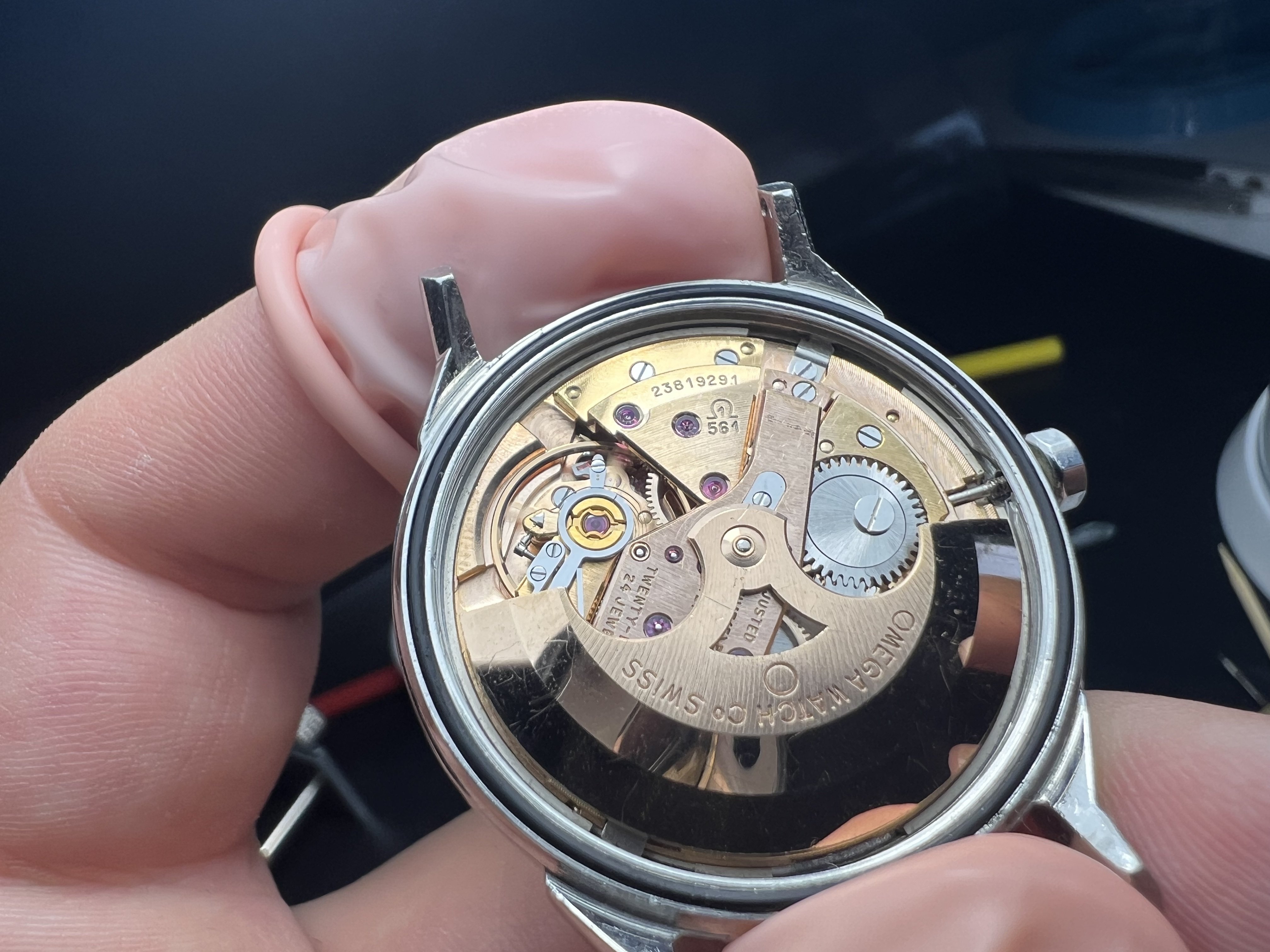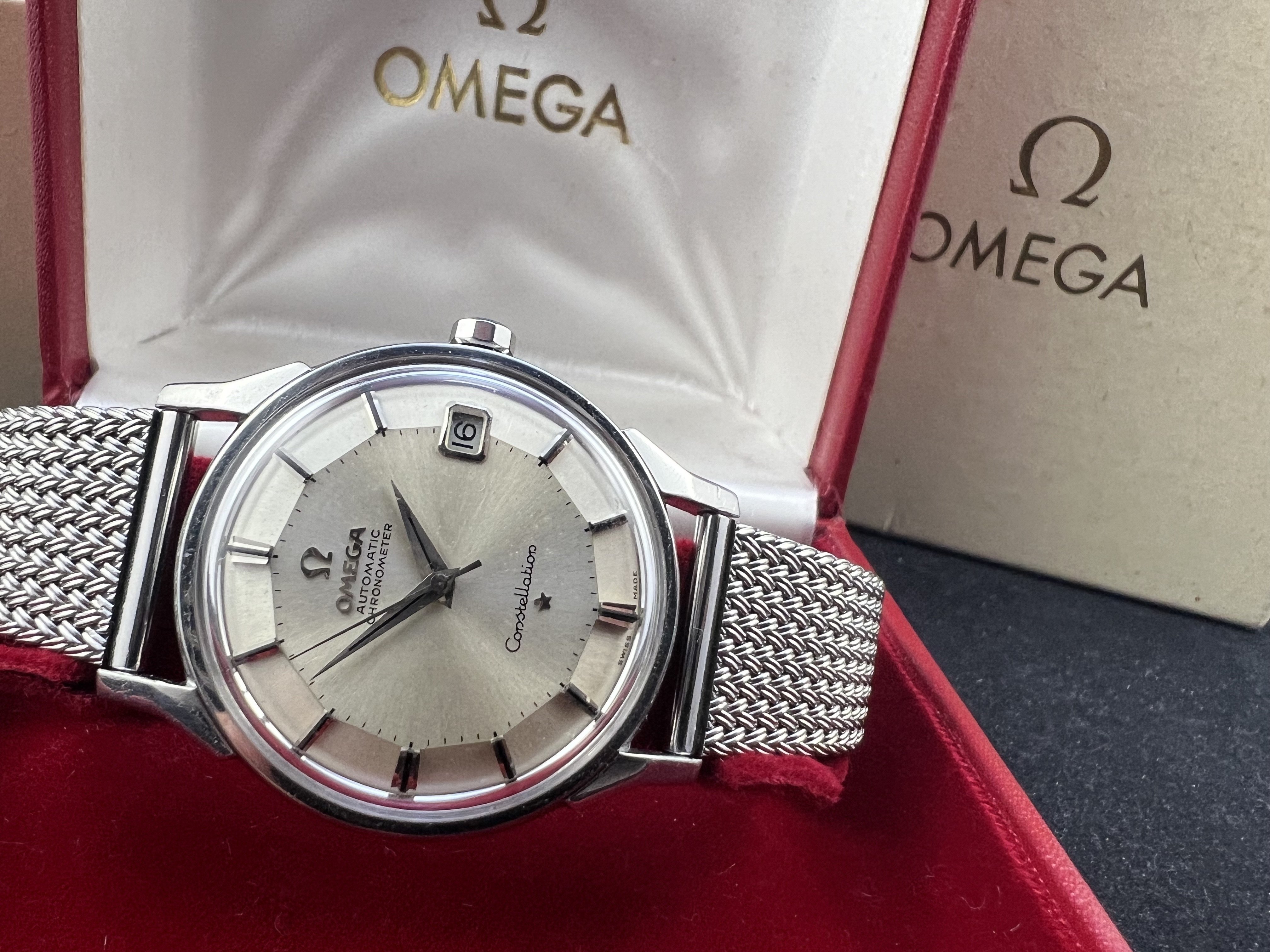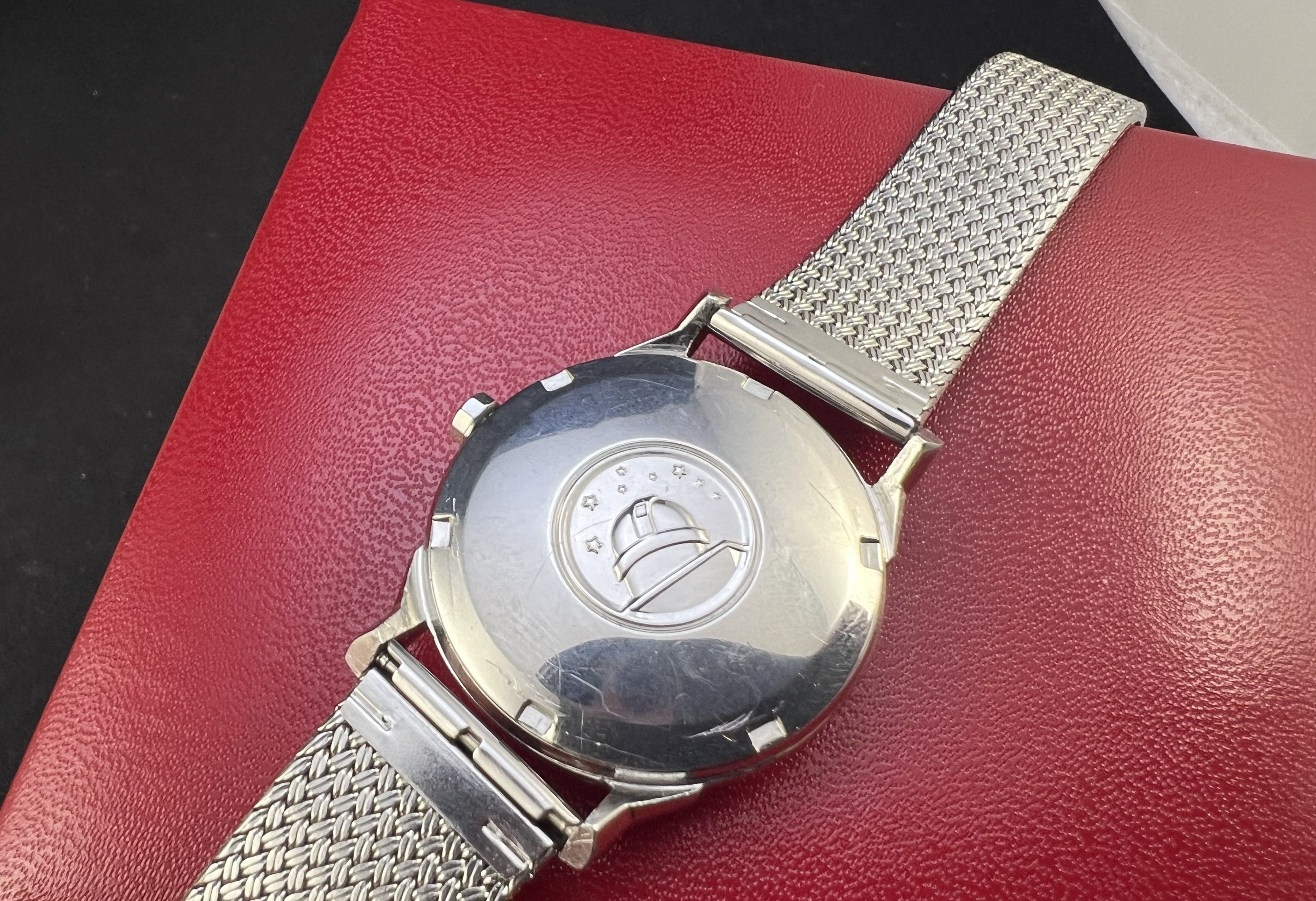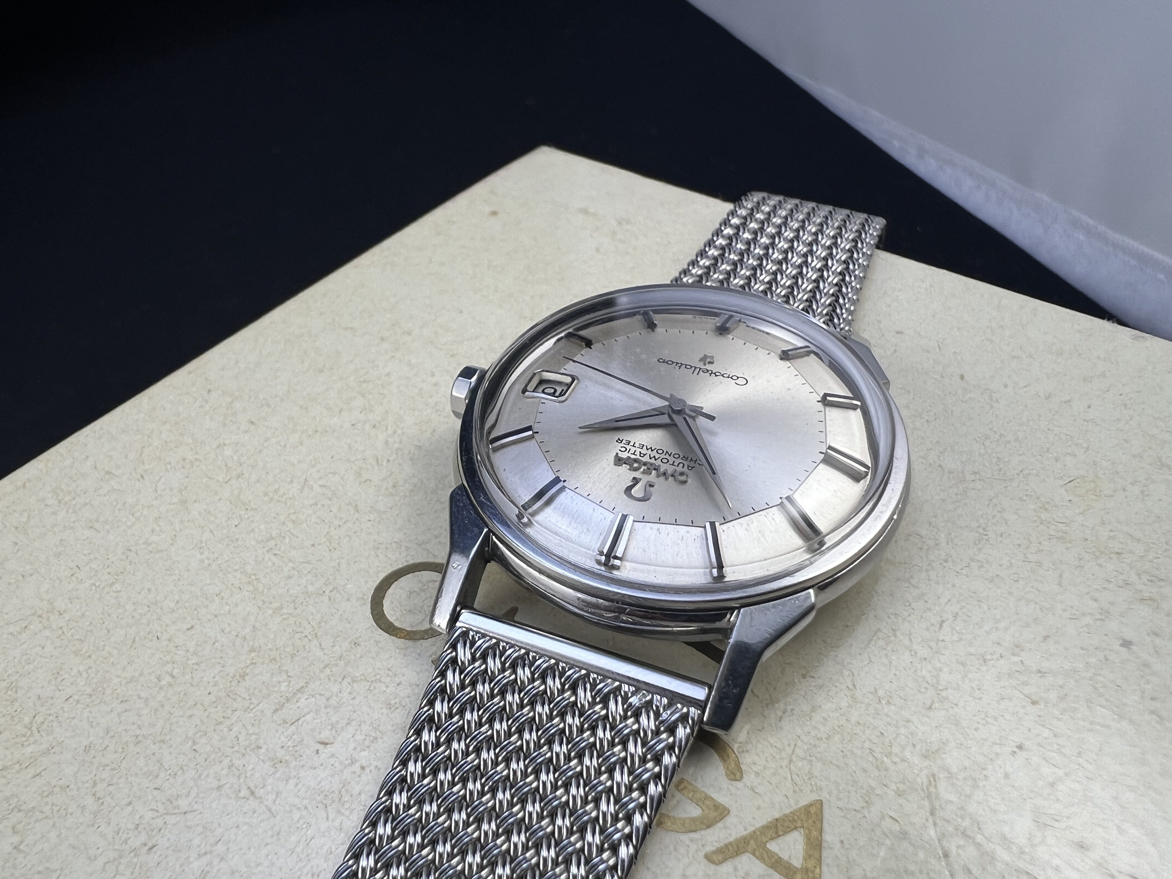Watch is serviced and overhauled. Crystal is a NOS unused Omega signed original crystal. Bracelet is a hard to find mesh that was only sold in Japan. Time keeping after overhaul is around +0s/d with 260+ amplitude. Dial has a uniform snowfall patina, onyx inserts with the rarer arrowhead-like 6 and 12 indices.