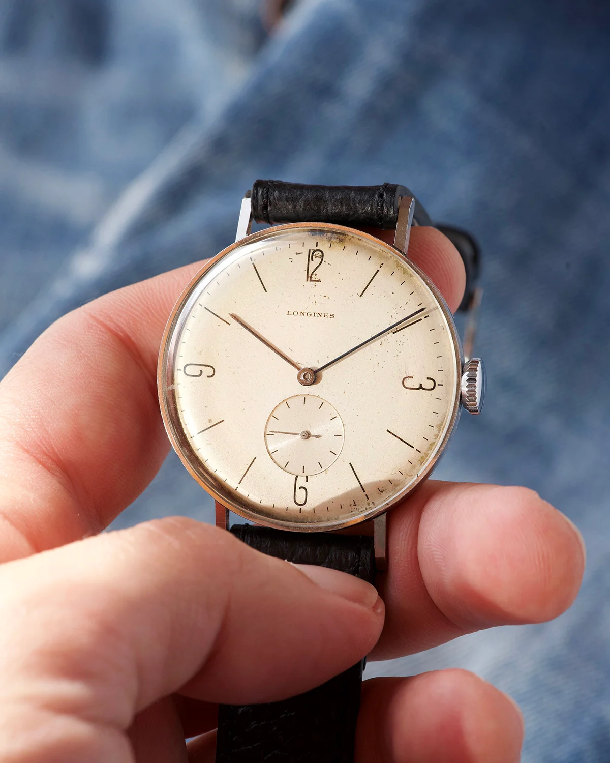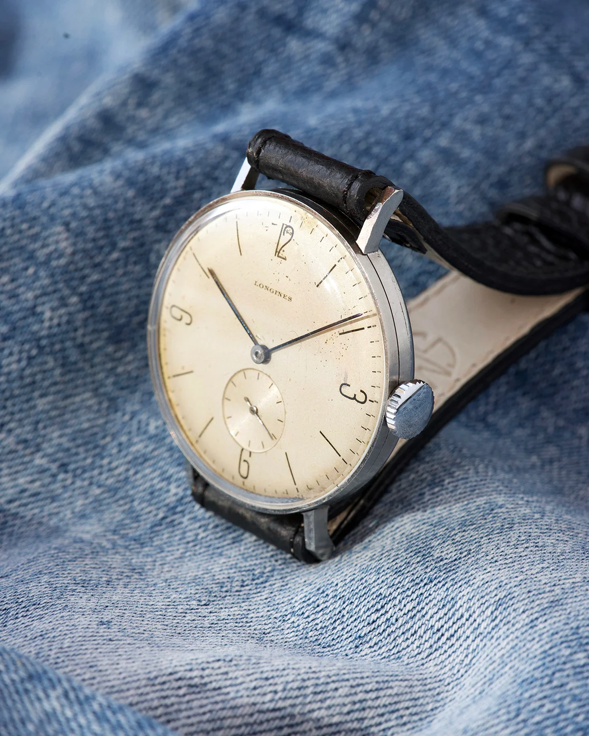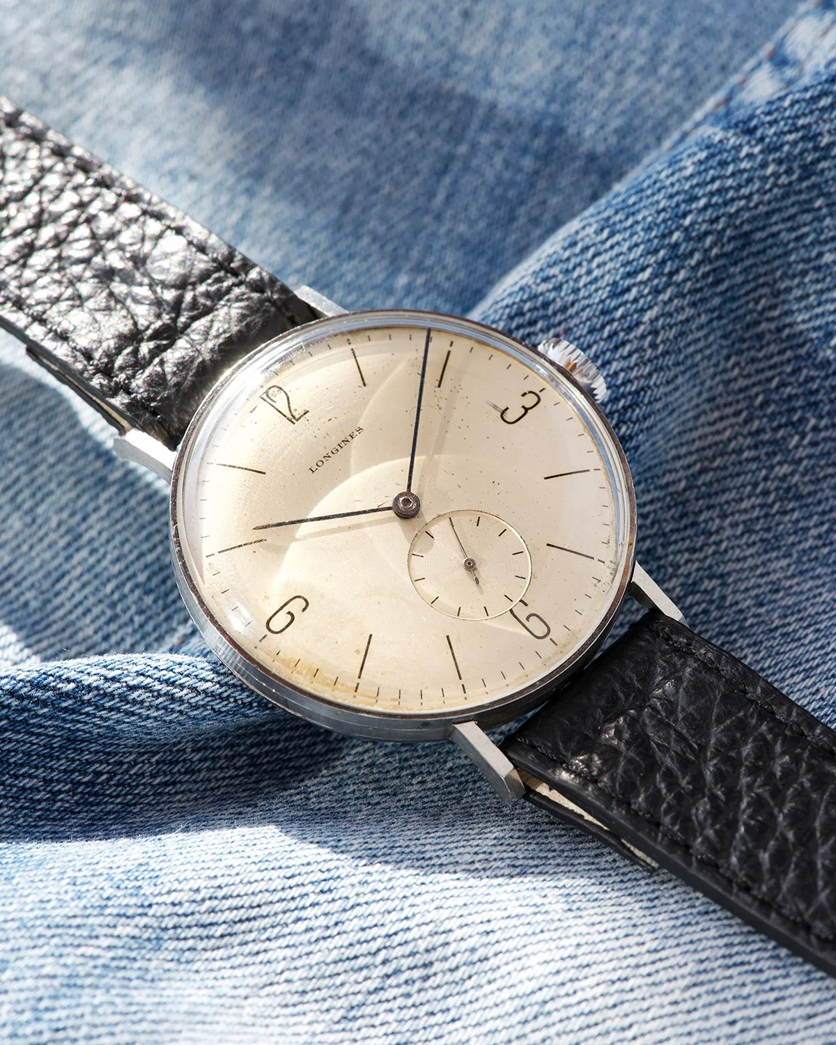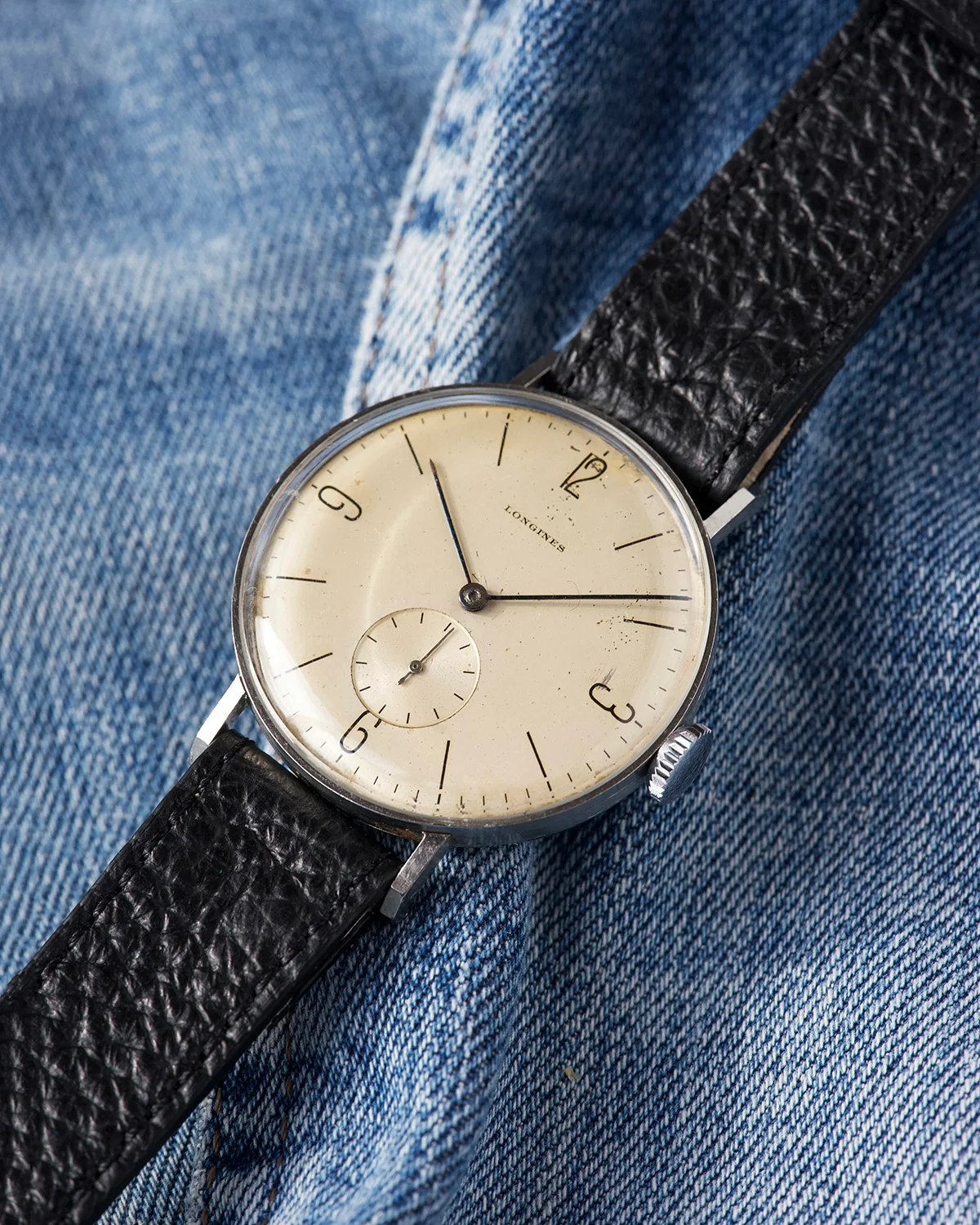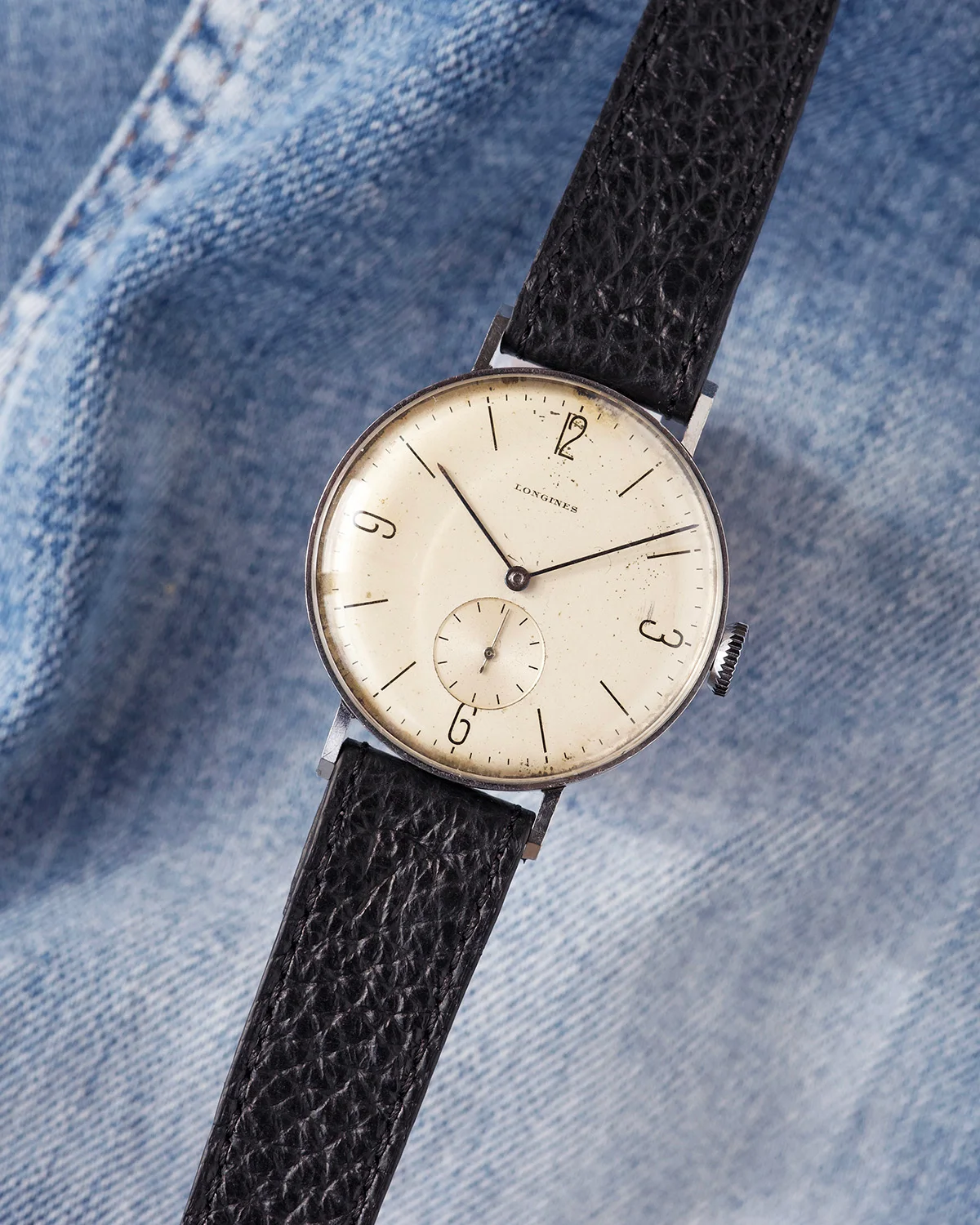 This beautiful Longines from the second half of the 1930s embodies timeless charm and understated elegance. Its 38mm steel case - remarkably modern for its era - gives it a strong wrist presence and proportions that still feel incredibly contemporary today.Case is unpolished, never touched. Dial has a lovely light creamy patina, Bauhaus indexes are super nice. Of course dial is original, never reprinted.