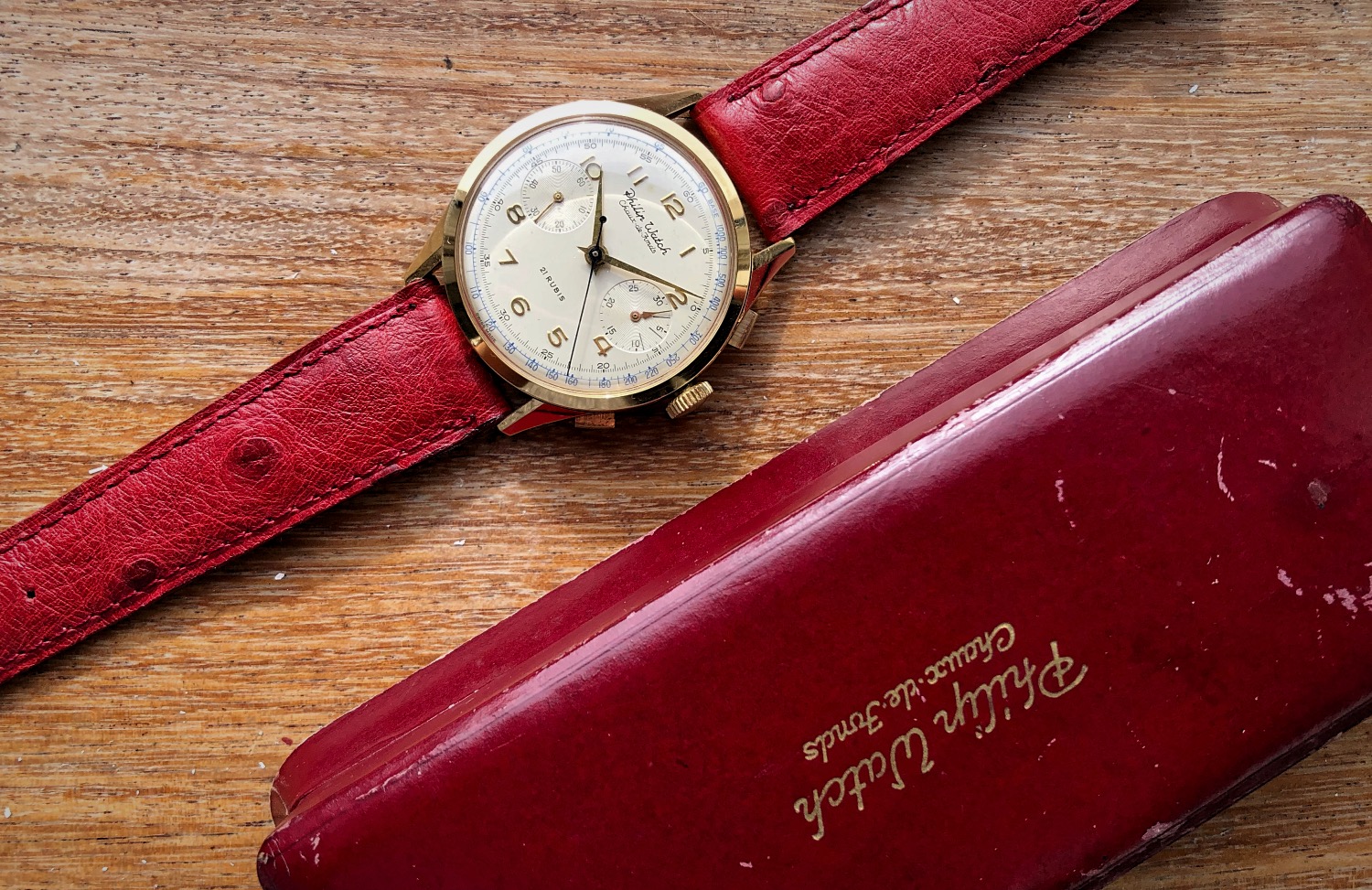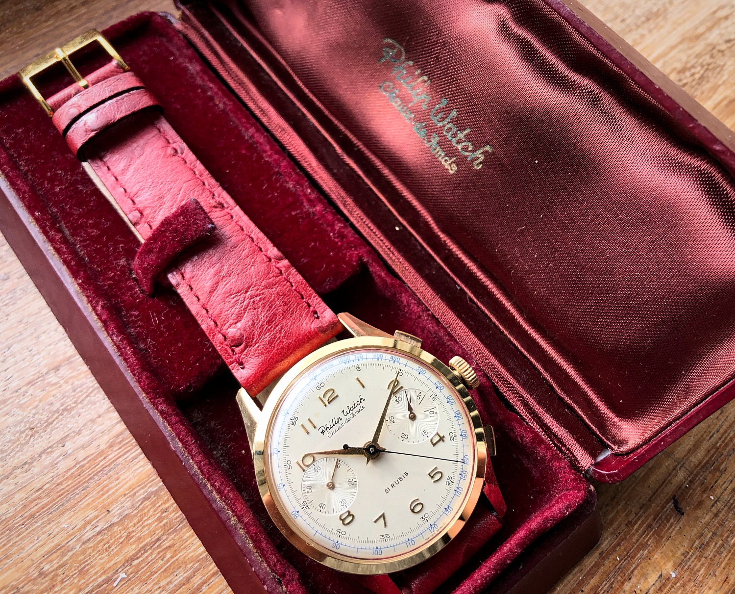 Last but not least, this watch comes with its original and super-rare bachelite box, Philip Watch signed! A real time capsule box!
