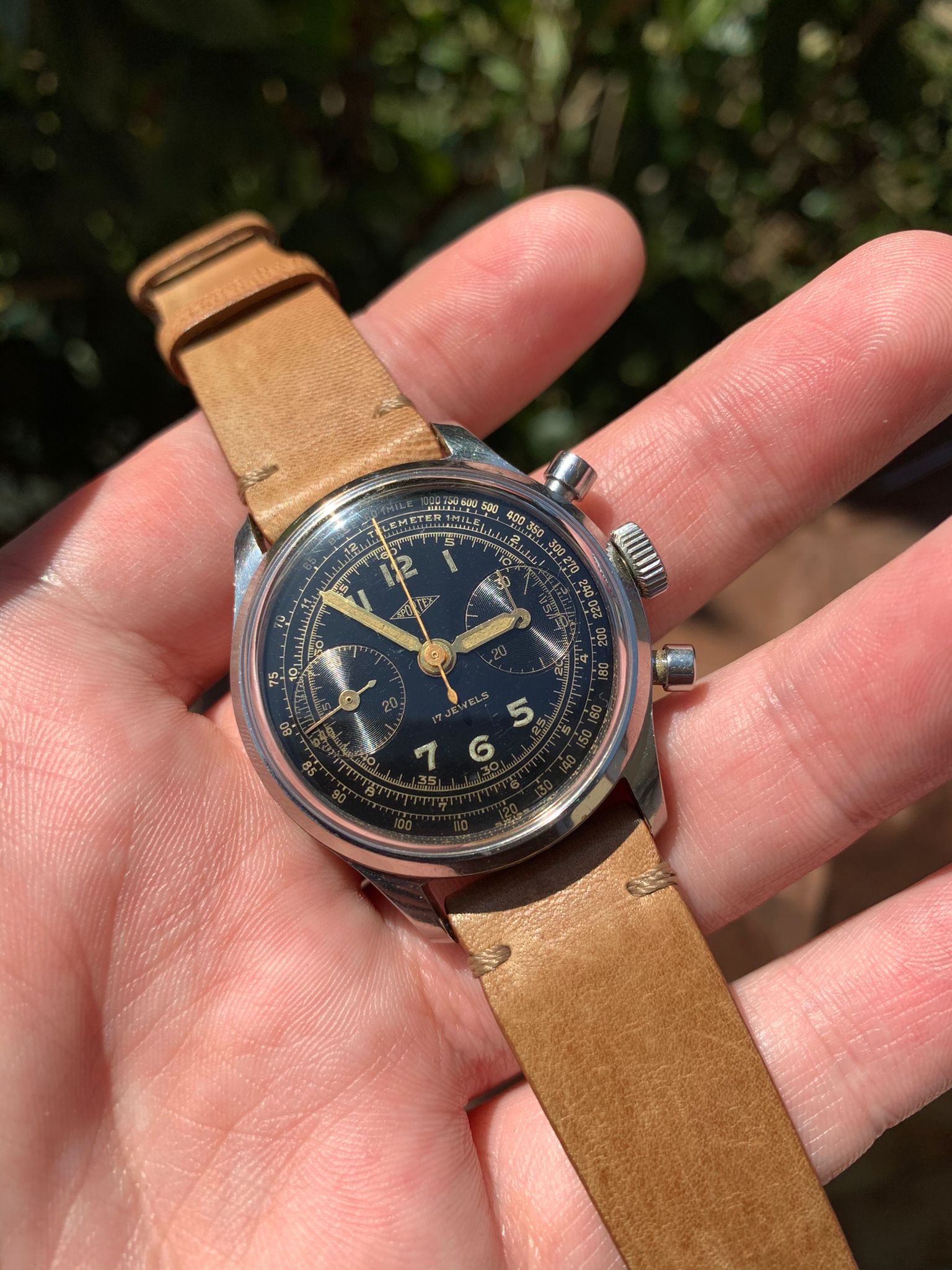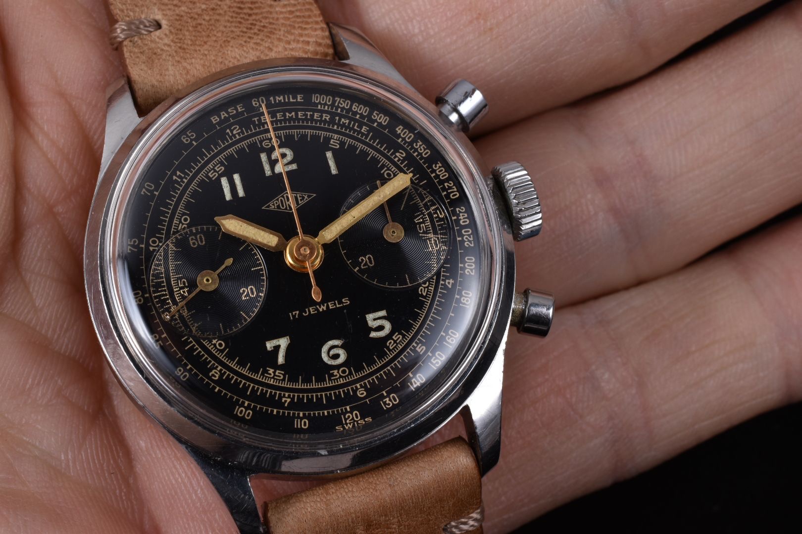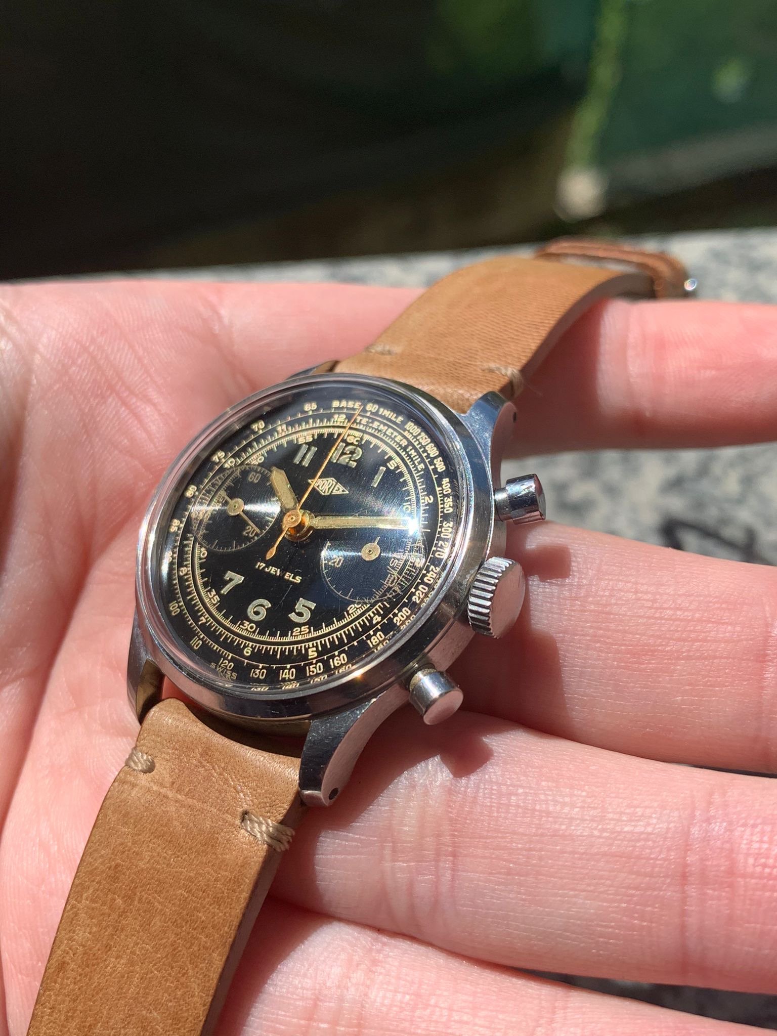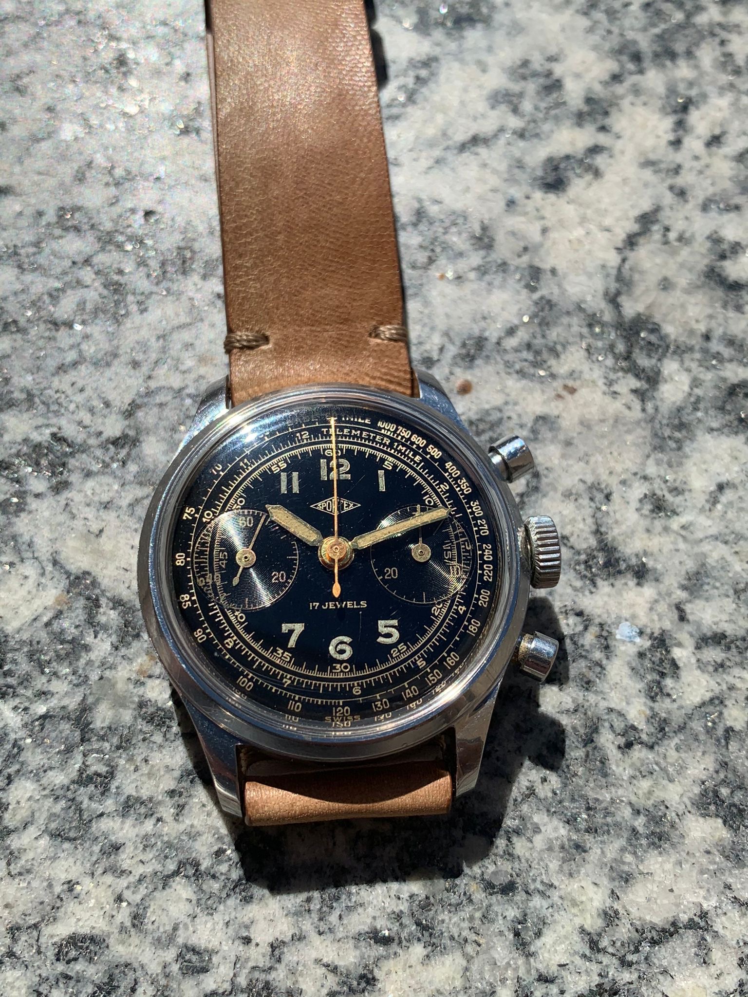 I have for sale a very attractive Sportex gilt chronograph manufactured in the 40's, with an amazing multiscale dial and beautiful waterproof clamshell style case with screw-in caseback and round pushers.