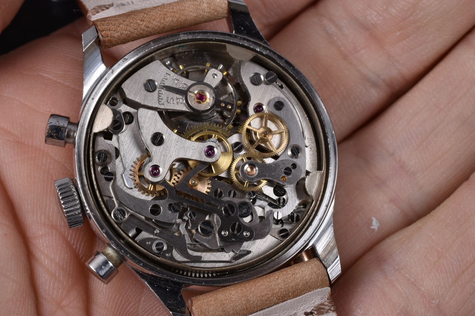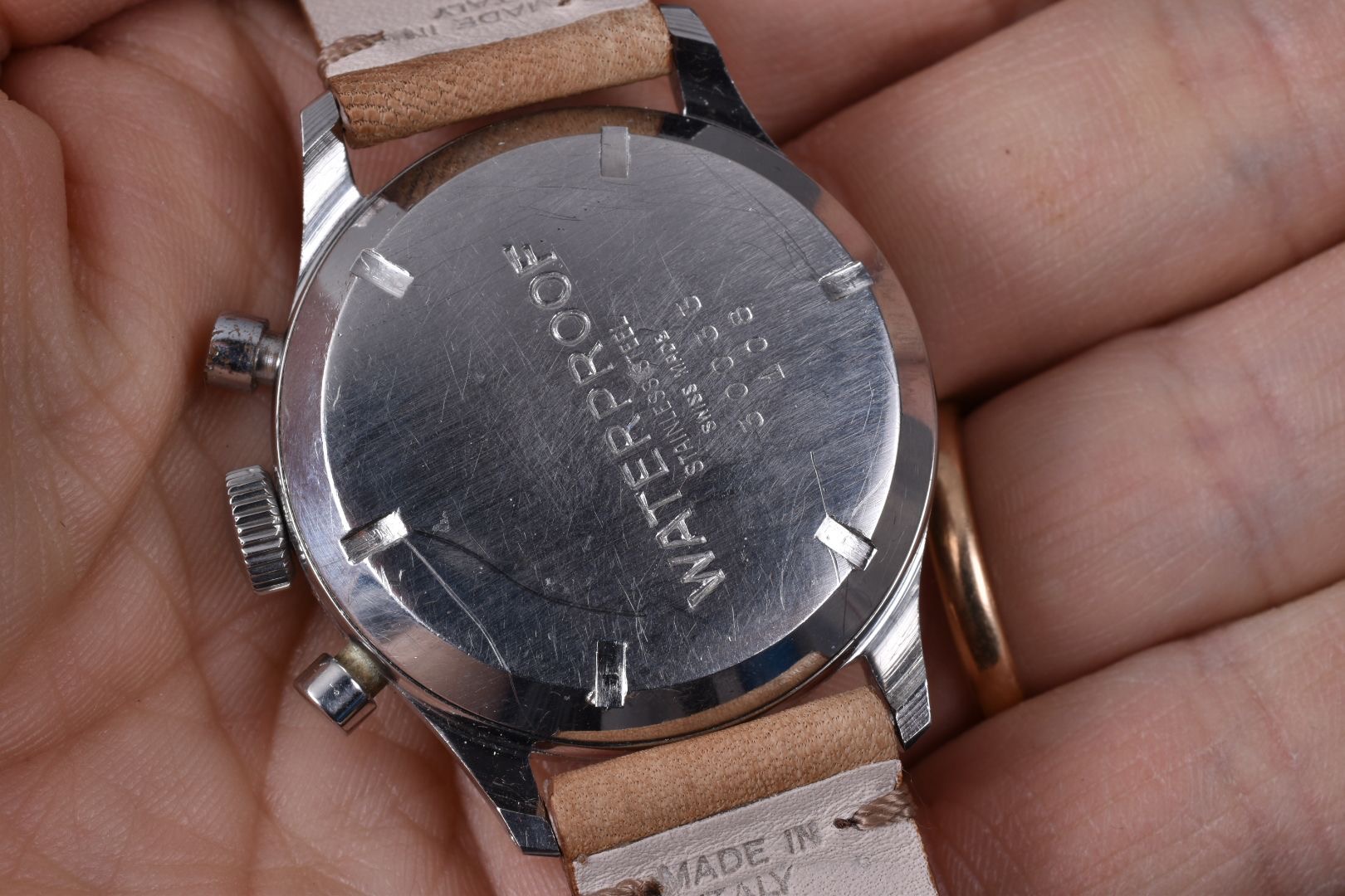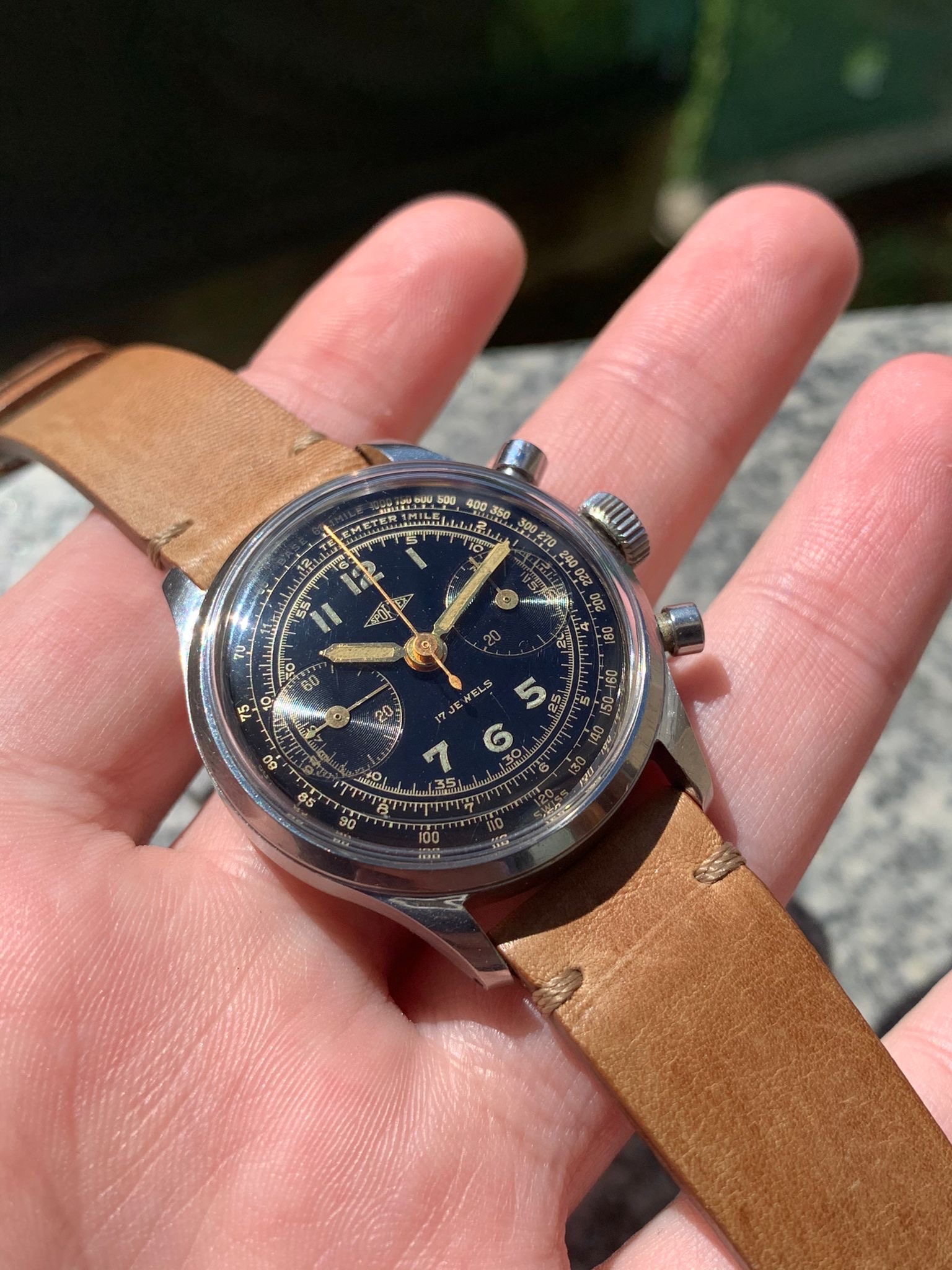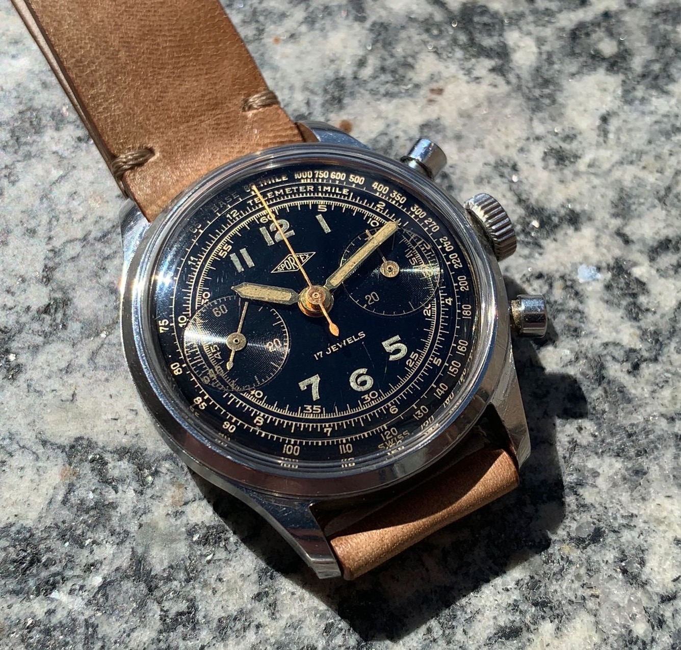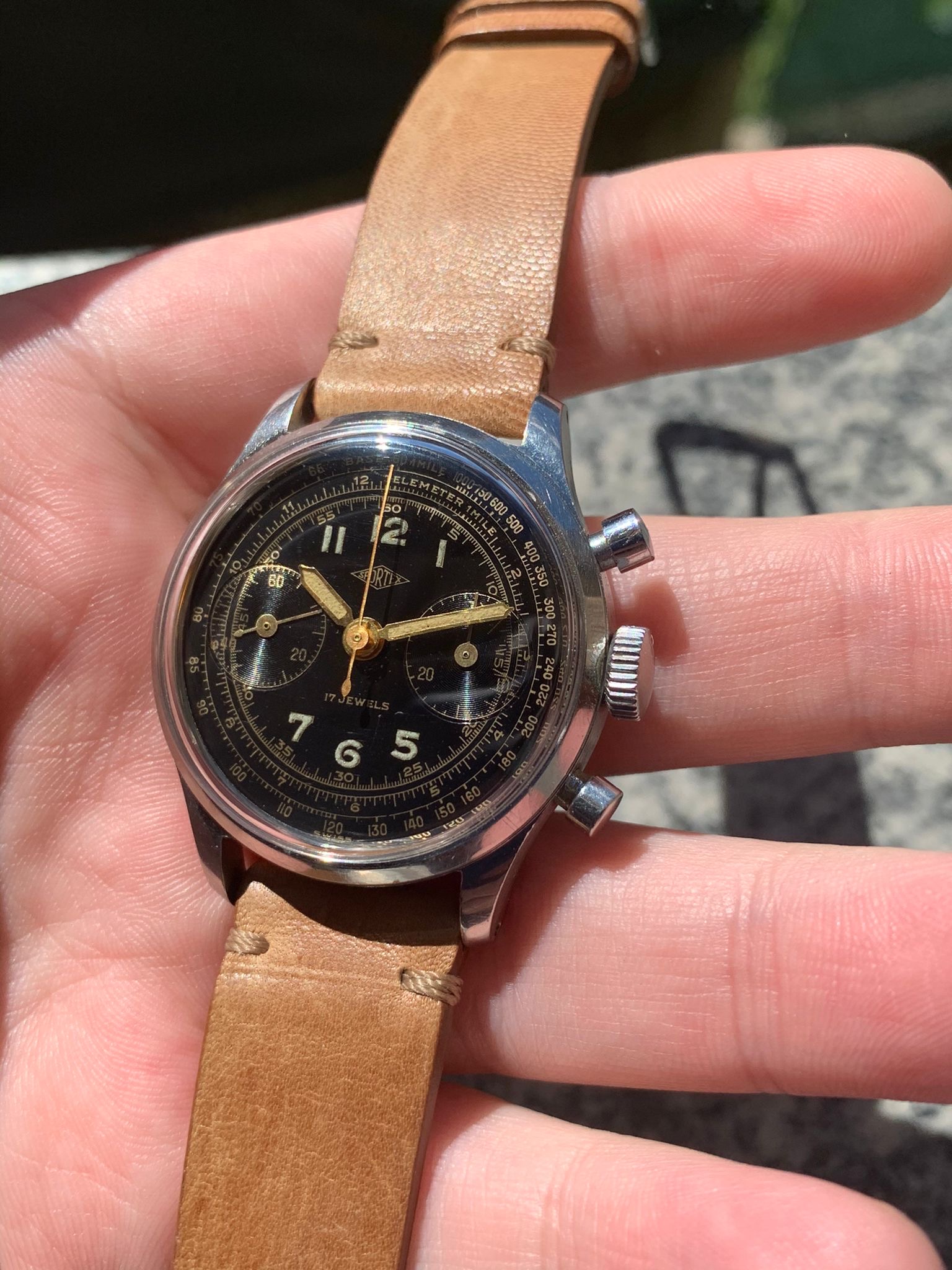 I have for sale a very attractive Sportex gilt chronograph manufactured in the 40's, with an amazing multiscale dial and beautiful waterproof clamshell style case with screw-in caseback and round pushers.