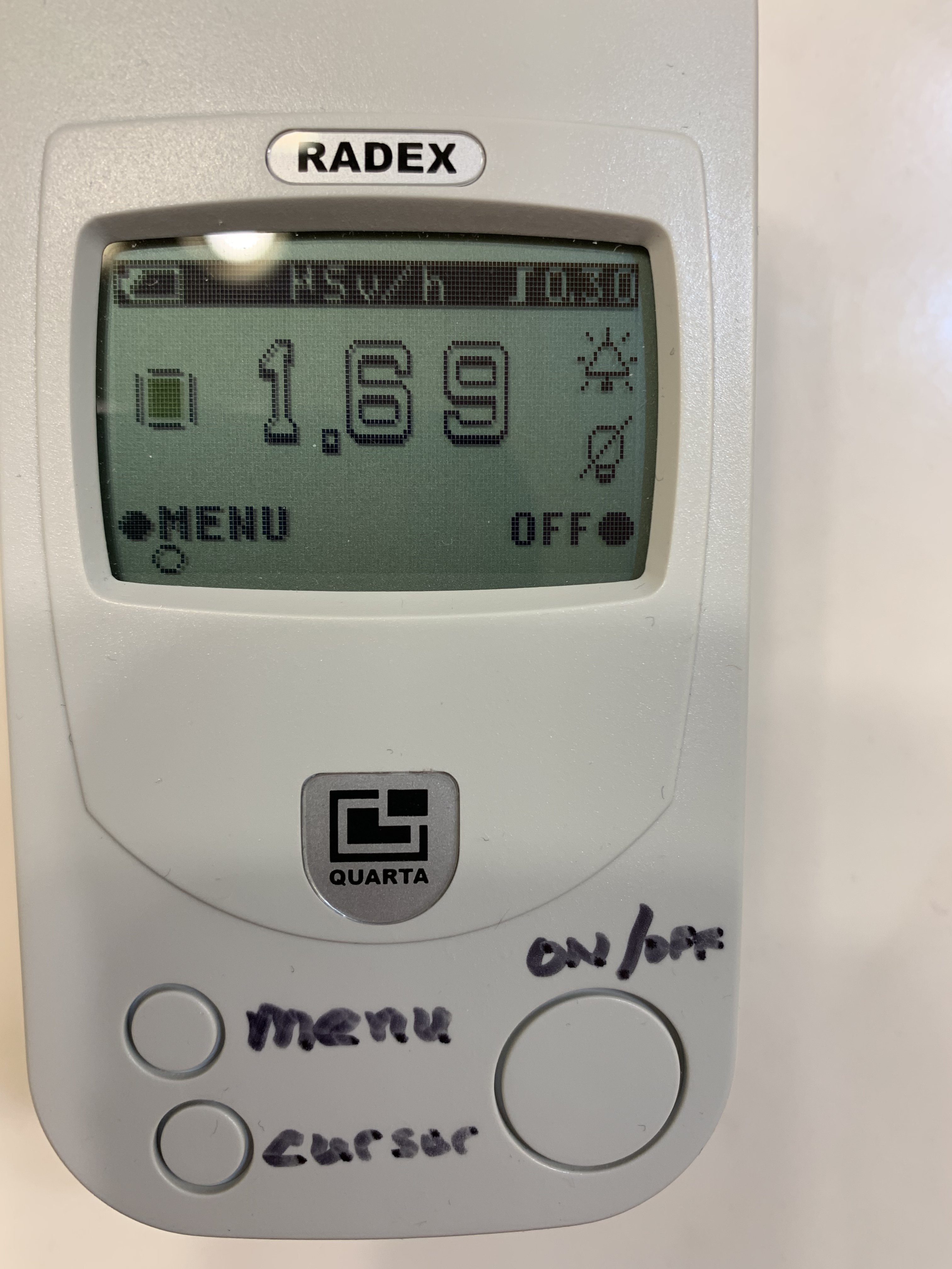 The Radex Geiger reads 1.69 milliseiverts per hour. Under UV, to he hands and lume plots are green radium glow.