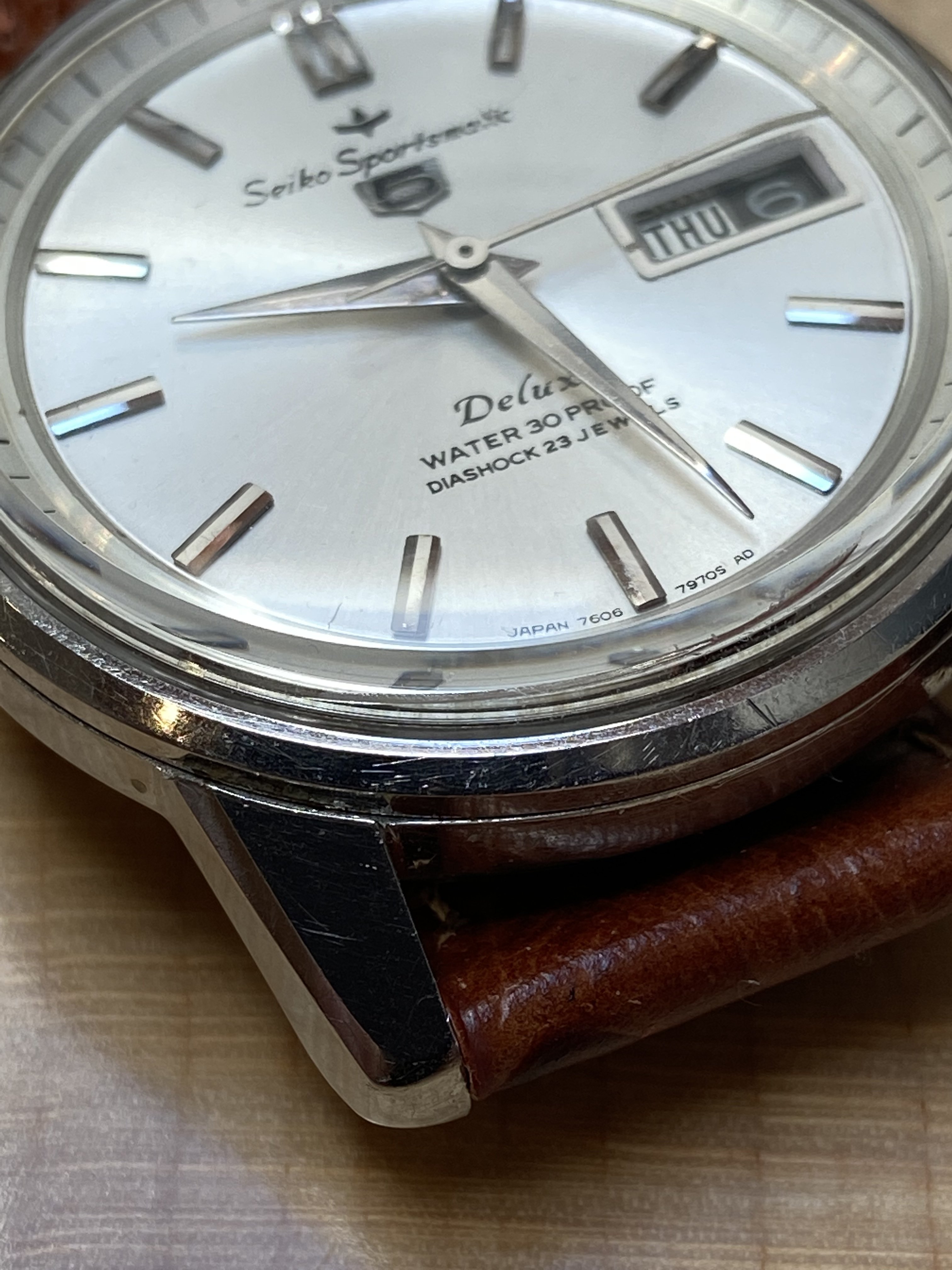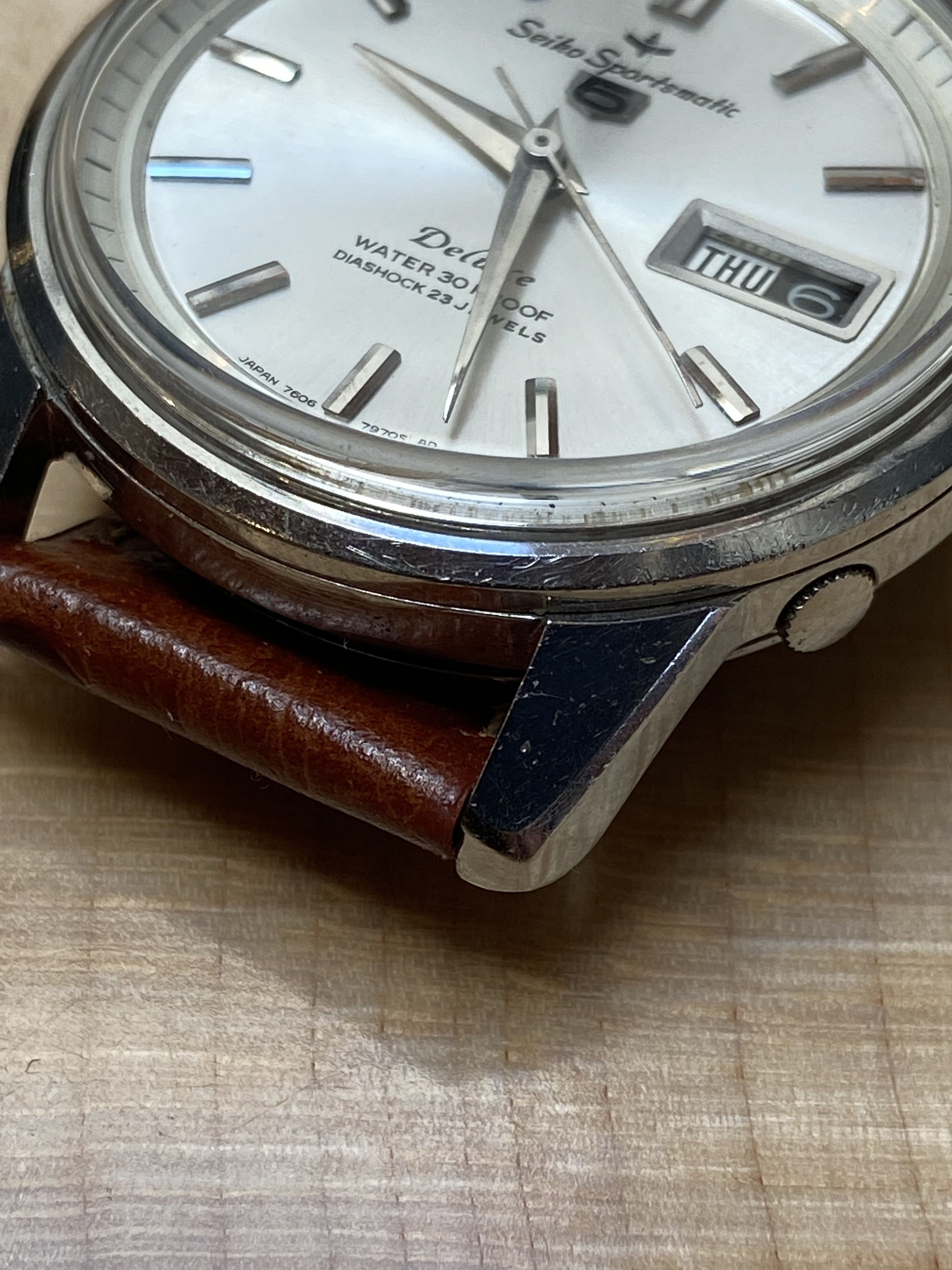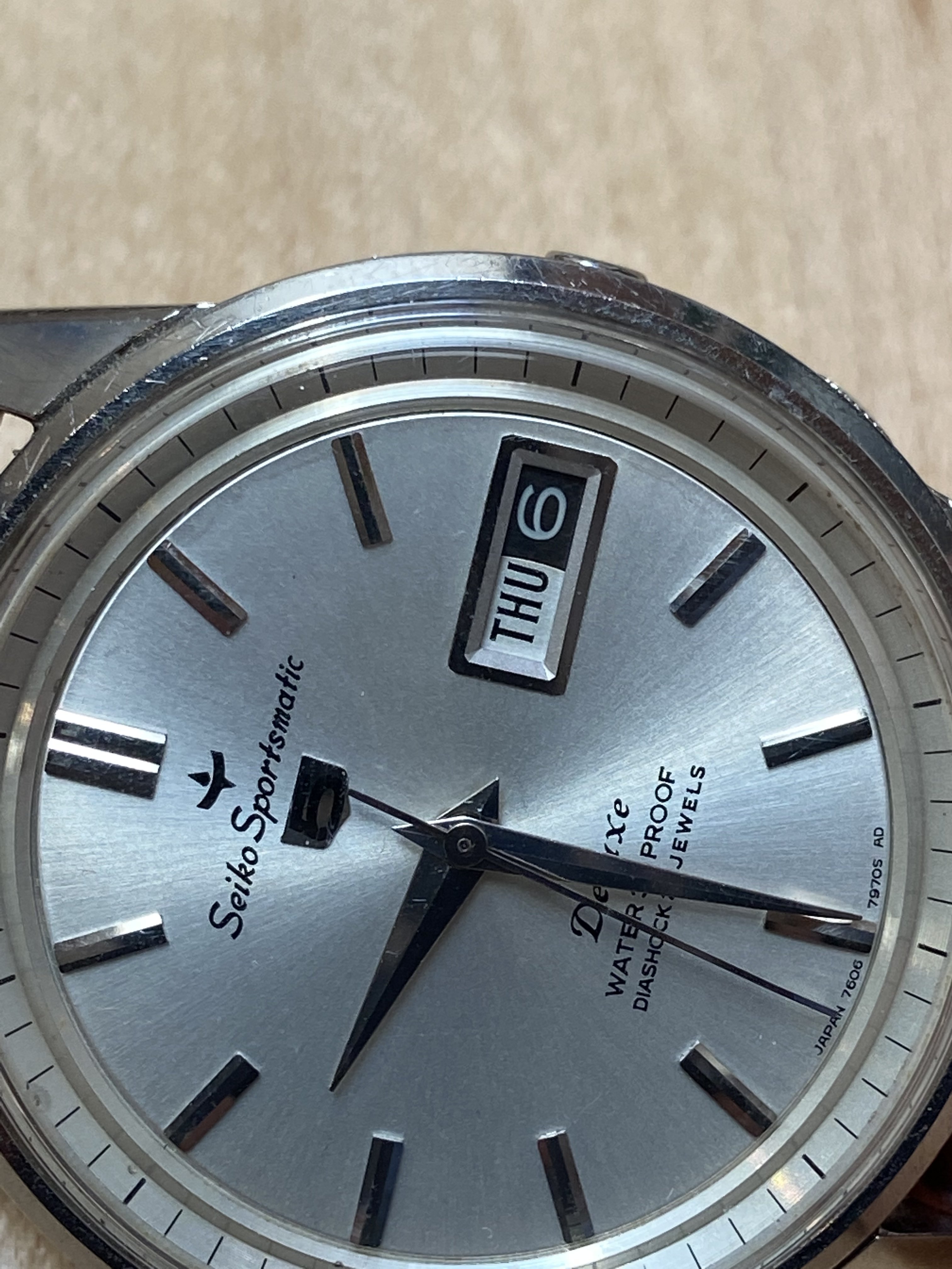 Second is a 7606-7971 Seiko Sportsmatic 5 "Deluxe" with sunburst dial and applied markers, 37mm wide, 19mm lug width. Good looking watch, running, setting, working well all in all. Again no service records or pressure tests so assume it is not water resistant. Case is pretty clean with all lug bevels still in place with good lines. Some wear to back logo, not sharp but still visible. Quick note; this is the older style with quick set date, which works properly, but does not have the quick set feature for the day, just the date like some older Rolex models did.