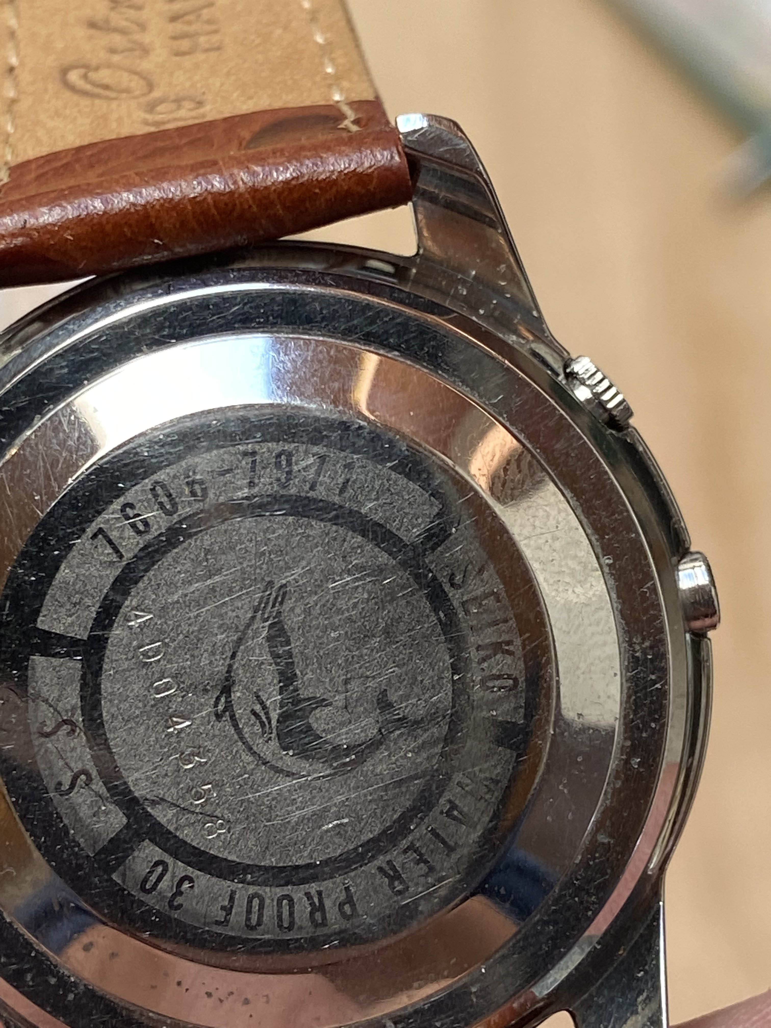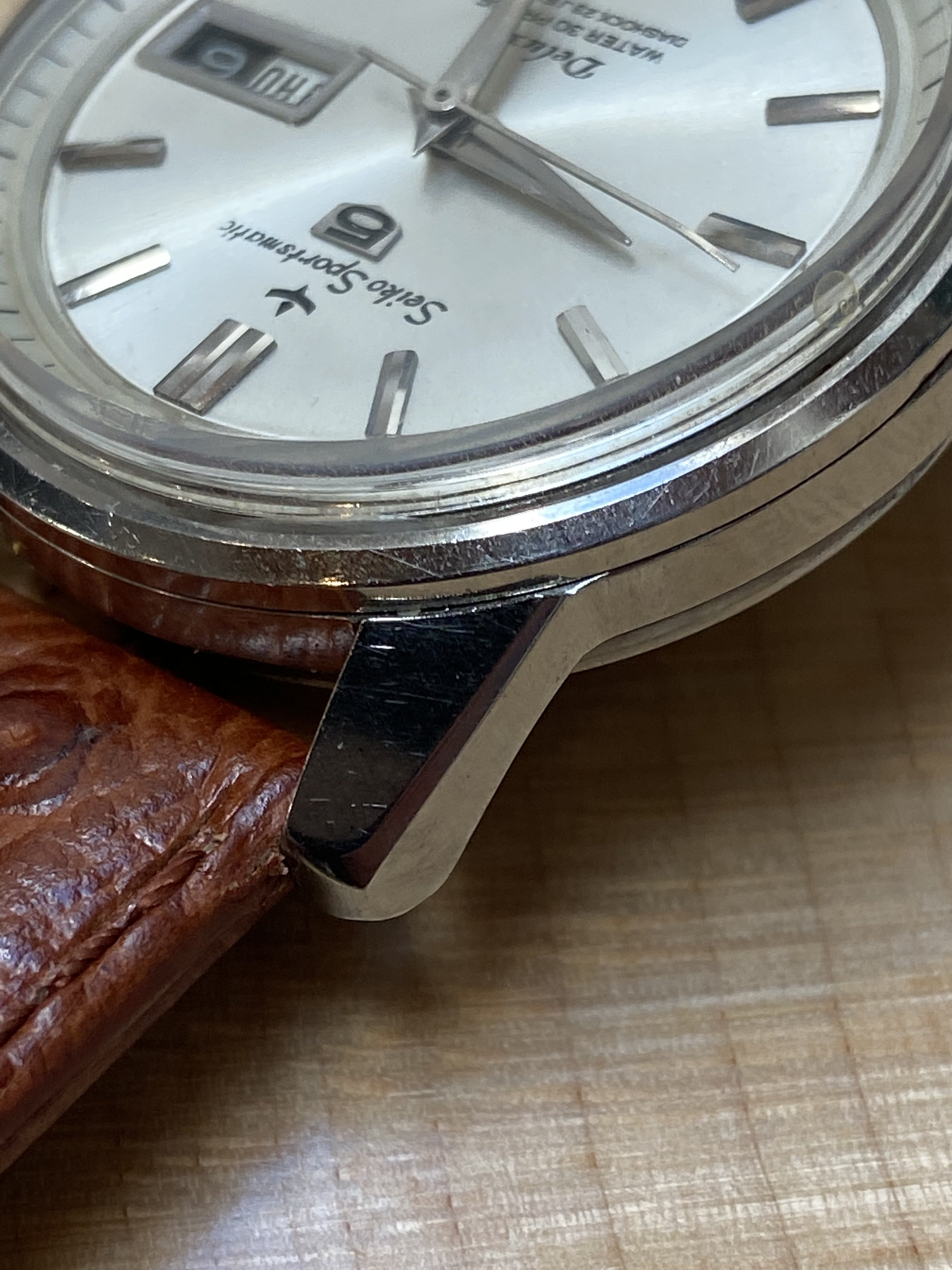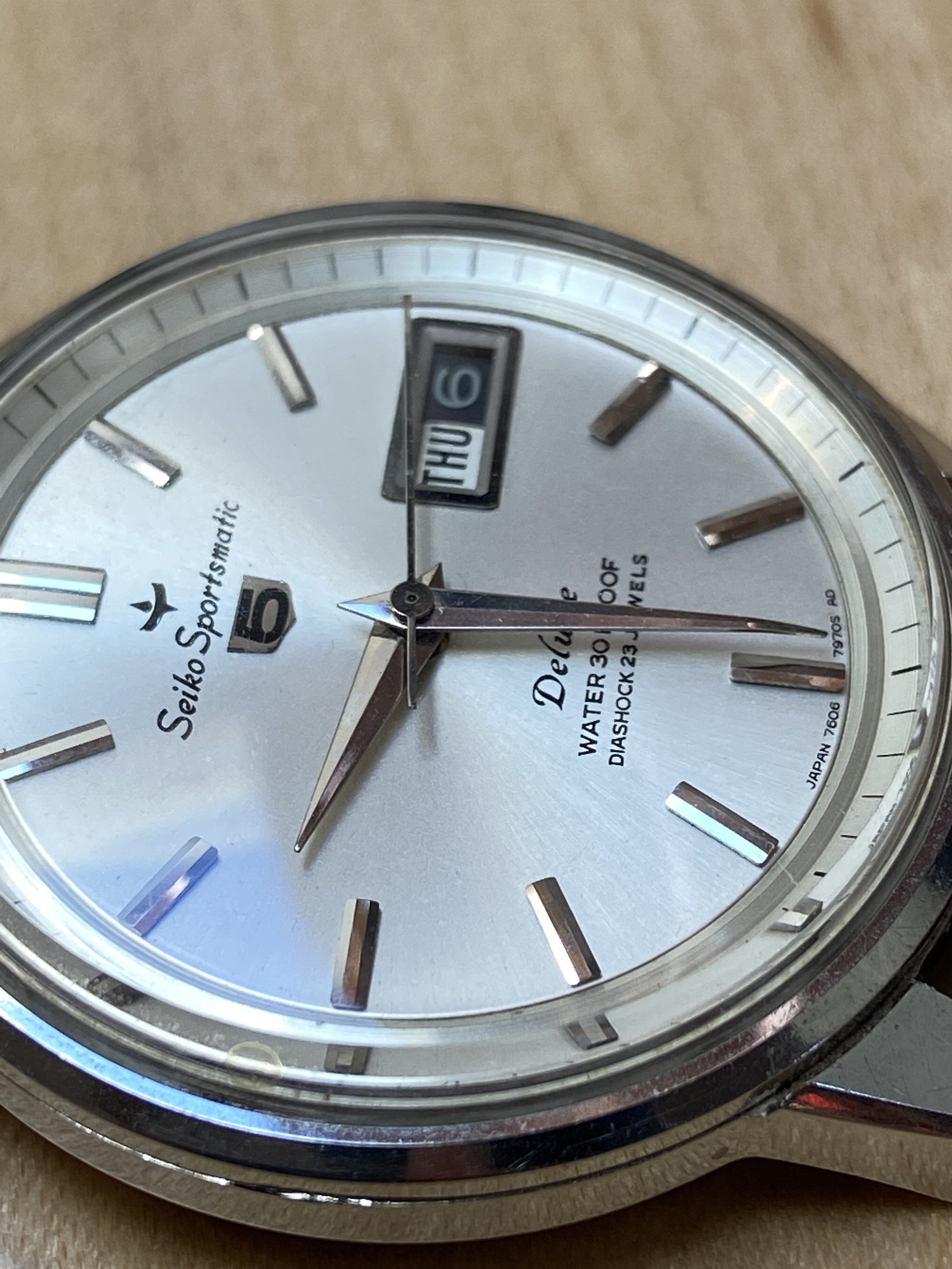 Second is a 7606-7971 Seiko Sportsmatic 5 "Deluxe" with sunburst dial and applied markers, 37mm wide, 19mm lug width. Good looking watch, running, setting, working well all in all. Again no service records or pressure tests so assume it is not water resistant. Case is pretty clean with all lug bevels still in place with good lines. Some wear to back logo, not sharp but still visible. Quick note; this is the older style with quick set date, which works properly, but does not have the quick set feature for the day, just the date like some older Rolex models did.