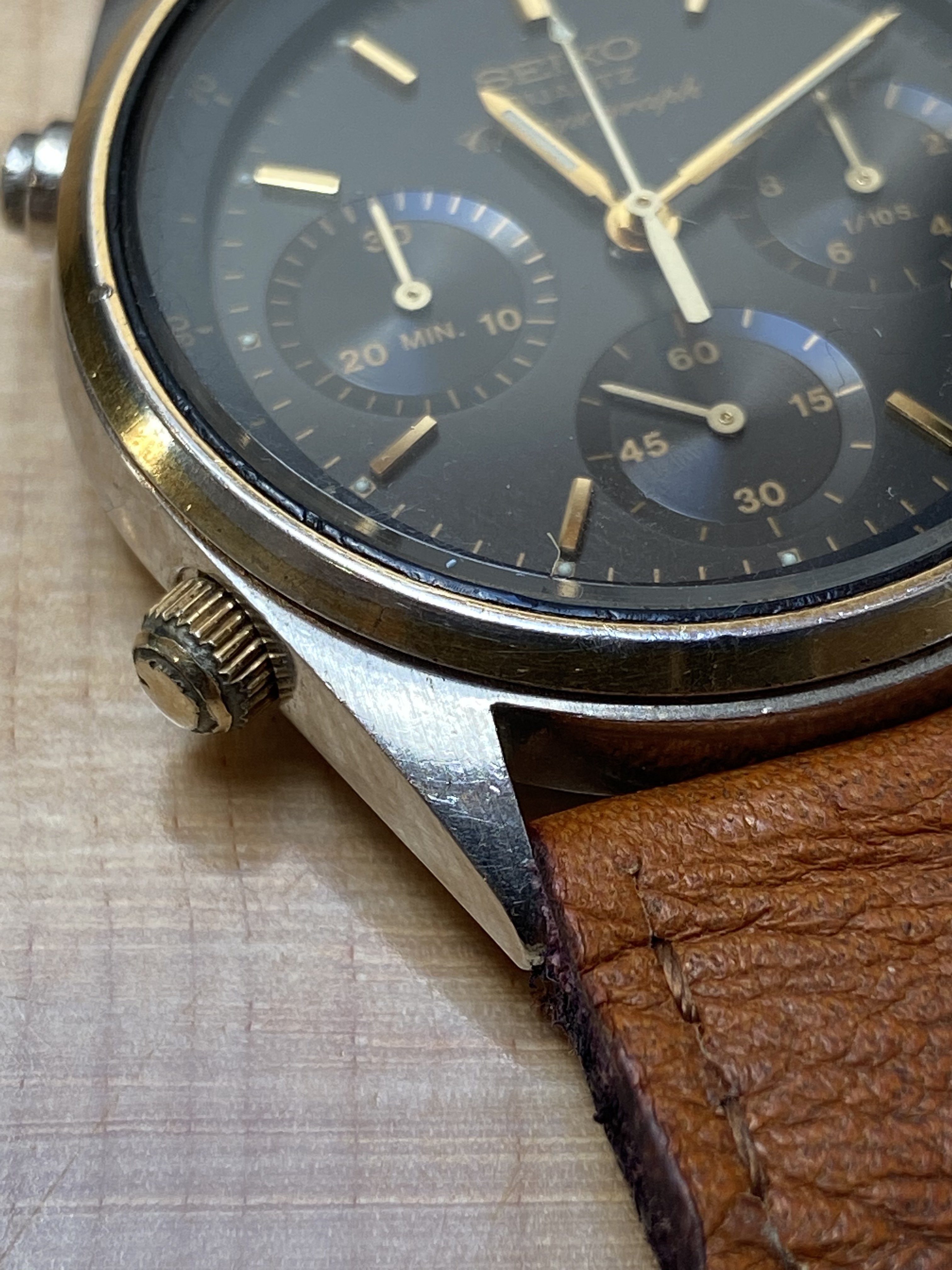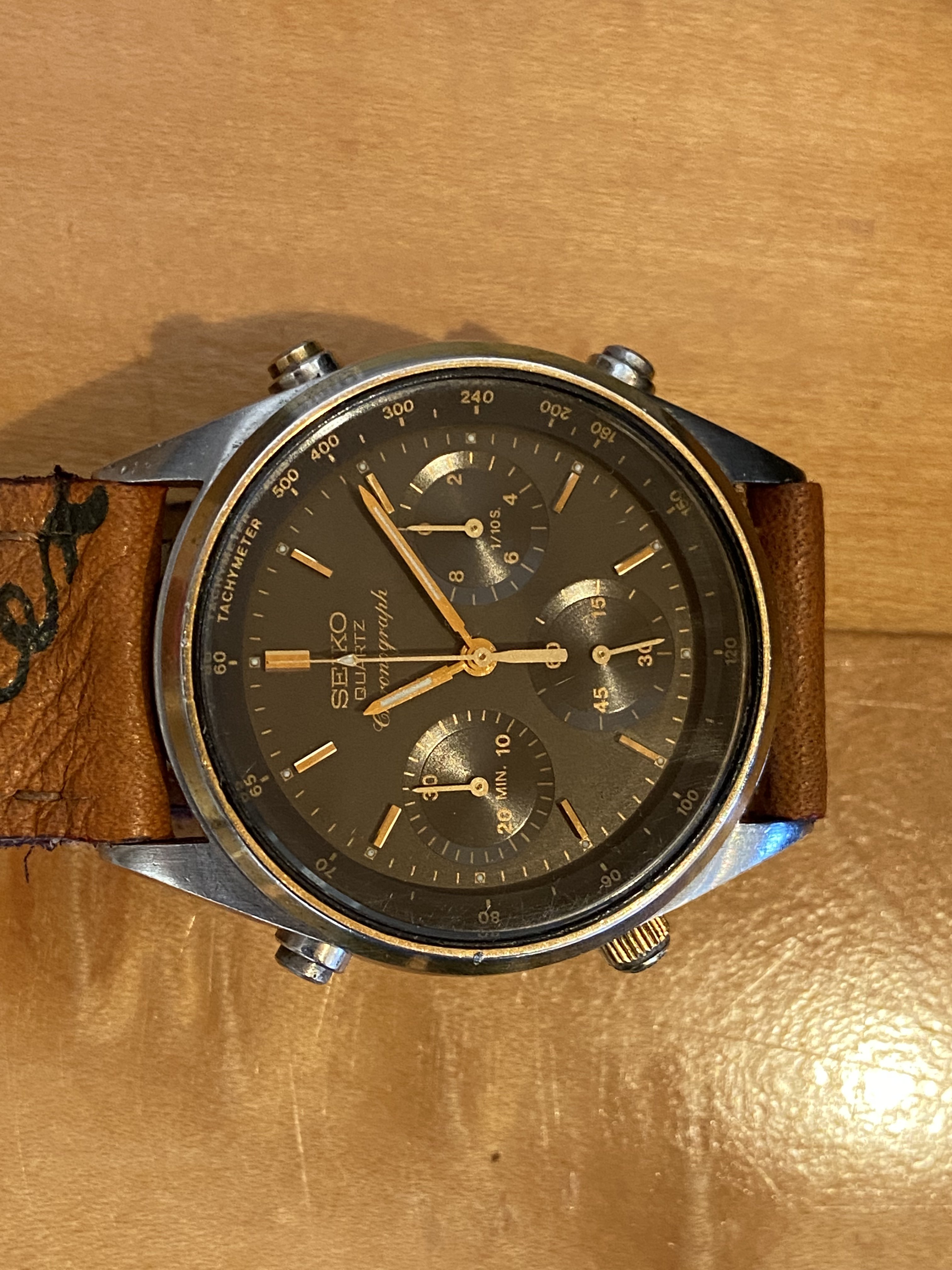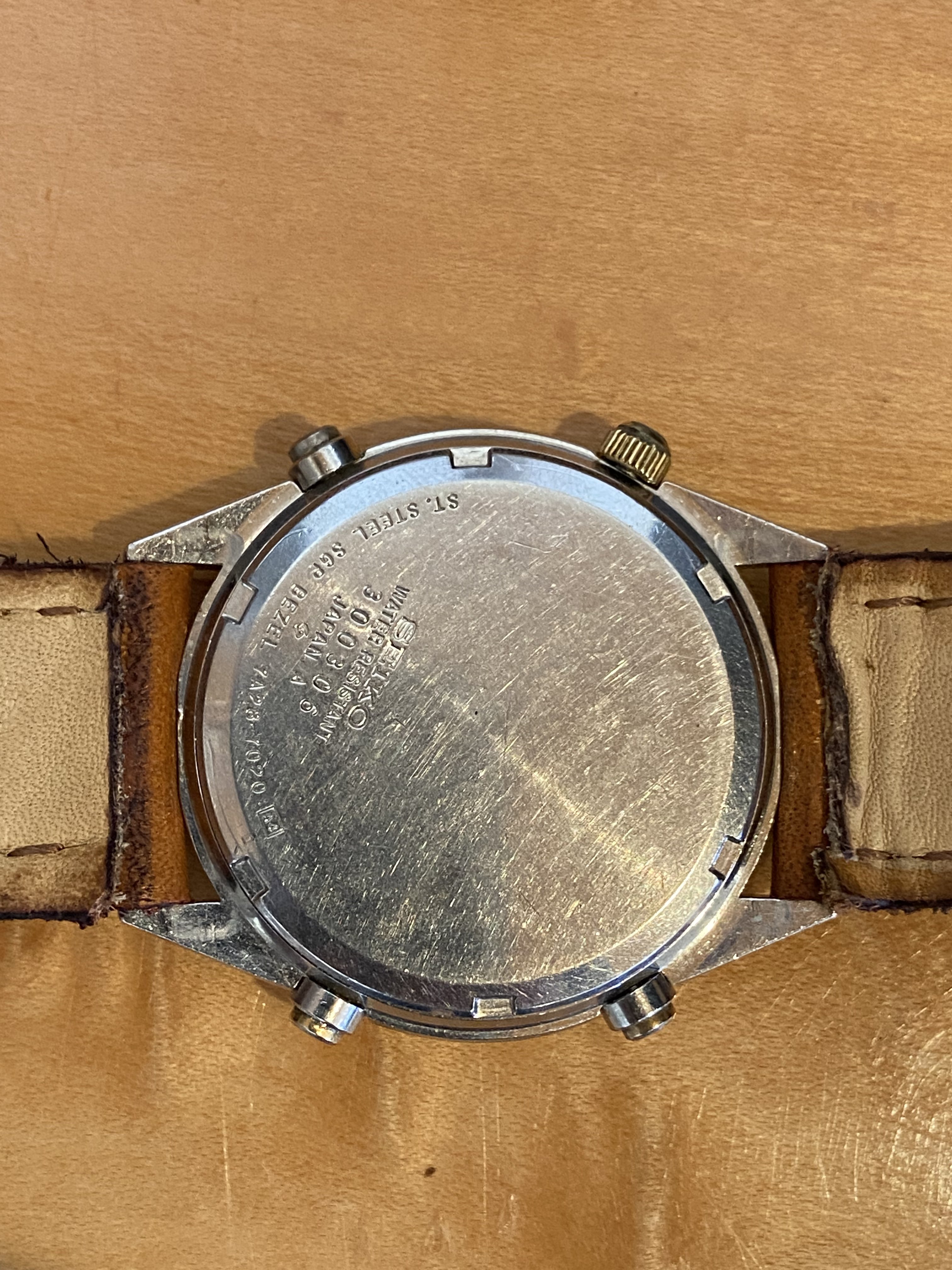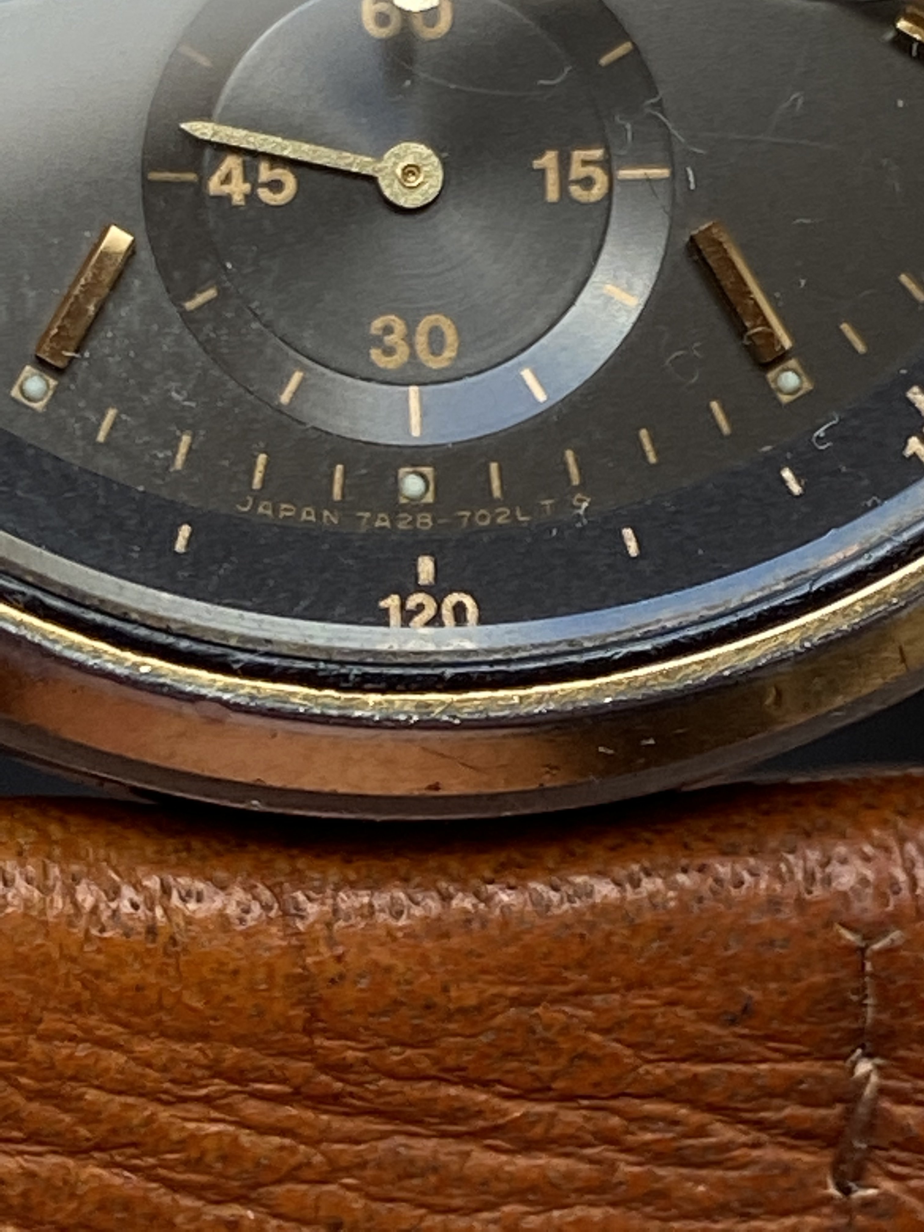 First is a 7A28-7020 also known as the Seiko Speedmaster. 37mm wide, 20mm lug width. A good quartz chronograph that actually has a serviceable movement that a watchmaker can work on if needed. Watch works as it should, new-ish battery (2mths old) resets properly etc. No service history, no recent pressure test, I am confident it needs new gaskets at a minimum but timekeeping and chrono work great. It shows wear especially to the gold plated pushers and bezel where the gold plating is worn away in many spots. Good attractive dial, all lume pips in place and on hands, with nice creamy patina IMO. Not in collectible condition but looks good and wears well. This is the black and gold version of the "Bond" 7A28, the Bond watch from the movie is the all white version.
