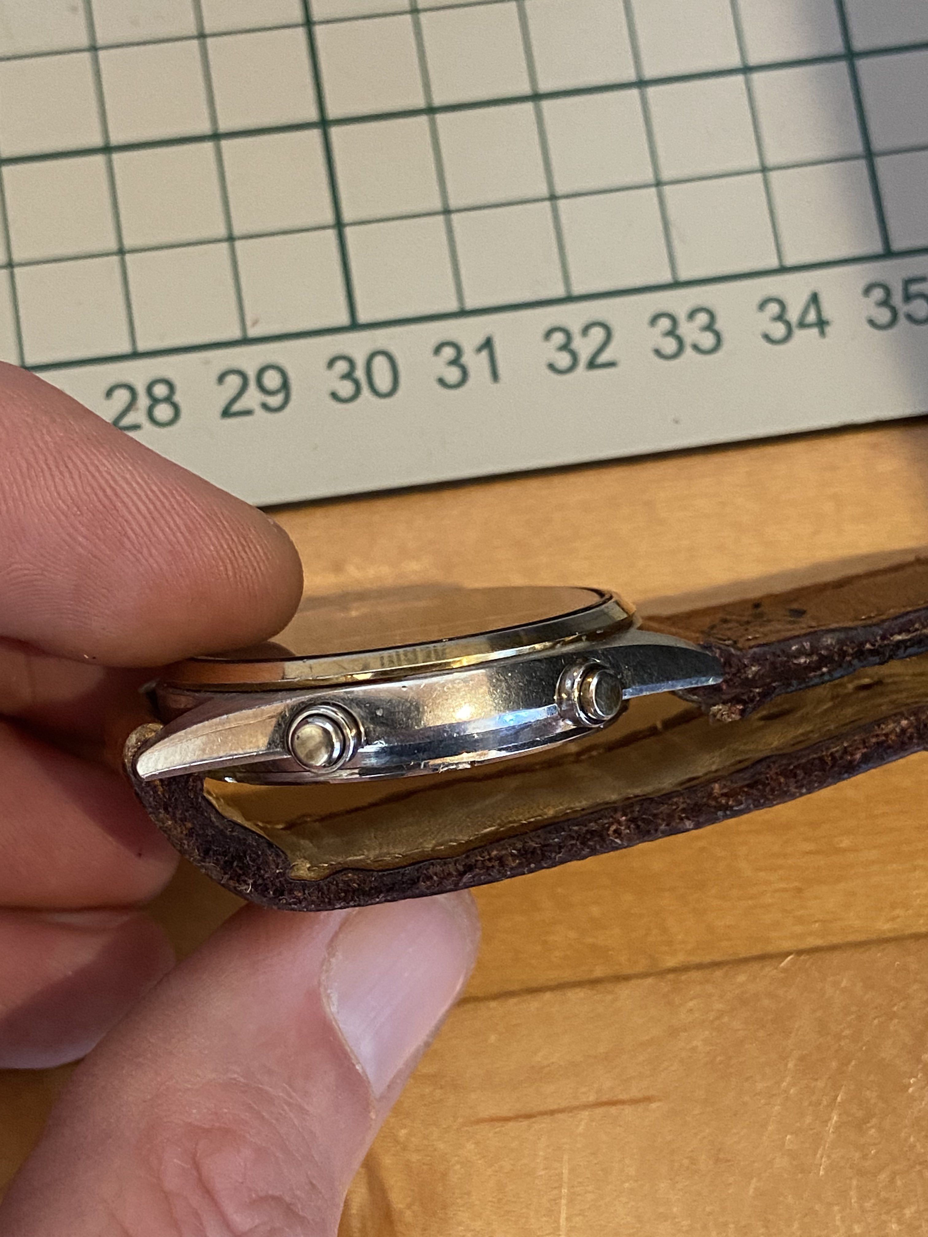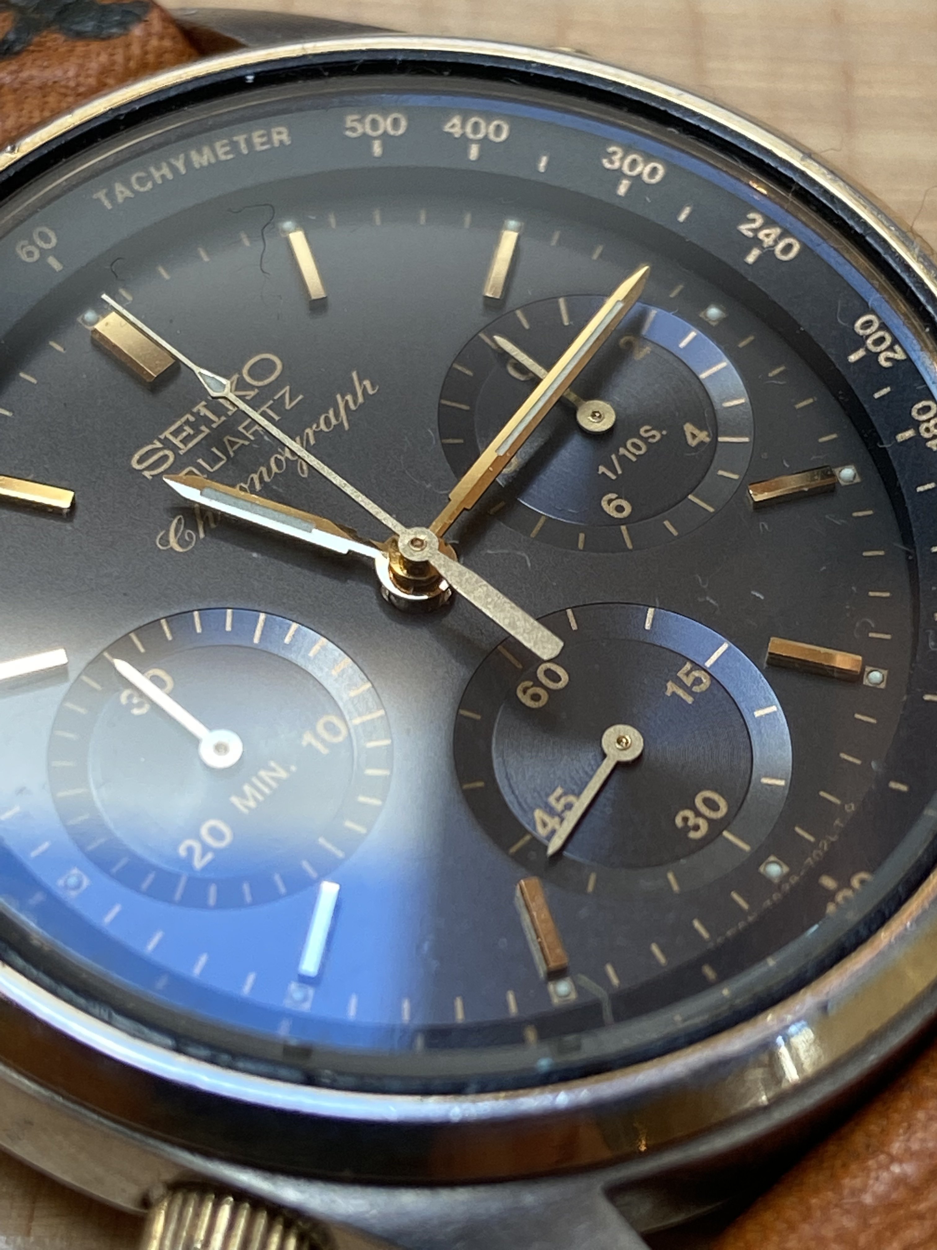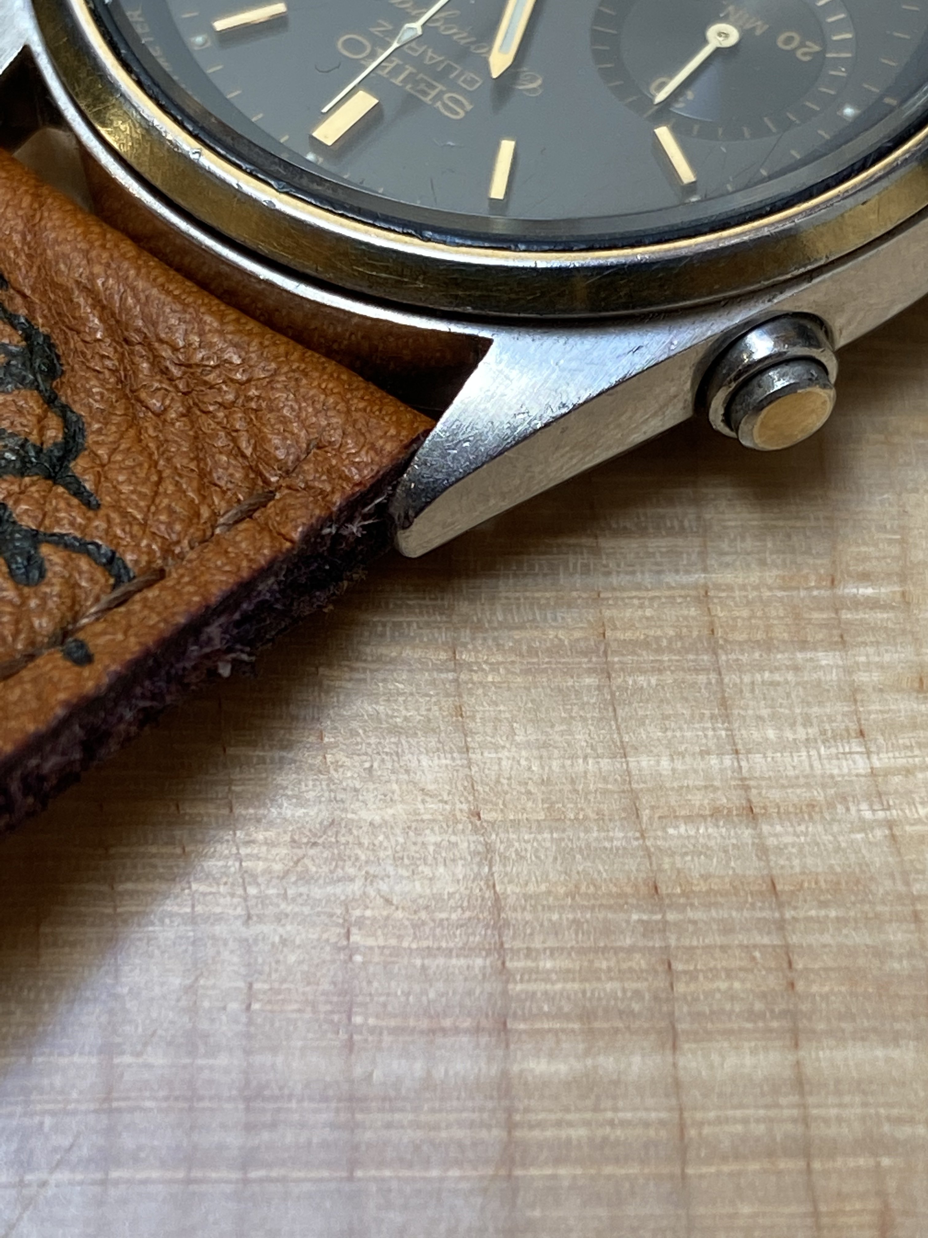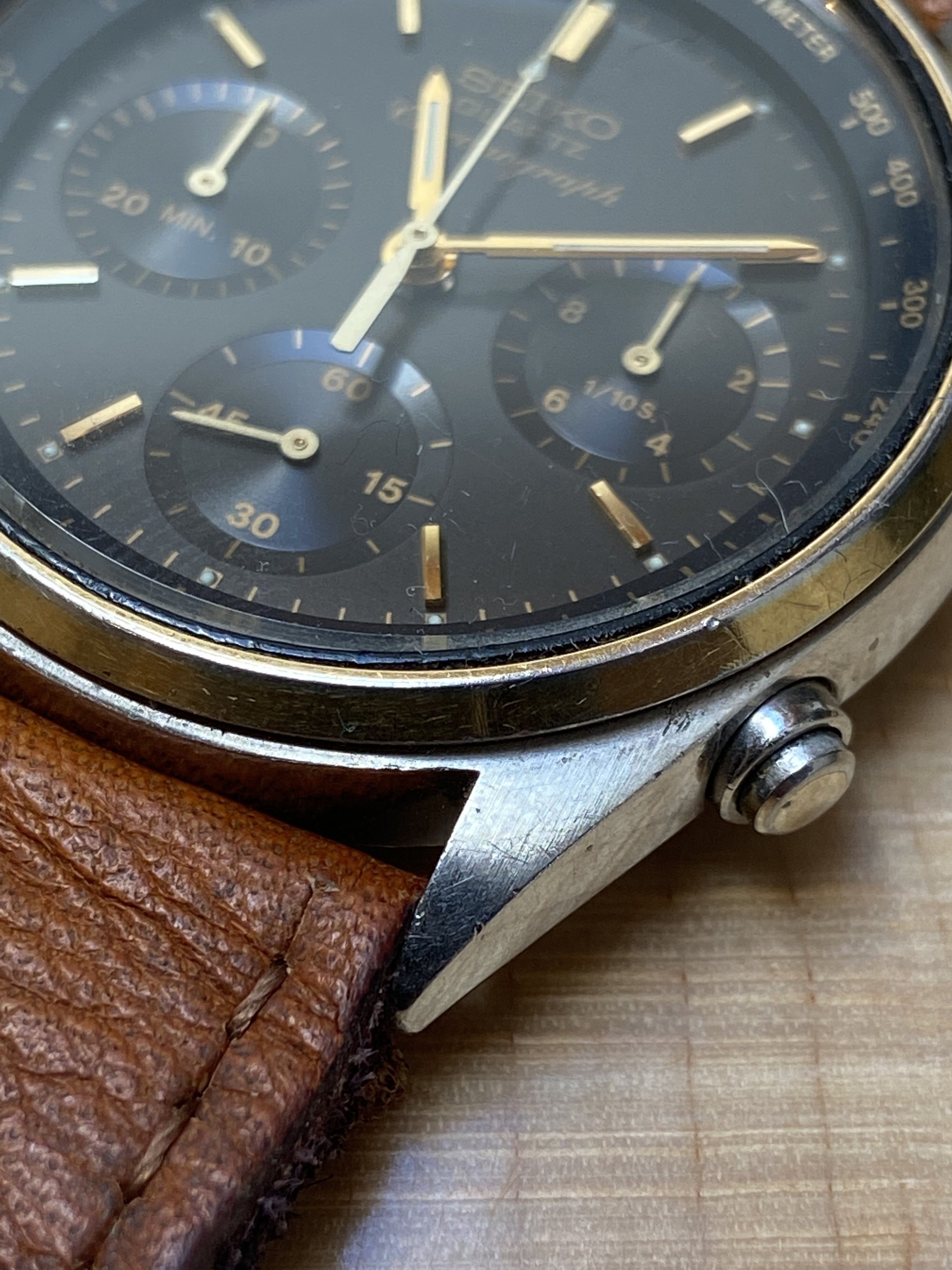 First is a 7A28-7020 also known as the Seiko Speedmaster. 37mm wide, 20mm lug width. A good quartz chronograph that actually has a serviceable movement that a watchmaker can work on if needed. Watch works as it should, new-ish battery (2mths old) resets properly etc. No service history, no recent pressure test, I am confident it needs new gaskets at a minimum but timekeeping and chrono work great. It shows wear especially to the gold plated pushers and bezel where the gold plating is worn away in many spots. Good attractive dial, all lume pips in place and on hands, with nice creamy patina IMO. Not in collectible condition but looks good and wears well. This is the black and gold version of the "Bond" 7A28, the Bond watch from the movie is the all white version.