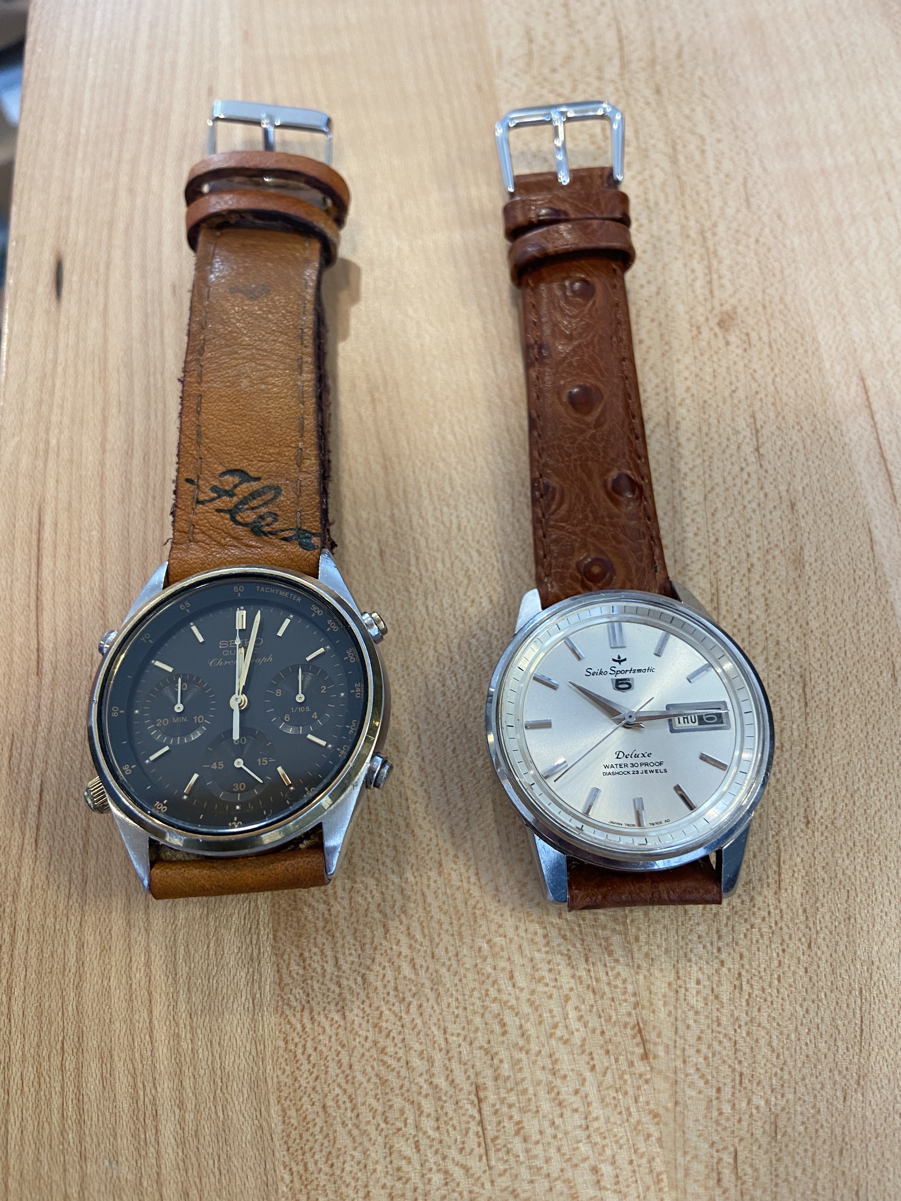 Both come on the straps pictured; a new unworn ostrich-style for the dress and a well worn baseball leather strap on the 7a28. Neither watch is in "collector condition" but neither are dogs either. The 7A28 shows its age but the Seiko 5 is pretty sharp. Either way a fun pair to wear or a gift for that budding watch enthusiast (or two) in your life.