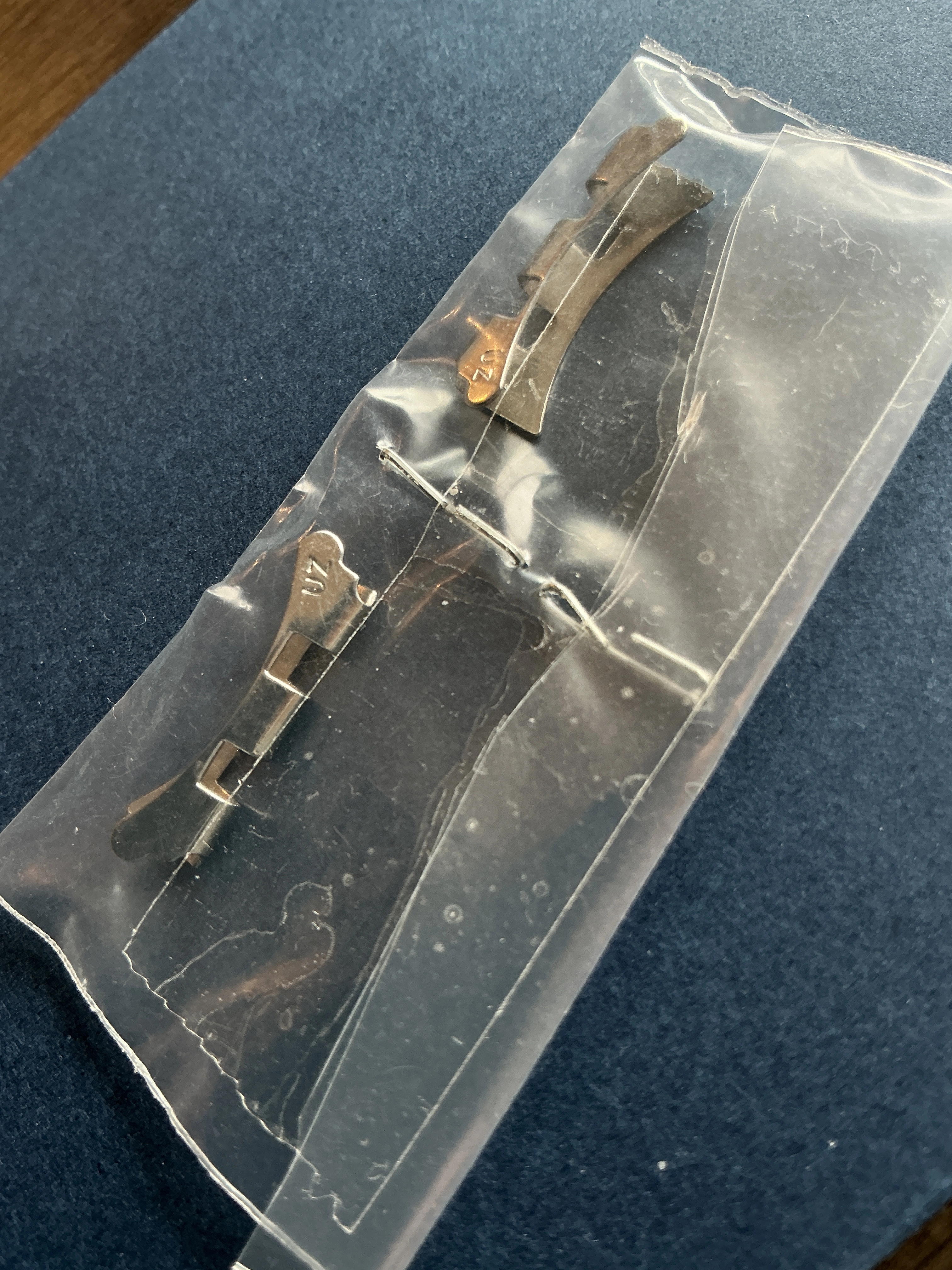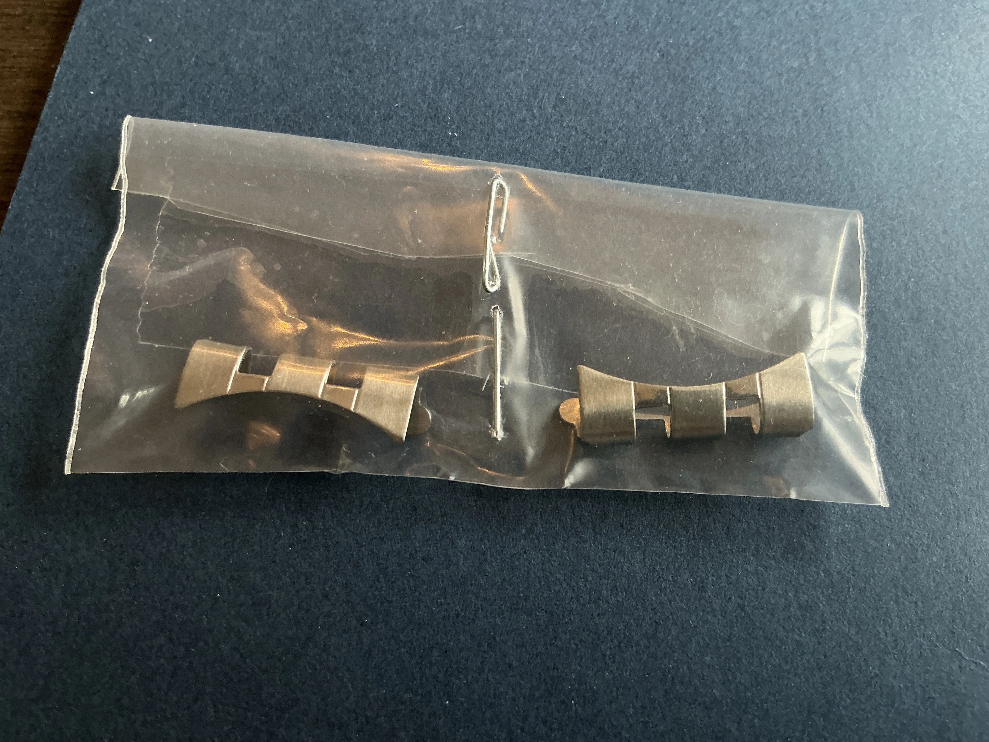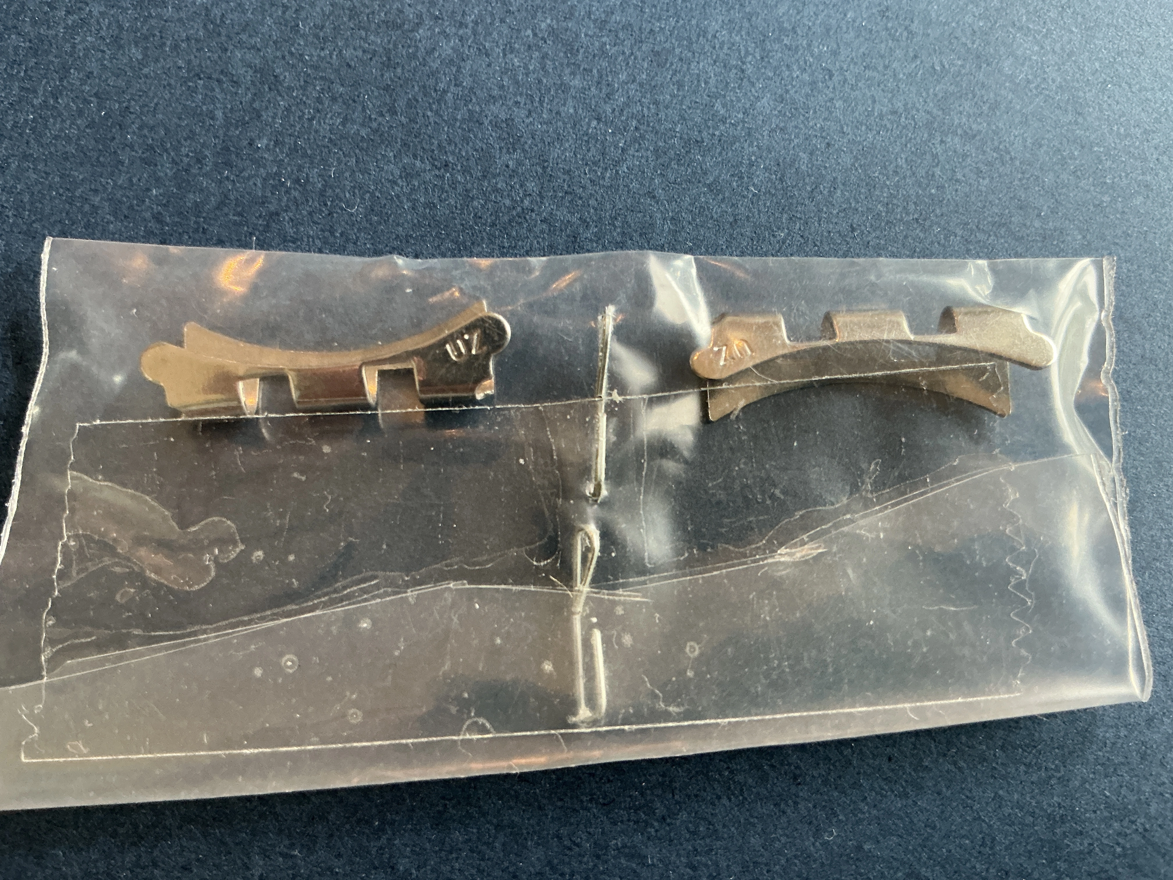 ·| Incredibly rare, brand new and unworn pair of “UZ” stamped end links for Universal Geneve Gay Freres bracelet. Will fit the lugs of any 19mm Universal Geneve (measurement of the endlinks is about 18.8mm wide), from Polerouters to 1960s Tri-Compax and Ninas (note: fit to the curvature of the case will vary among various models, of course). Please feel free to ask any questions, as all sales are final. I’ll pick up the cost of any domestic shipping in the USA. Cost of any international shipping to be discussed with buyer. |