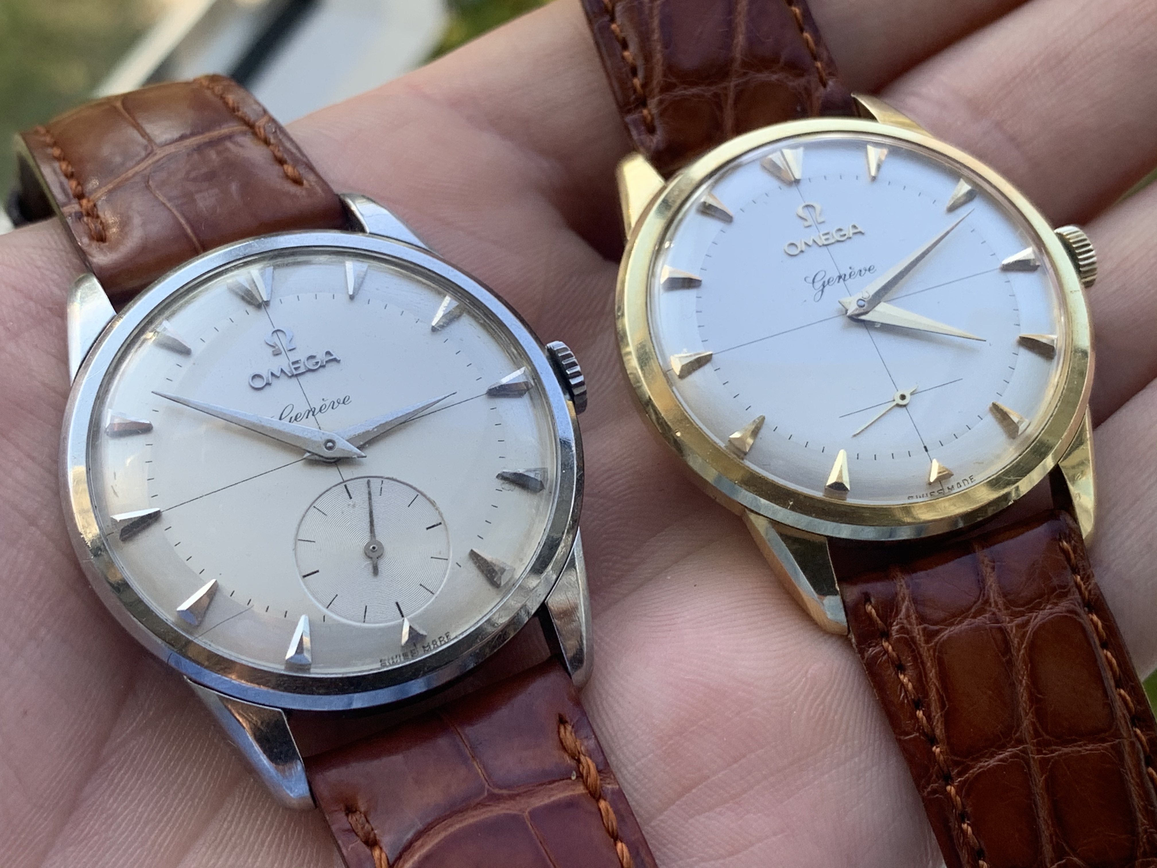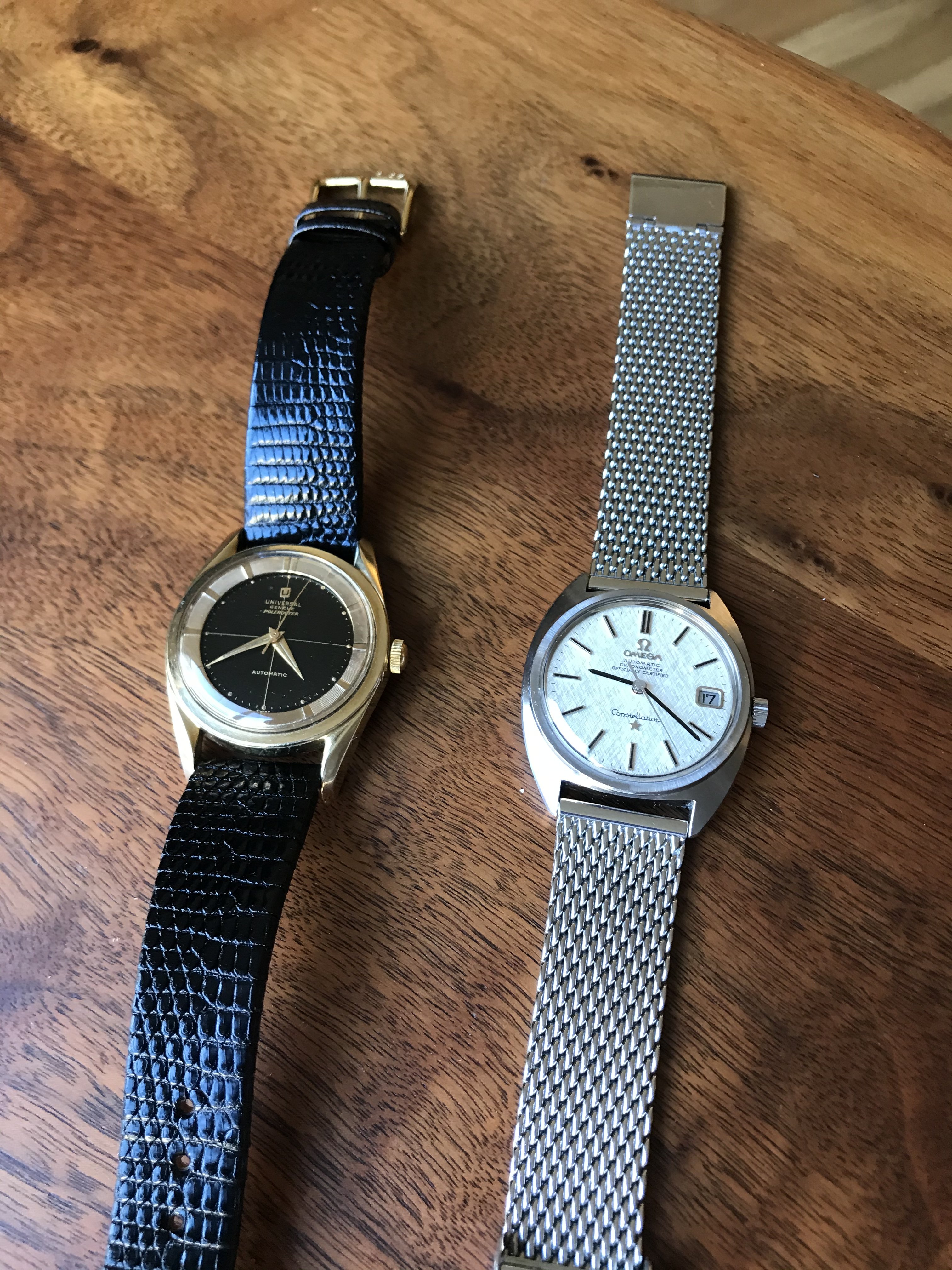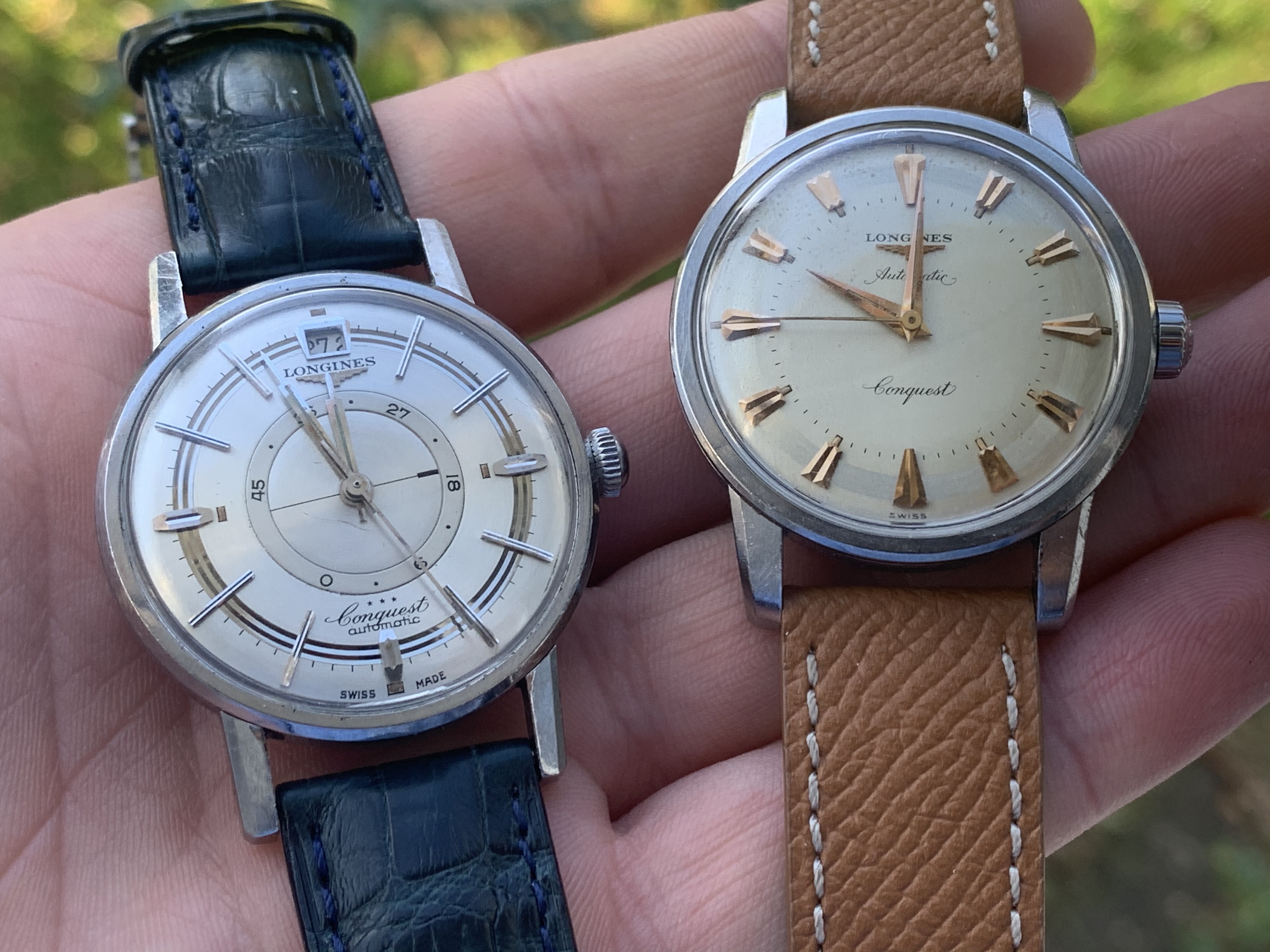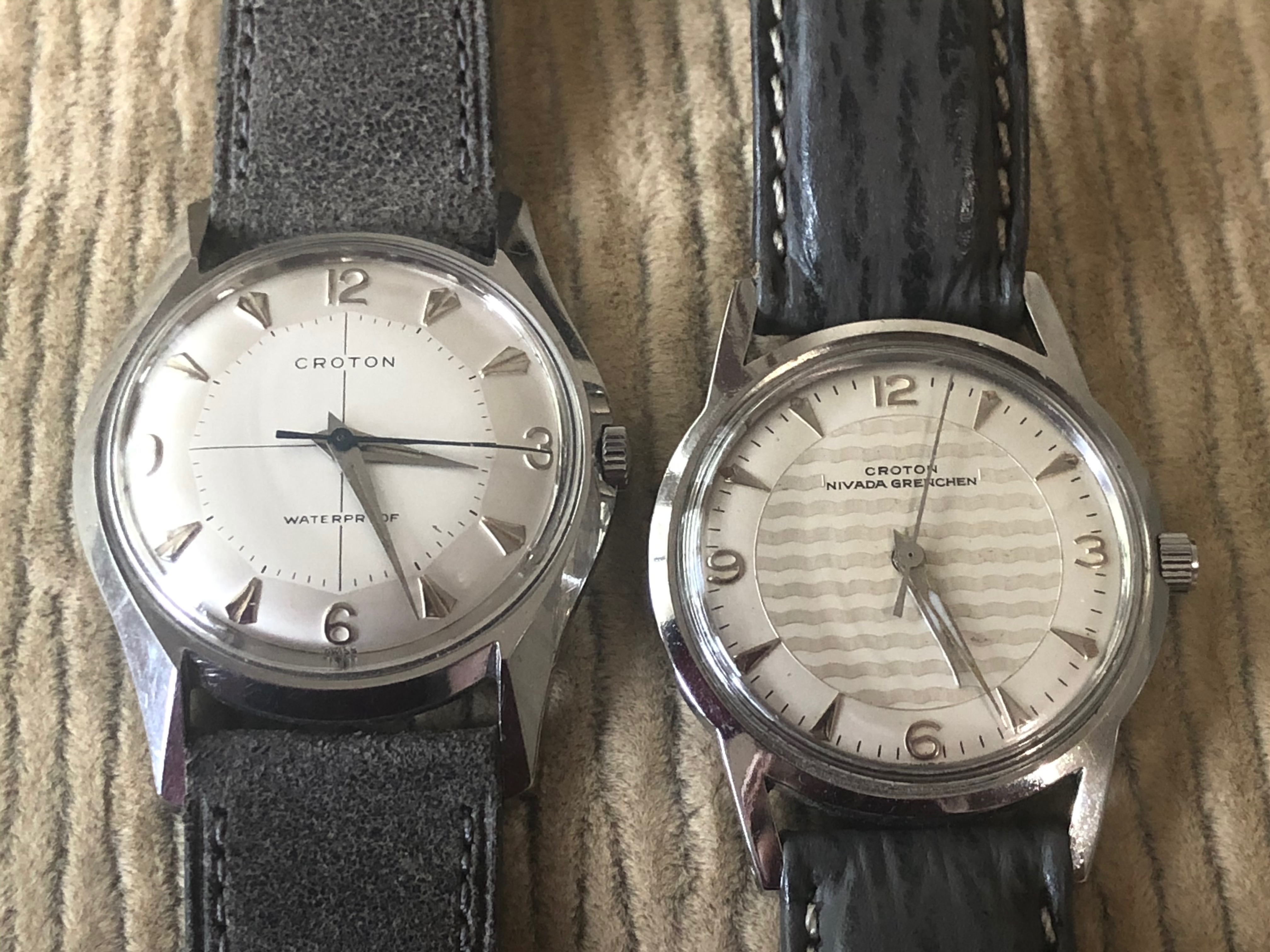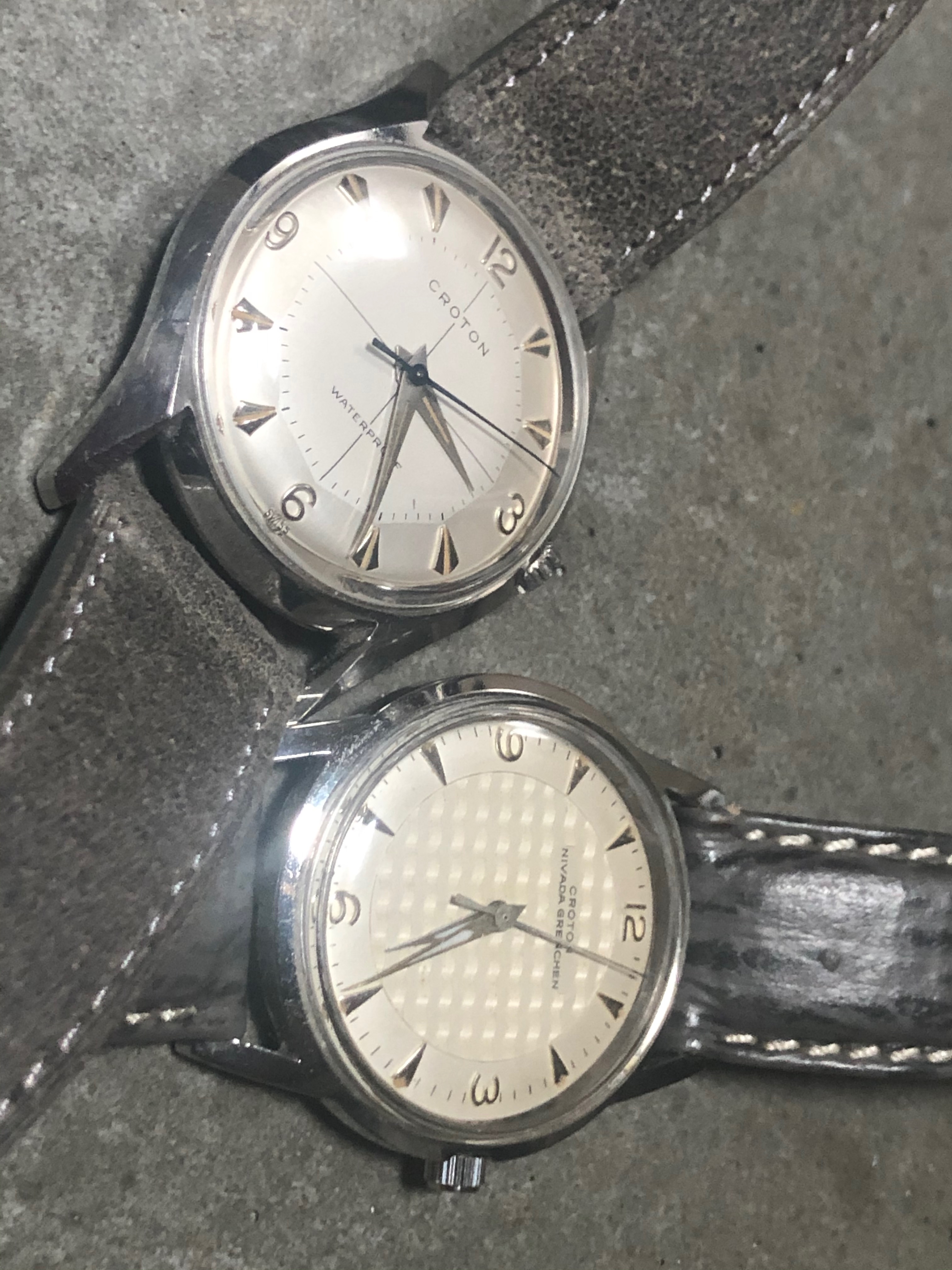 A pair of Croton/Nivada Grenchen watches. Two of my favorites. Manual wind. No date. Strap them on, set the time, and go! Look good with a variety of straps, but I have settled on liking these: