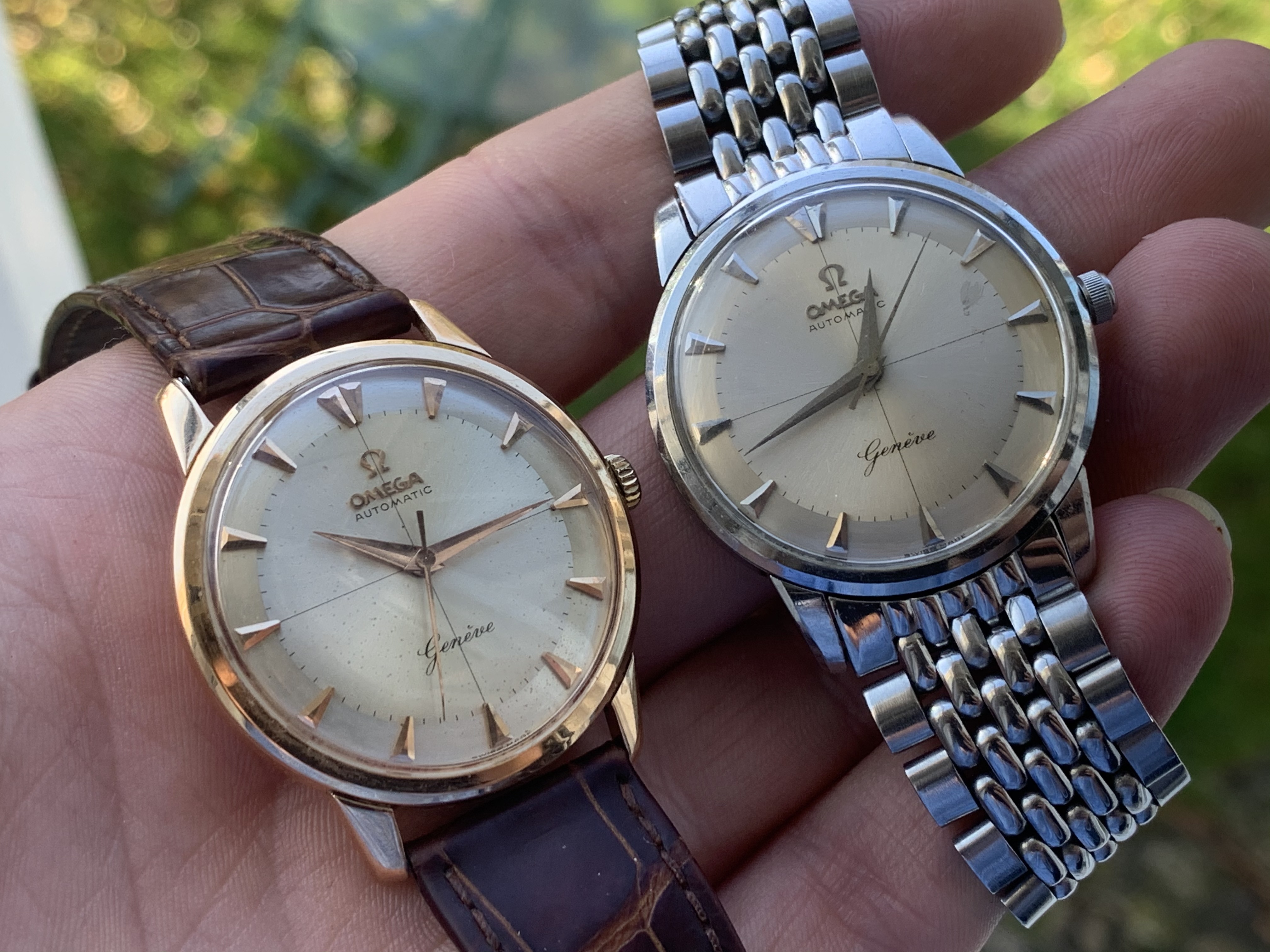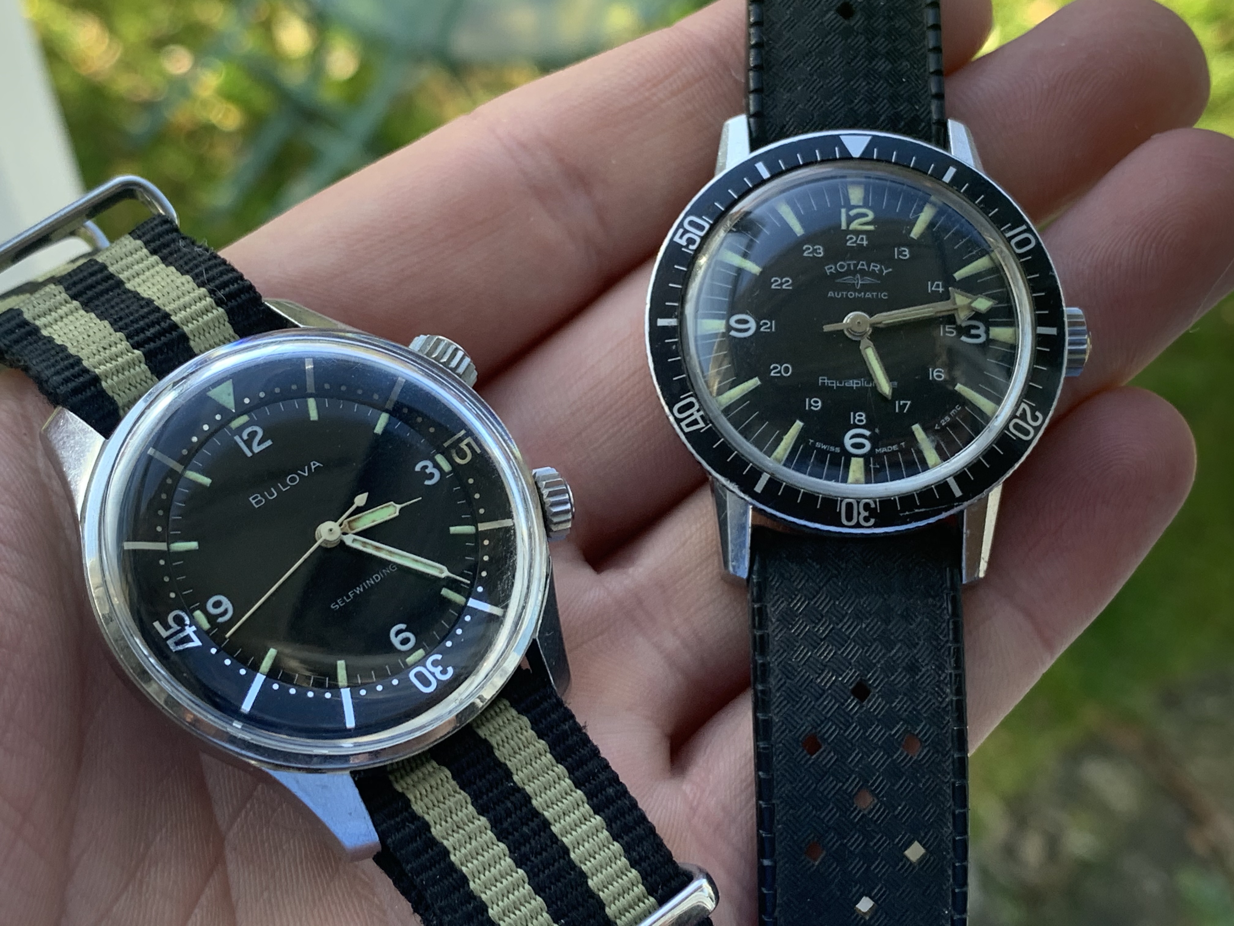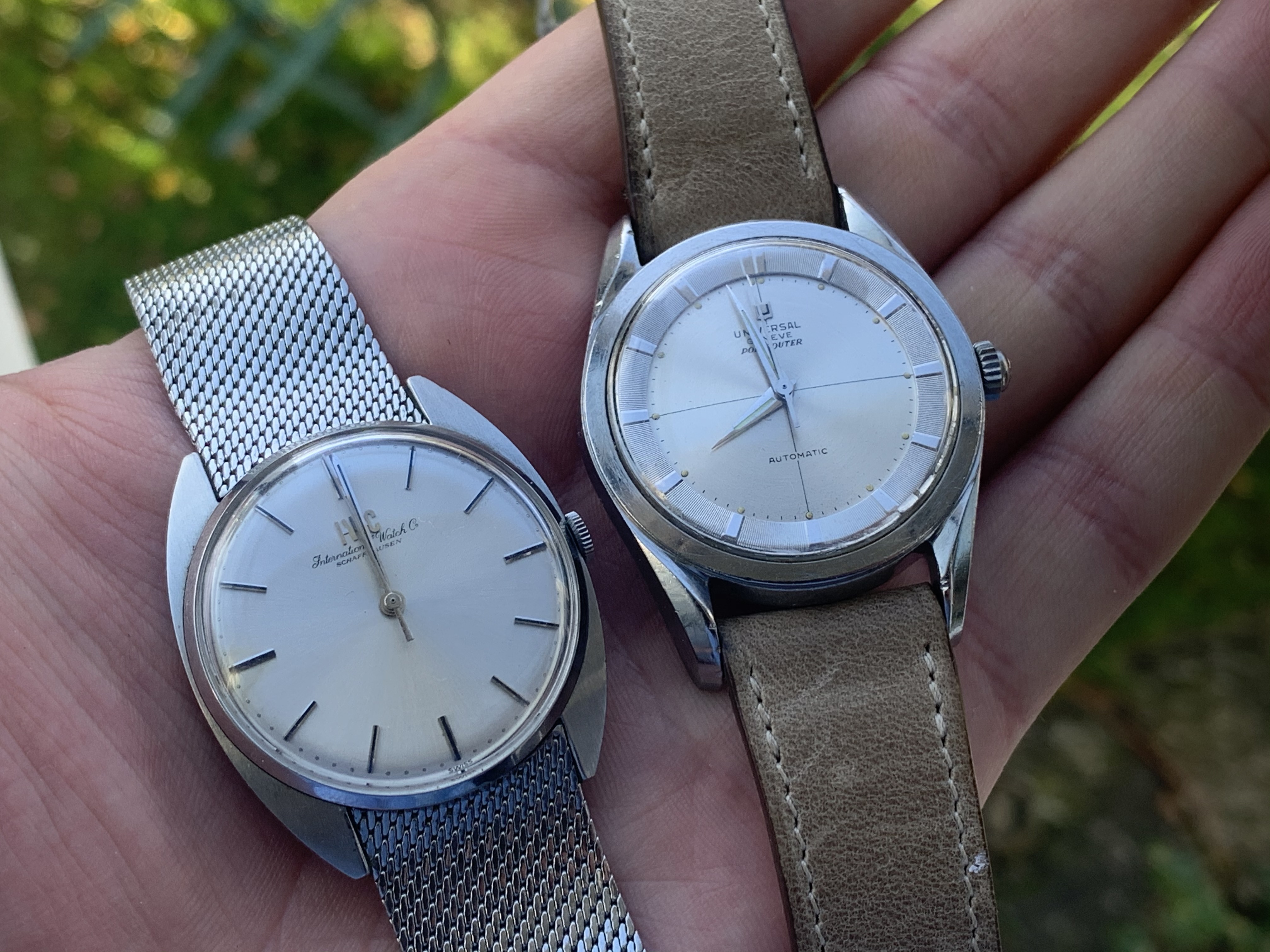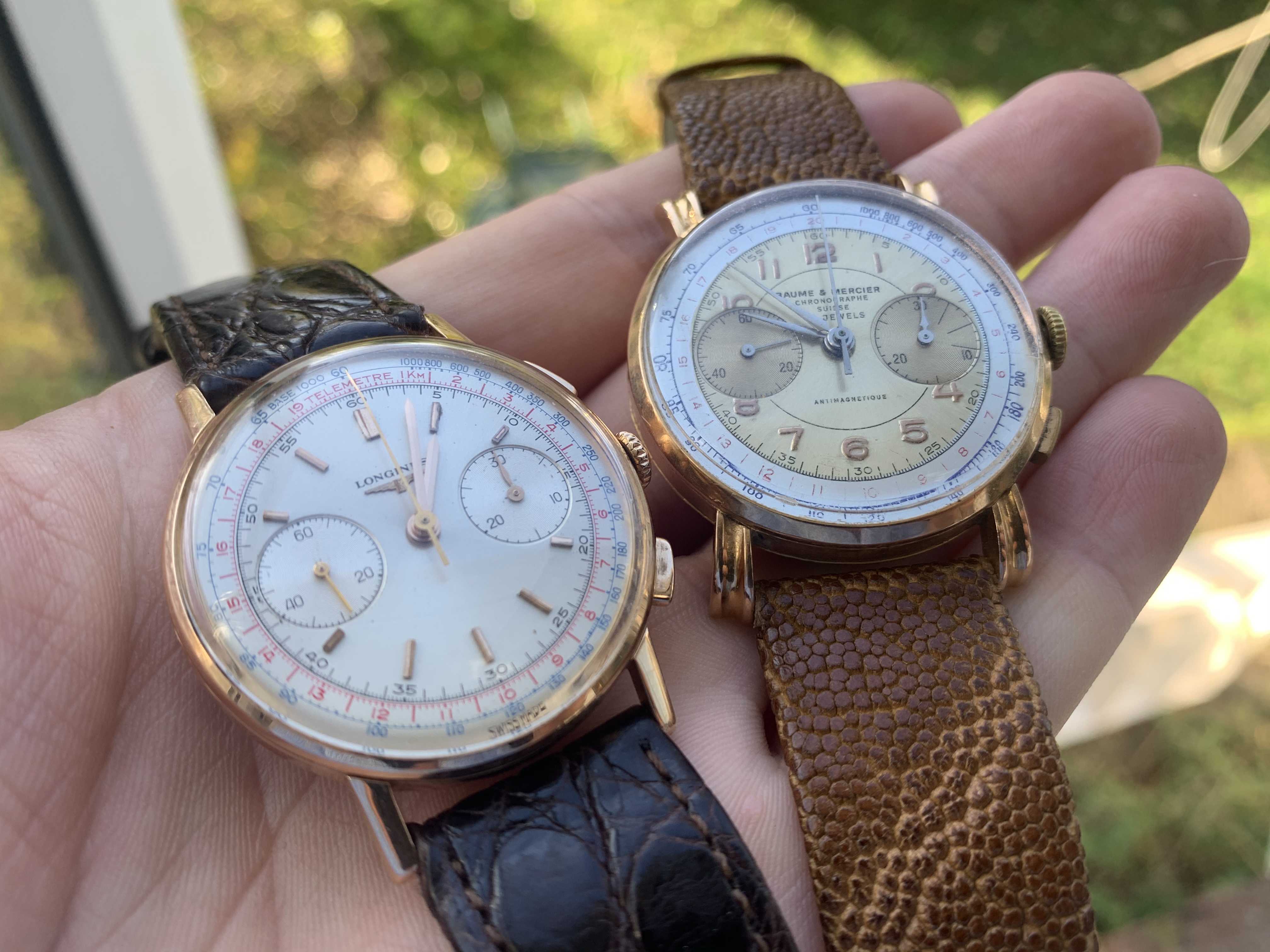 A pair of Croton/Nivada Grenchen watches. Two of my favorites. Manual wind. No date. Strap them on, set the time, and go! Look good with a variety of straps, but I have settled on liking these: