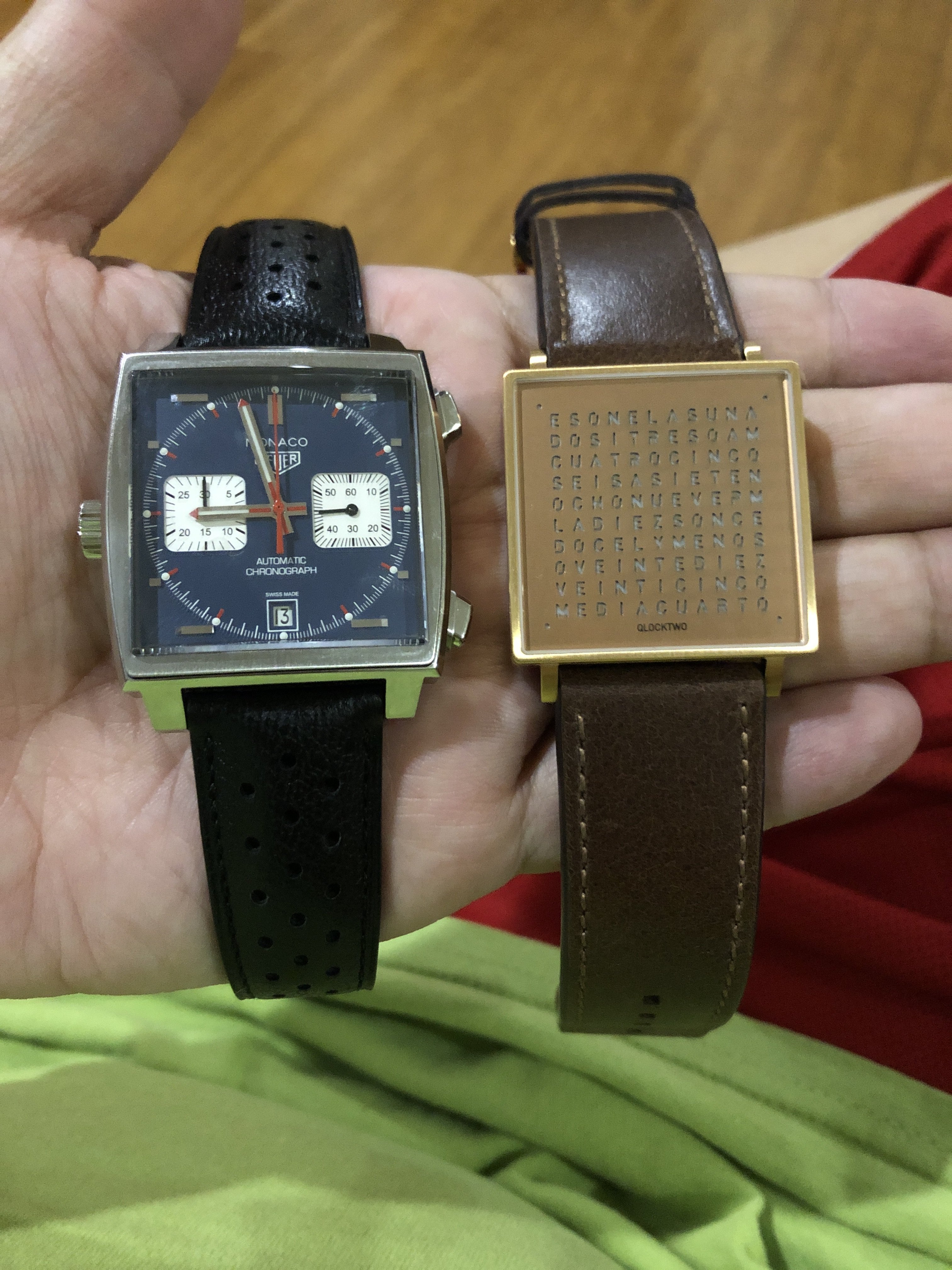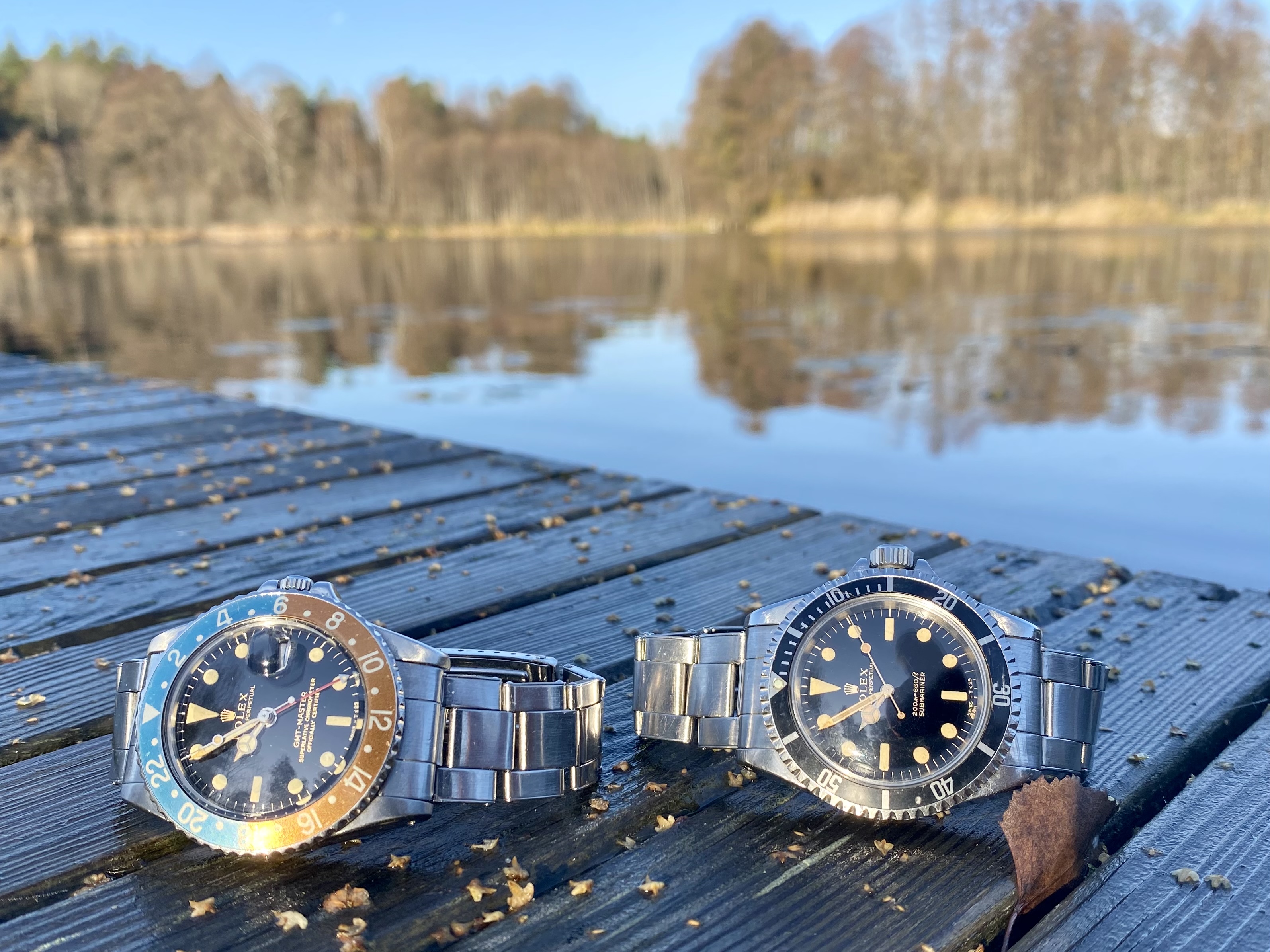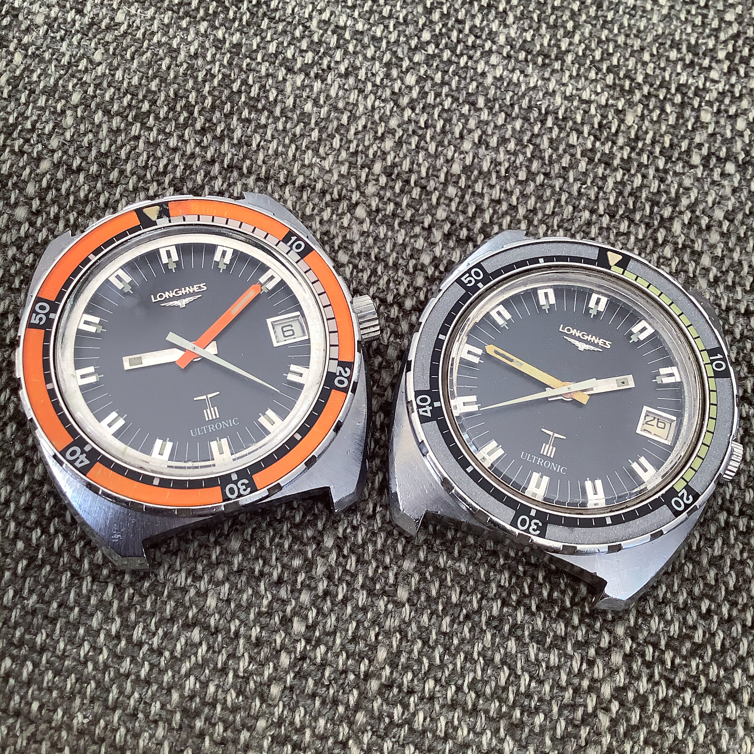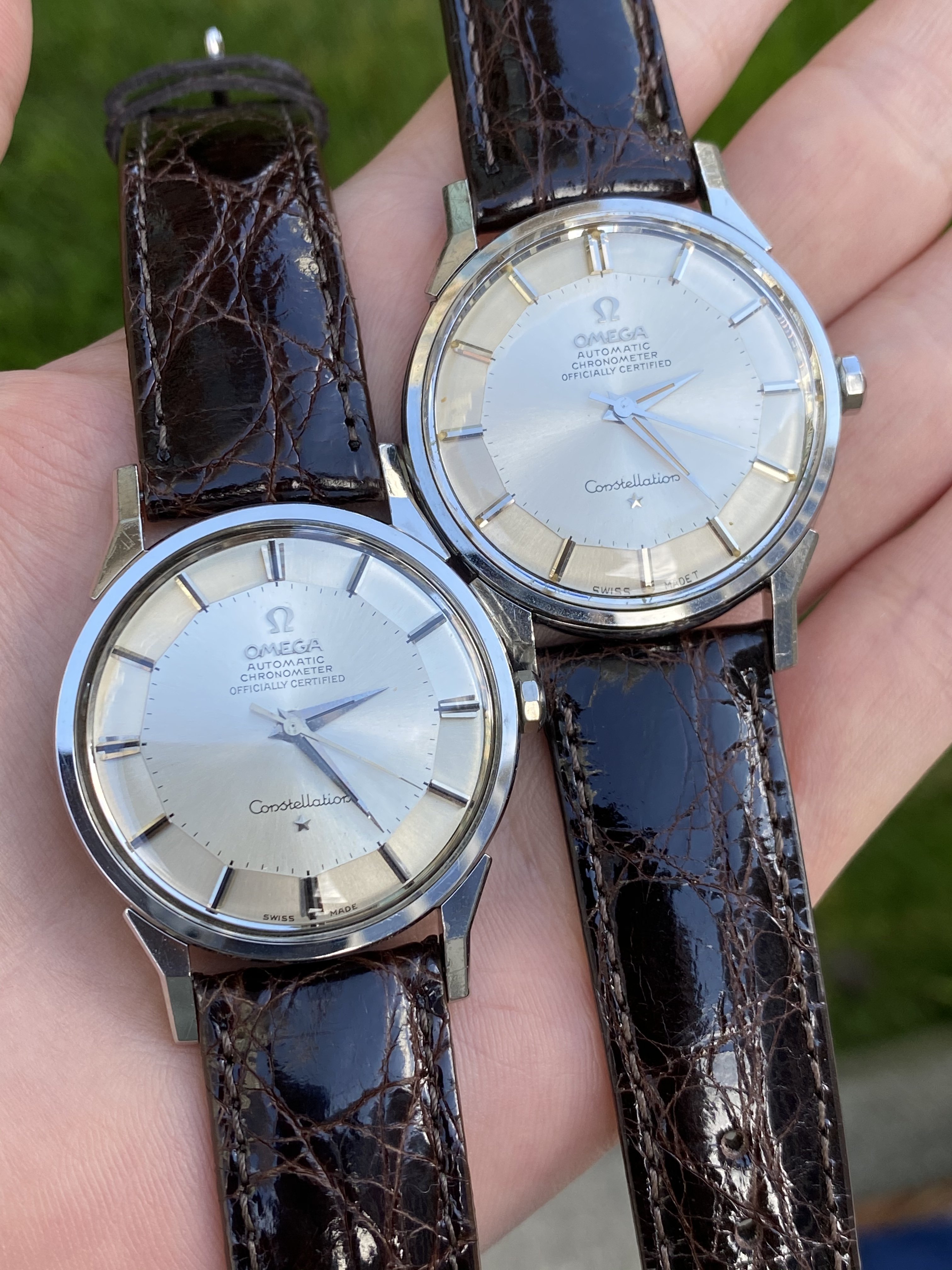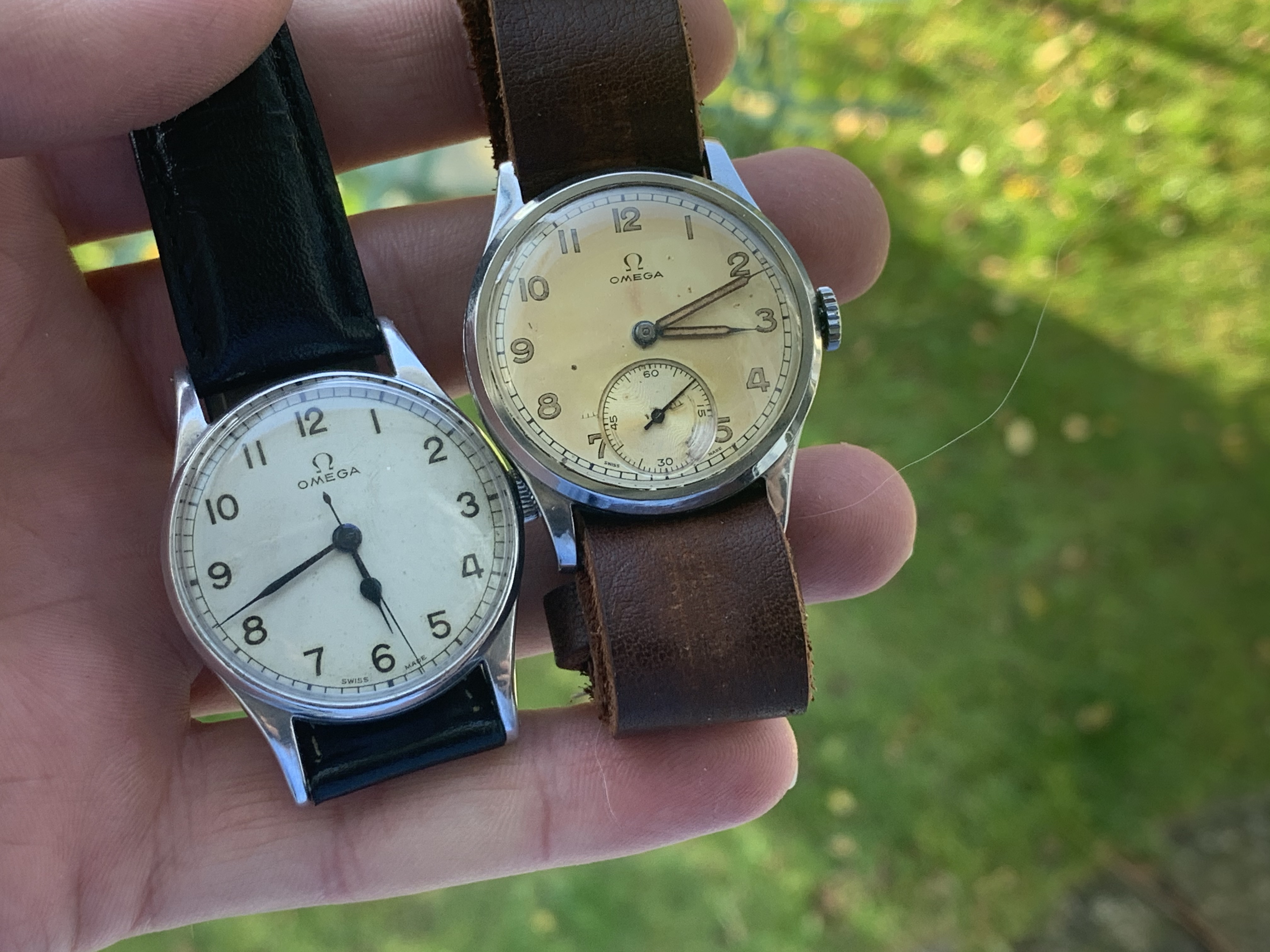 A pair of Croton/Nivada Grenchen watches. Two of my favorites. Manual wind. No date. Strap them on, set the time, and go! Look good with a variety of straps, but I have settled on liking these: