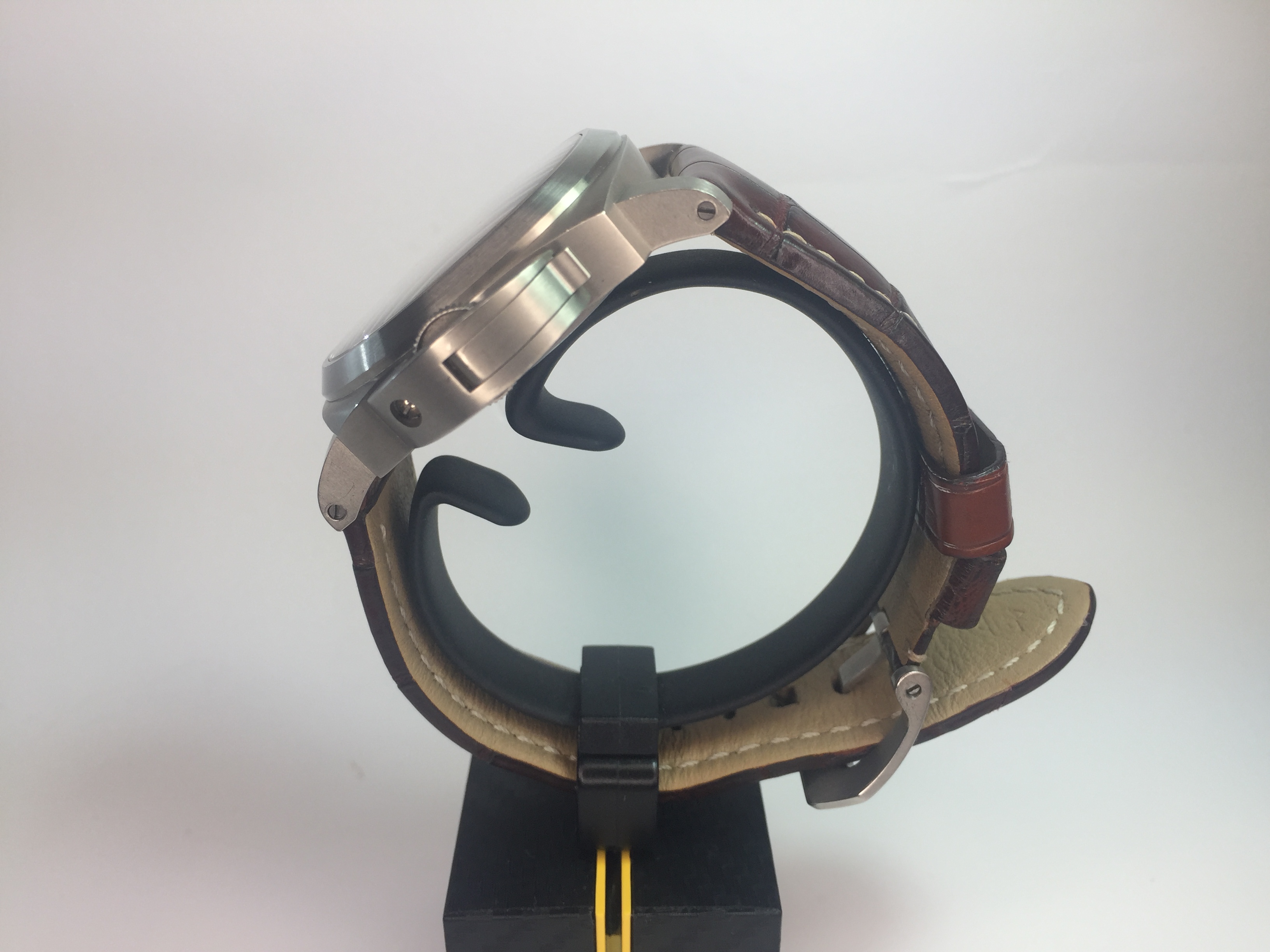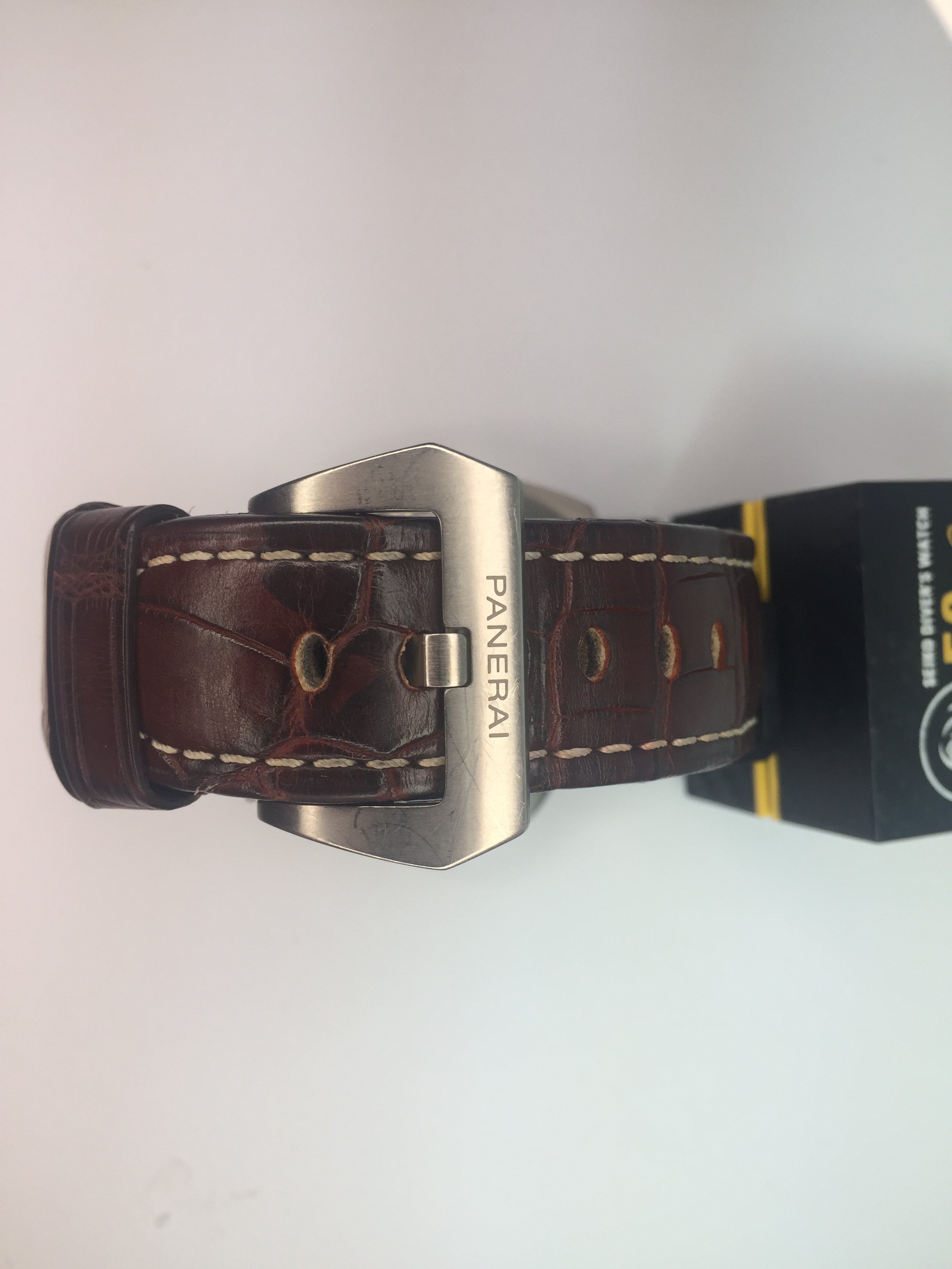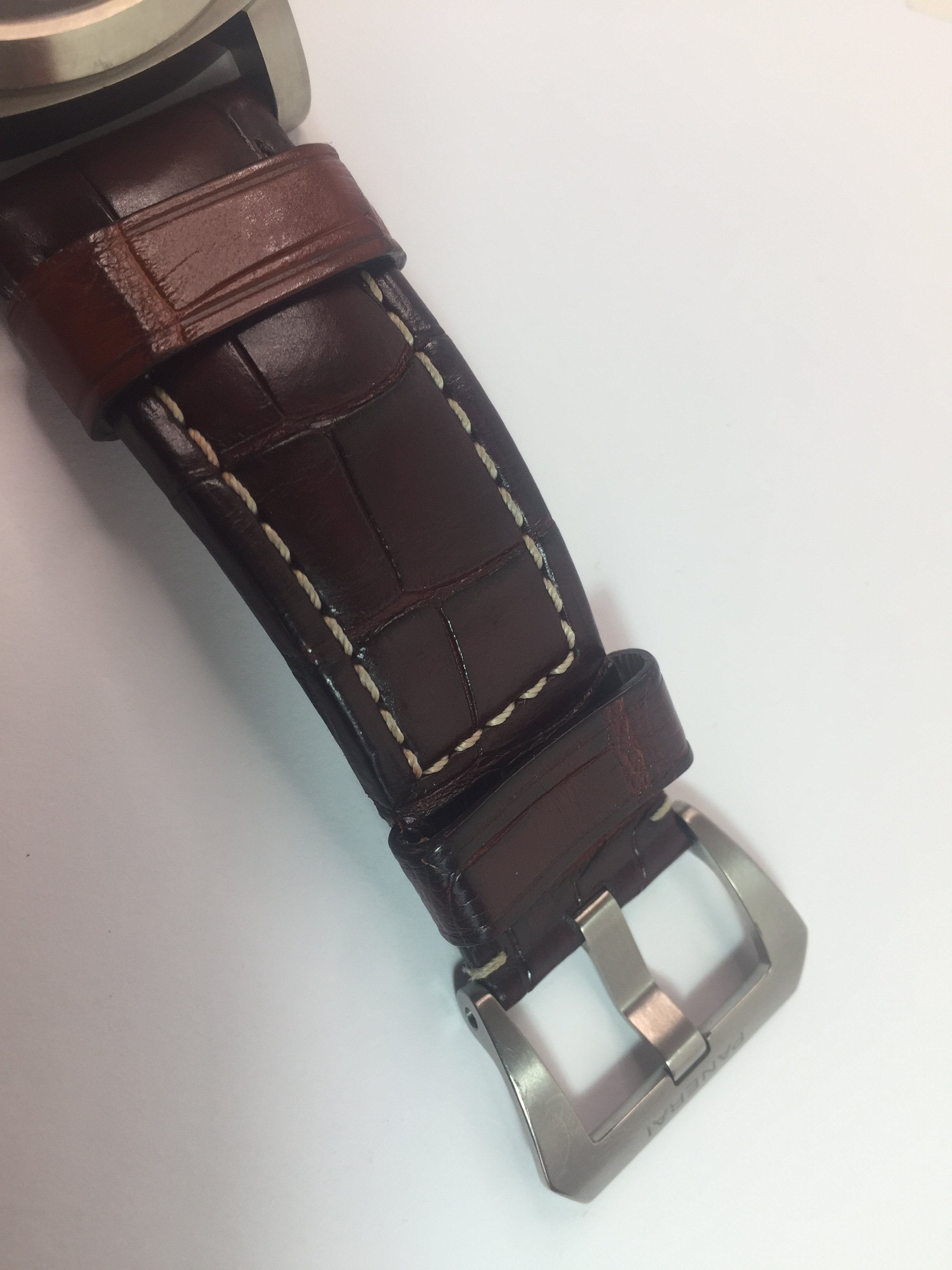 Panerai dark brown alligator strap with ecru stitching and brushed titanium pin buckle