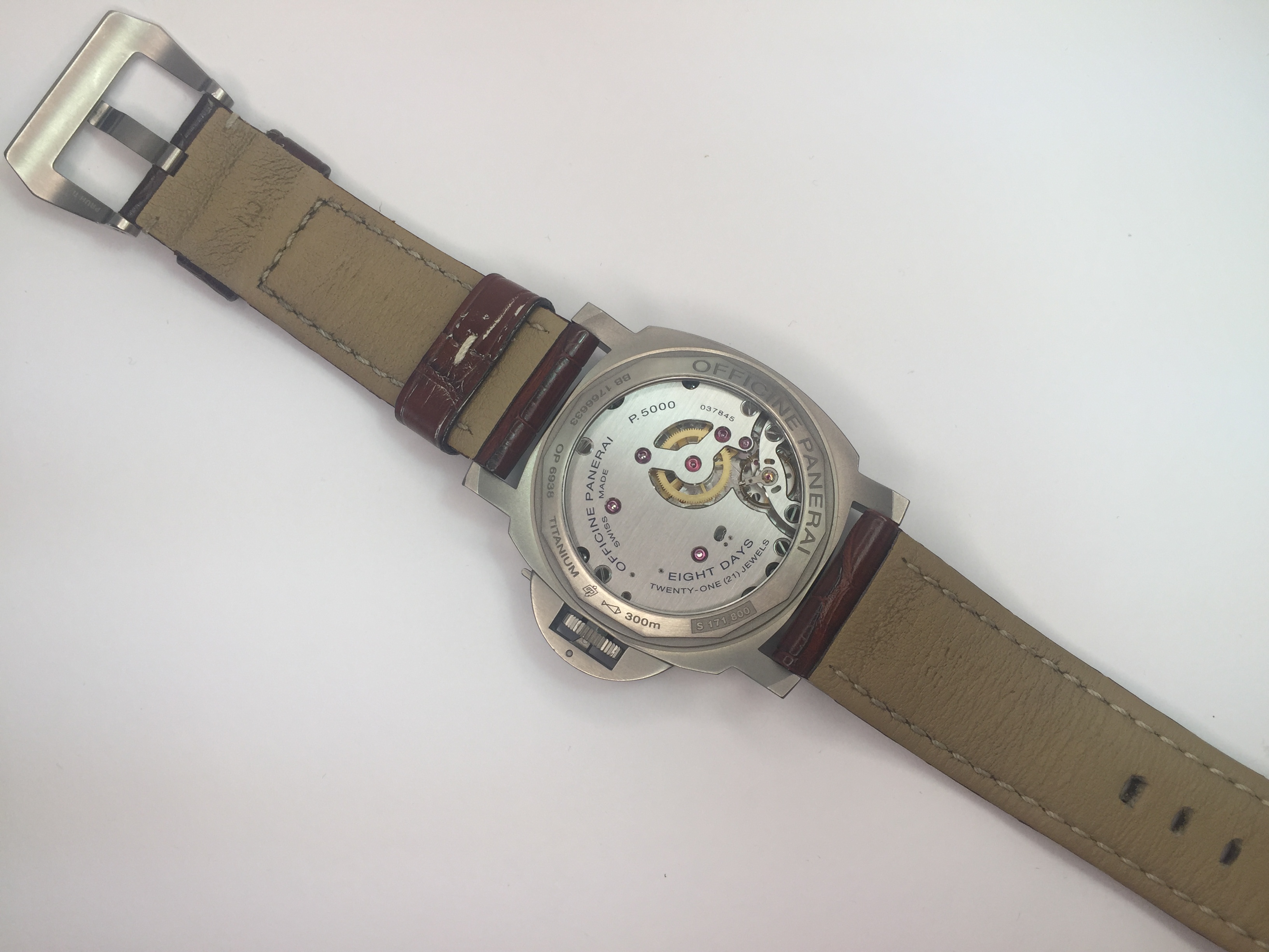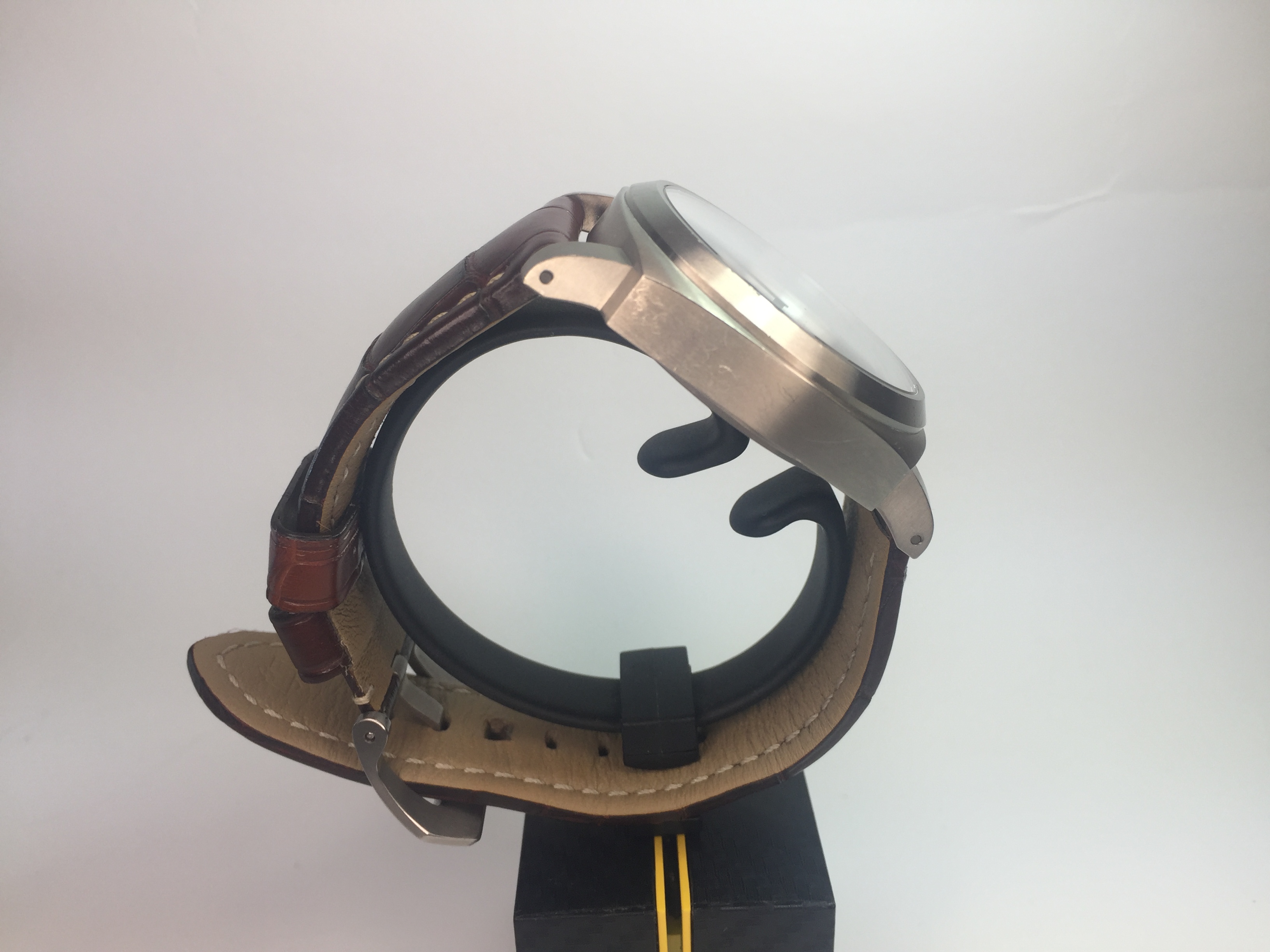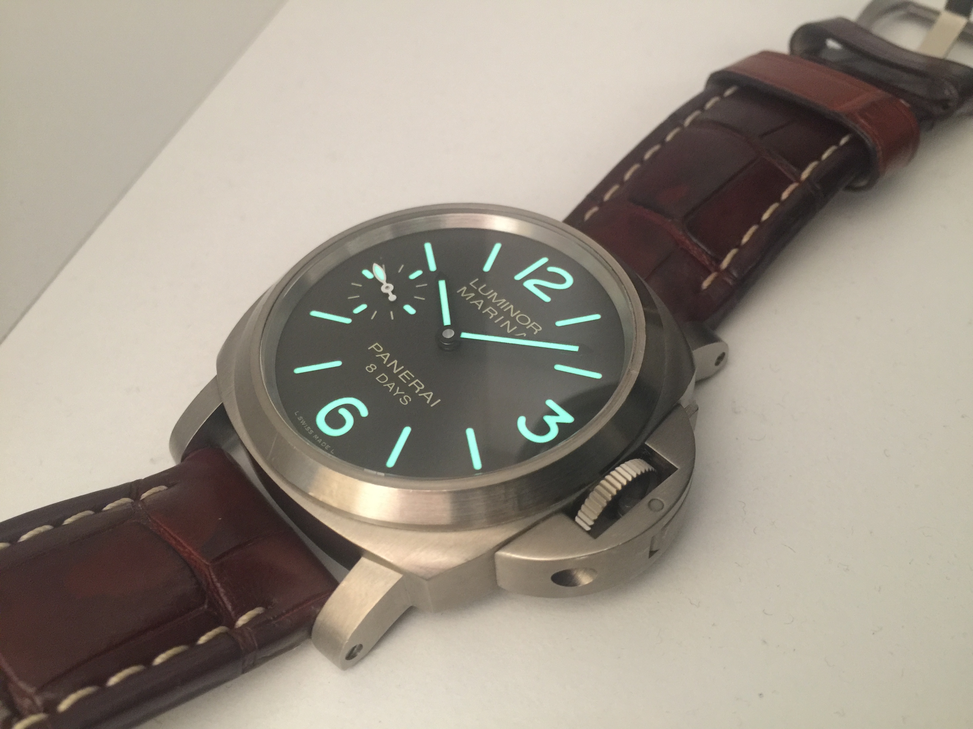 Panerai dark brown alligator strap with ecru stitching and brushed titanium pin buckle