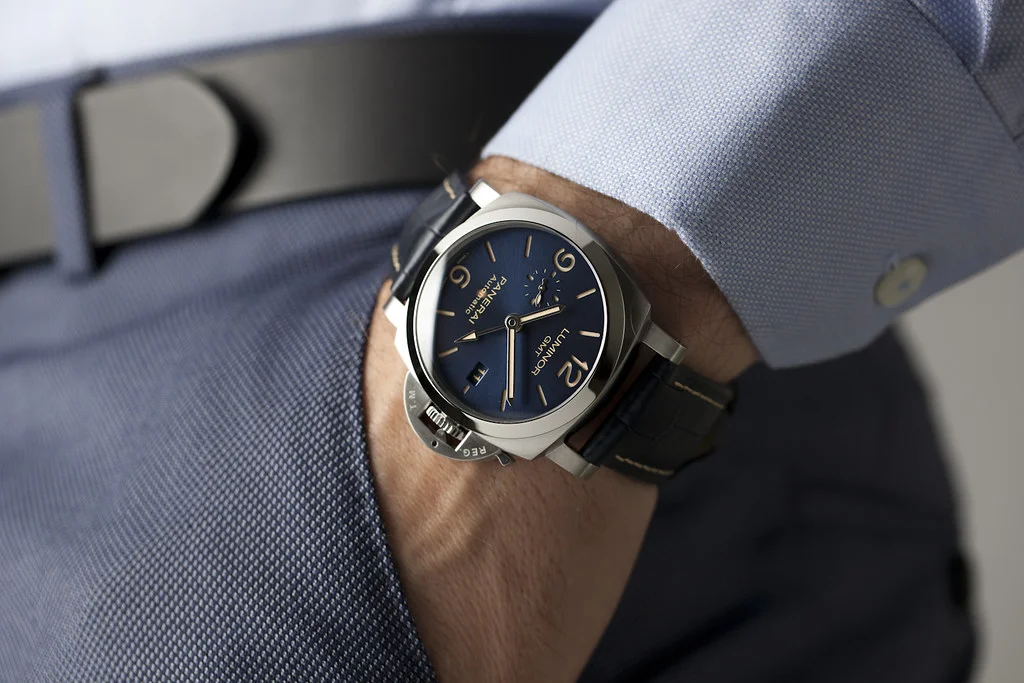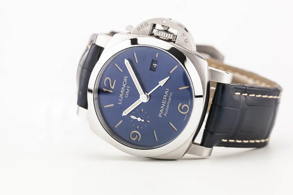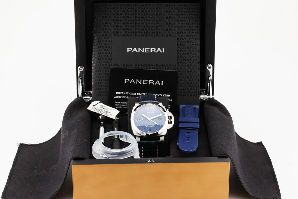 ·Up for sale is an excellent condition Panerai Luminor GMT 44mm Blue Sun Brushed Dial, reference # PAM01033. It comes complete with all boxes, papers, booklets, tools, rubber strap and Panerai Warranty Card dated March 2022.